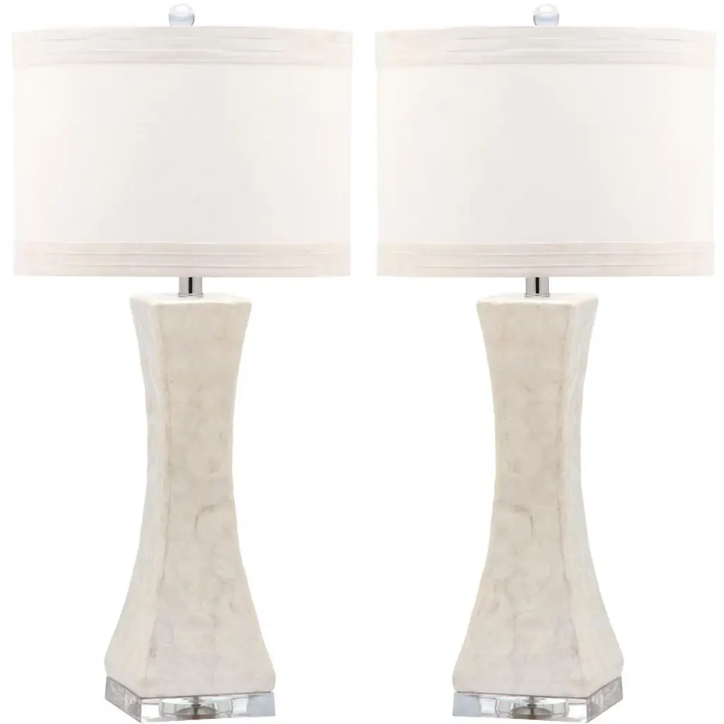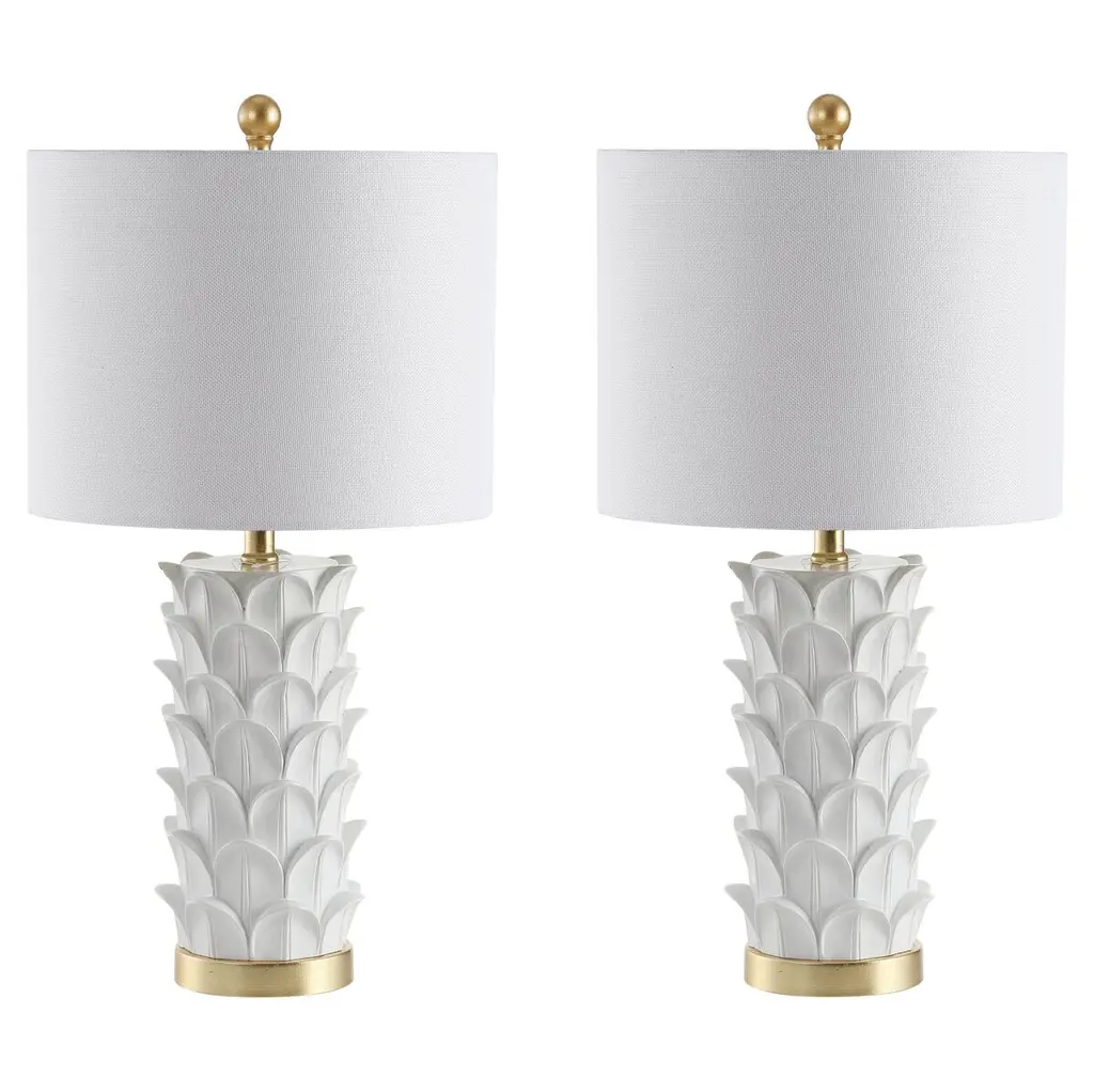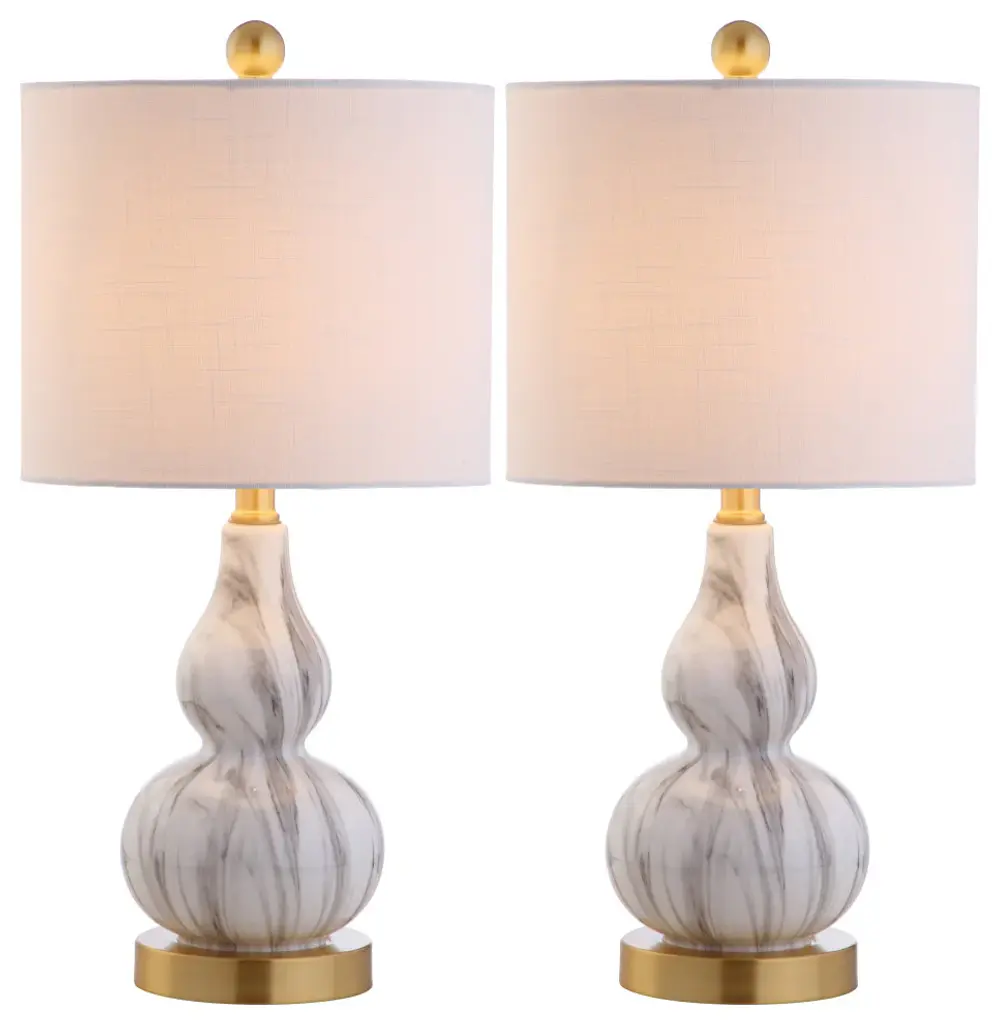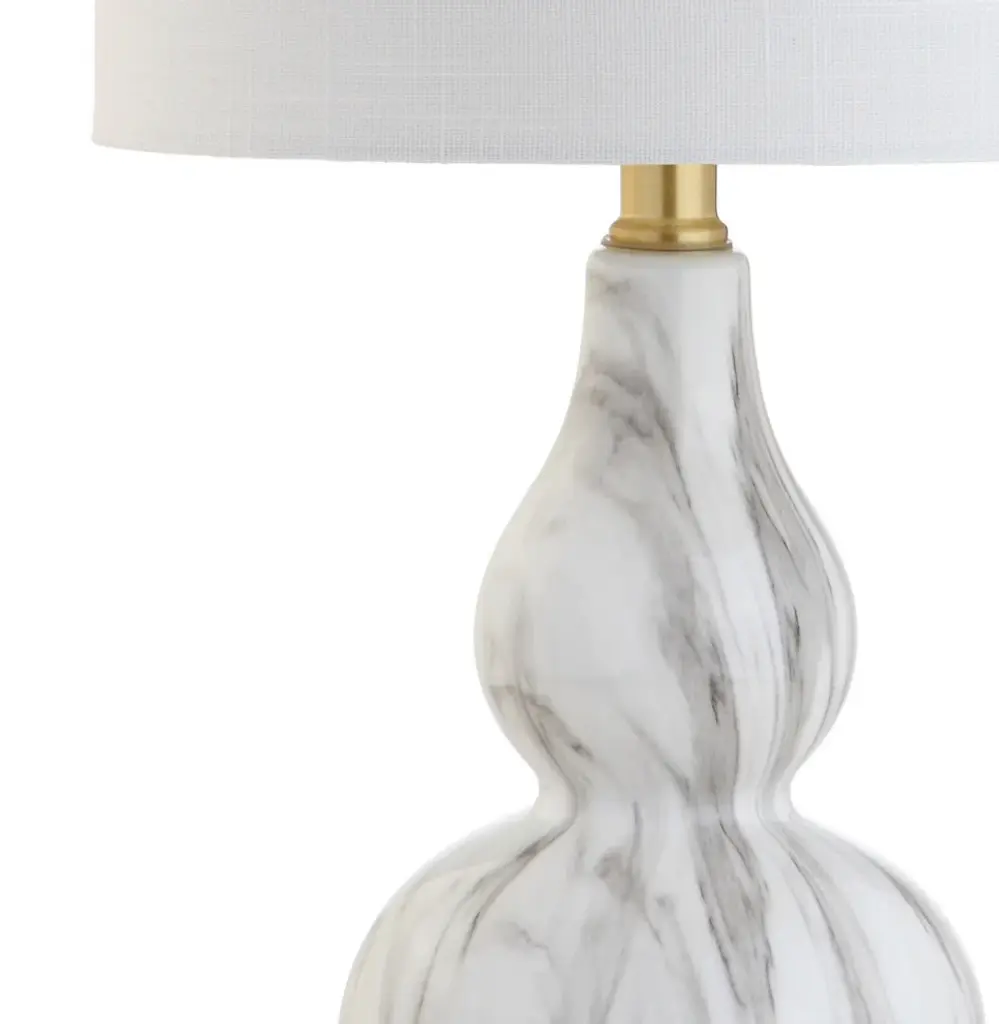 The smaller scale of this classic double-gourd table lamp makes it the perfect fashionable and functional accent for a console table or nightstand. The hand-blown glass body stuns in a gorgeous marbleized combination of black and white tints, finished with a brass-plated base pedestal and matching accents. Up top is a white linen fabric shade and brass-colored sphere finial. A classic glass lamp with a modern shape, this piece will add both light and style to a variety of rooms. This item is sold as a set of two.-Black and white marbleized glass table lamp with brass-plated base and hardware-Classic white drum shade in a hardback cotton material-Clear 60" cord with standard USA 2-prong plug -On-off switch on socket-Takes one maximum 40 watt or equivalent bulb (each)-Eco-friendly 4W LED bulb included-UL Listed-Color: Black/white with white shade-Body Material: Glass-Base Material: Iron-Finial Material: Plastic-Finial Color: Brass Gold-Harp Color: Gold-Includes: Two (2) lamps-Assembly Required-Lamp: 20.5 inches high x 10 inches wide x 10 inches deep-Shade: 8.5 inches high x 10 inches wide x 10 inches deepYou see a lamp.We see a decorative work of art.A perfectly curved shade casts a dramatic shadow on a floor. Compatible with LED lightbulbs: as easy on the environment as they are on the eyes. The JONATHAN Y Lighting collection considers every detail from impeccably sourced materials to designer styling. And our prices are so attractive, we�ve transformed a functional necessity into a fashion accessory.JONATHAN Y Lighting - a fashion revolution in home decor.