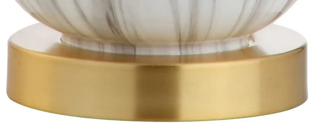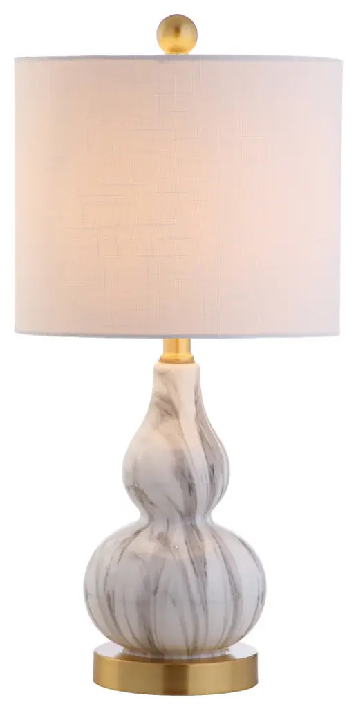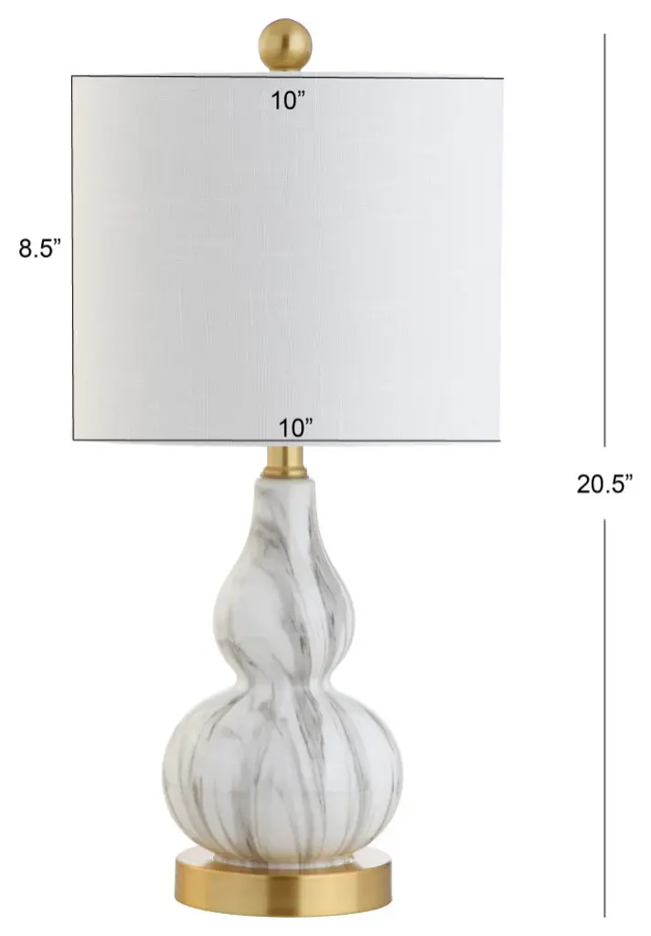 The smaller scale of this classic double-gourd table lamp makes it the perfect fashionable and functional accent for a console table or nightstand. The hand-blown glass body stuns in a gorgeous marbleized combination of black and white tints, finished with a brass-plated base pedestal and matching accents. Up top is a white linen fabric shade and brass-colored sphere finial. A classic glass lamp with a modern shape, this piece will add both light and style to a variety of rooms. -Black and white marbleized glass table lamp with brass-plated base and hardware-Classic white drum shade in a hardback cotton material-Clear 60" cord with standard USA 2-prong plug -On-off switch on socket-Takes one maximum 40 watt or equivalent bulb-Eco-friendly 4W LED bulb included-UL Listed-Color: Black/white with white shade-Body Material: Glass-Base Material: Iron-Finial Material: Plastic-Finial Color: Brass Gold-Harp Color: Gold-Includes: One (1) lamp-Minor Assembly Required-Lamp: 20.5 inches high x 10 inches wide x 10 inches deep-Shade: 8.5 inches high x 10 inches wide x 10 inches deepYou see a lamp.We see a decorative work of art.A perfectly curved shade casts a dramatic shadow on a floor. Compatible with LED lightbulbs: as easy on the environment as they are on the eyes. The JONATHAN Y Lighting collection considers every detail from impeccably sourced materials to designer styling. And our prices are so attractive, we�ve transformed a functional necessity into a fashion accessory.JONATHAN Y Lighting - a fashion revolution in home decor.