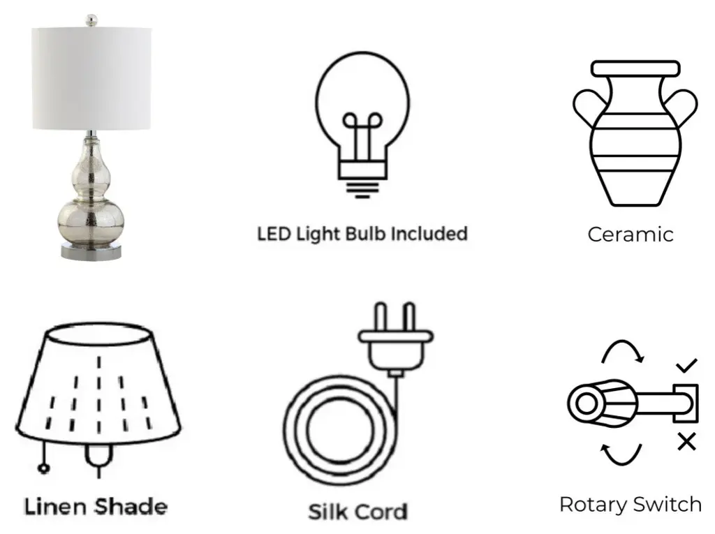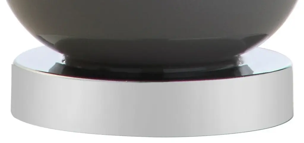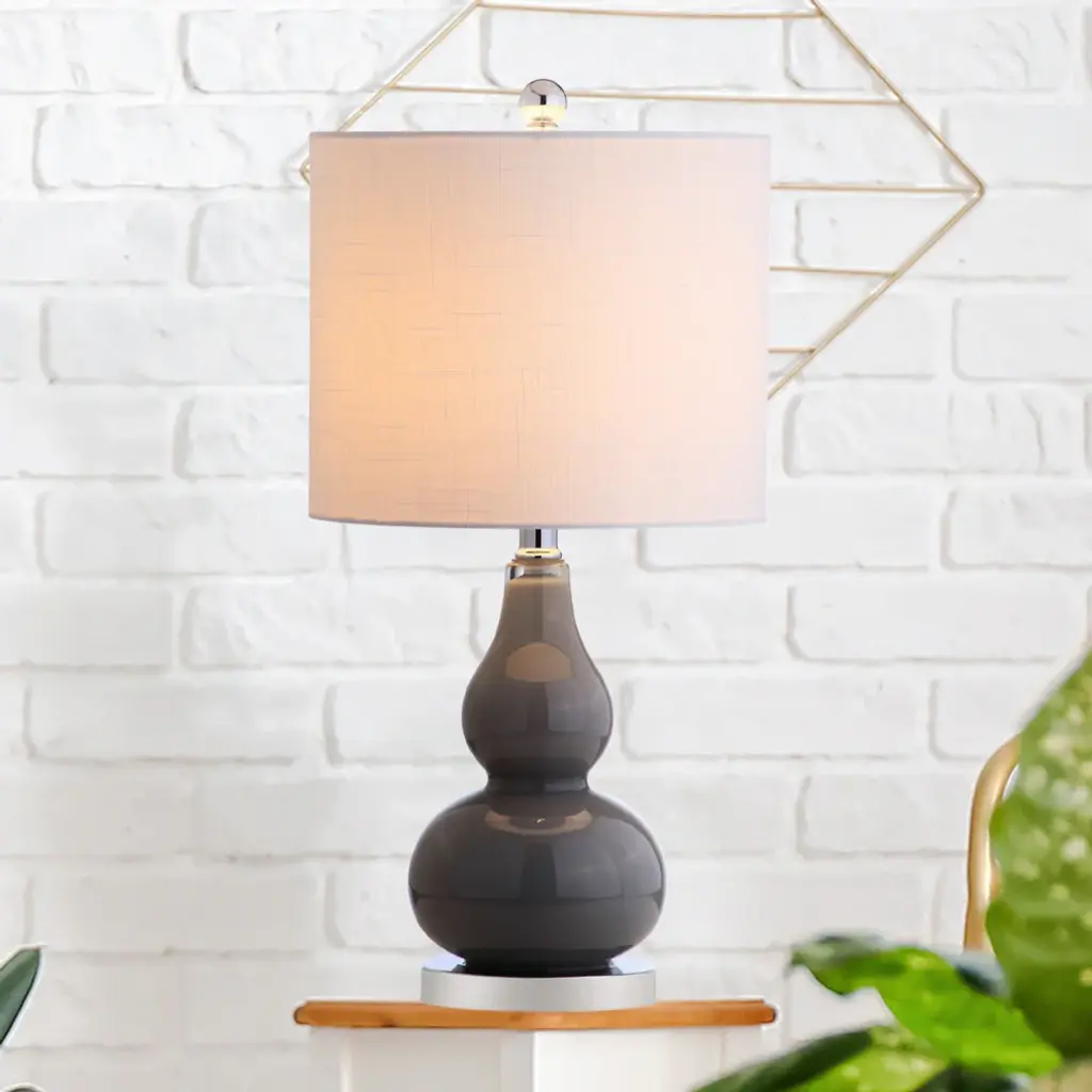 The smaller scale of this classic double-gourd table lamp makes it the perfect fashionable and functional accent for a console table or nightstand. The hand-blown glass body stuns in a gorgeous shade of gray, finished with a chrome base pedestal and matching accents. Up top is a white linen fabric shade and chrome sphere finial. A classic glass lamp with a modern shape, this piece will add both light and style to a variety of rooms. -Gray glass table lamp with chrome base and hardware.-Classic white drum shade in a hardback cotton material-Clear 60" cord with standard USA 2-prong plug -On-off switch on socket-Takes one maximum 40 watt or equivalent bulb-Eco-friendly 4W LED bulb included-UL Listed-Color: Gray with white shade-Body Material: Glass-Base Material: Iron-Finial Material: Plastic-Finial Color: Chrome-Harp Color: Silver-Includes: One (1) lamp-Minor Assembly Required-Lamp: 20.5 inches high x 10 inches wide x 10 inches deep-Shade: 8.5 inches high x 10 inches wide x 10 inches deepYou see a lamp.We see a decorative work of art.A perfectly curved shade casts a dramatic shadow on a floor. Compatible with LED lightbulbs: as easy on the environment as they are on the eyes. The JONATHAN Y Lighting collection considers every detail from impeccably sourced materials to designer styling. And our prices are so attractive, we�ve transformed a functional necessity into a fashion accessory.JONATHAN Y Lighting - a fashion revolution in home decor.