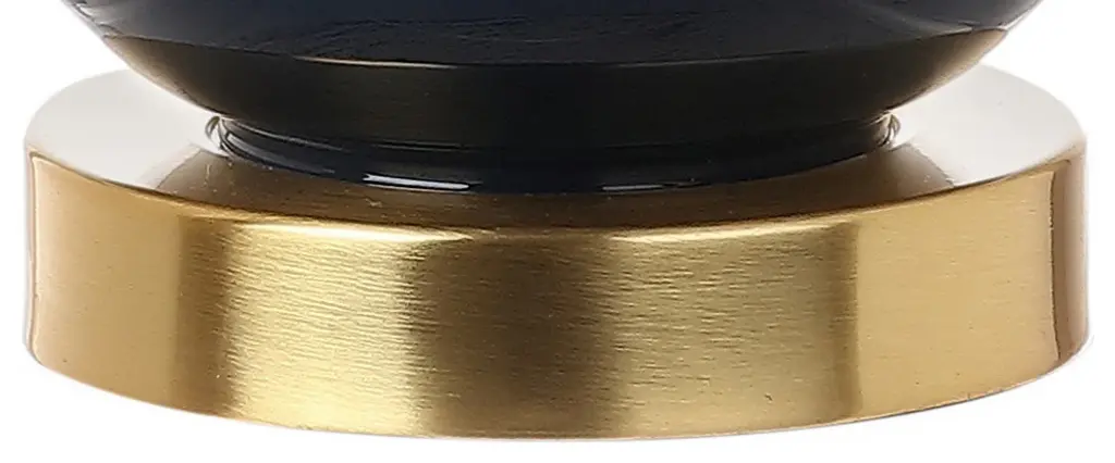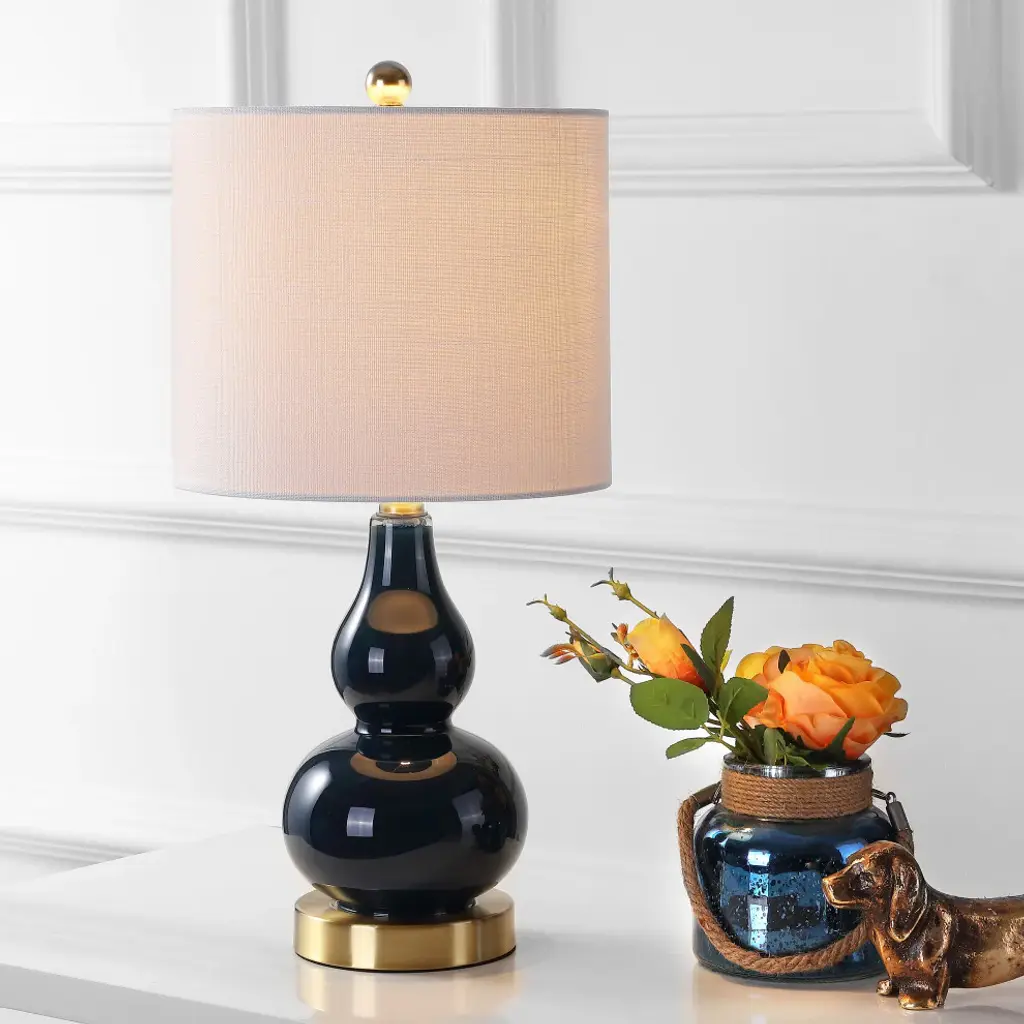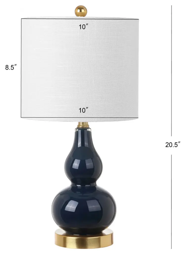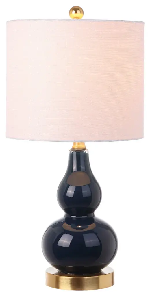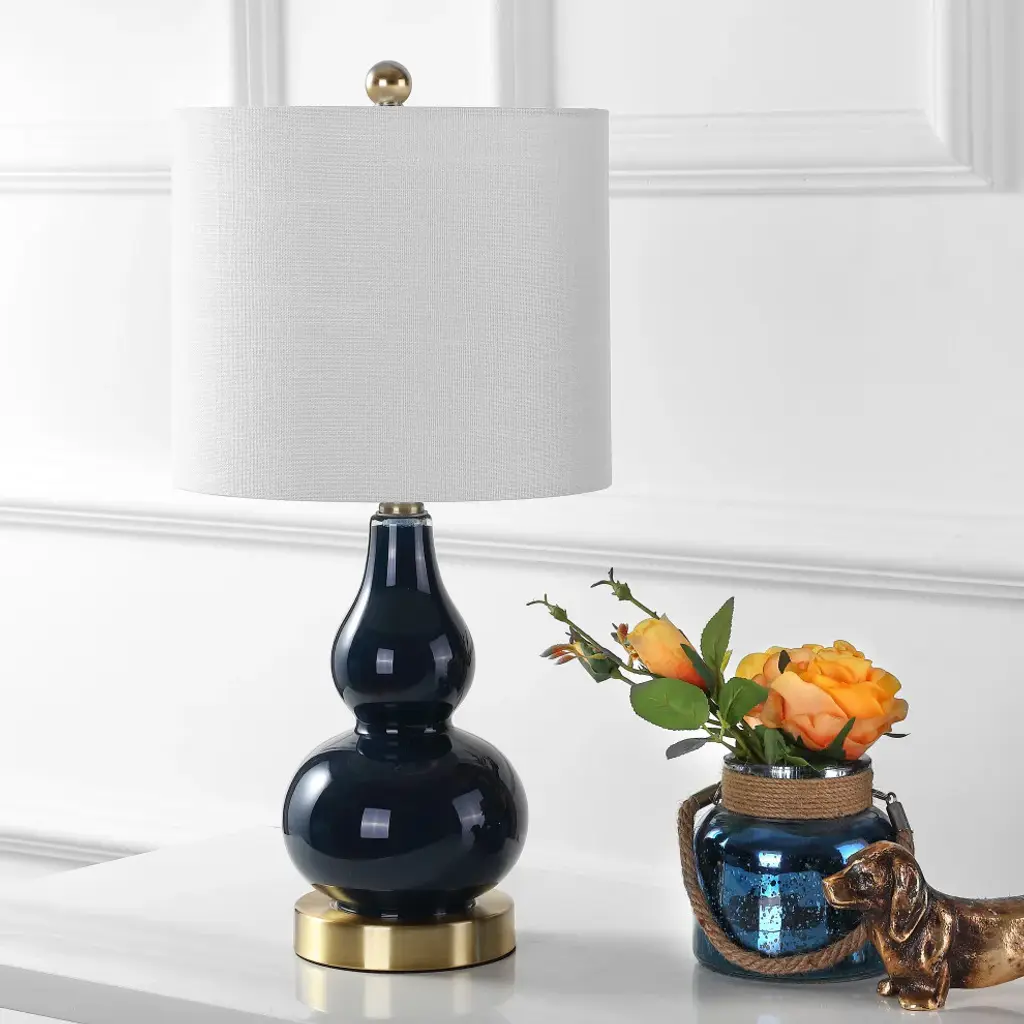 The smaller scale of this classic double-gourd table lamp makes it the perfect fashionable and functional accent for a console table or nightstand. The hand-blown glass body stuns in a gorgeous shade of navy, finished with a brass-plated base pedestal and matching accents. Up top is a white linen fabric shade and brass-colored sphere finial. A classic glass lamp with a modern shape, this piece will add both light and style to a variety of rooms. -Navy glass table lamp with brass-plated base and hardware-Classic white drum shade in a hardback cotton material-Clear 60" cord with standard USA 2-prong plug -On-off switch on socket-Takes one maximum 40 watt or equivalent bulb-Eco-friendly 4W LED bulb included-UL Listed-Color: Navy with white shade-Body Material: Glass-Base Material: Iron-Finial Material: Plastic-Finial Color: Brass Gold-Harp Color: Gold-Includes: One (1) lamp-Minor Assembly Required-Lamp: 20.5 inches high x 10 inches wide x 10 inches deep-Shade: 8.5 inches high x 10 inches wide x 10 inches deepYou see a lamp.We see a decorative work of art.A perfectly curved shade casts a dramatic shadow on a floor. Compatible with LED lightbulbs: as easy on the environment as they are on the eyes. The JONATHAN Y Lighting collection considers every detail from impeccably sourced materials to designer styling. And our prices are so attractive, we�ve transformed a functional necessity into a fashion accessory.JONATHAN Y Lighting - a fashion revolution in home decor.