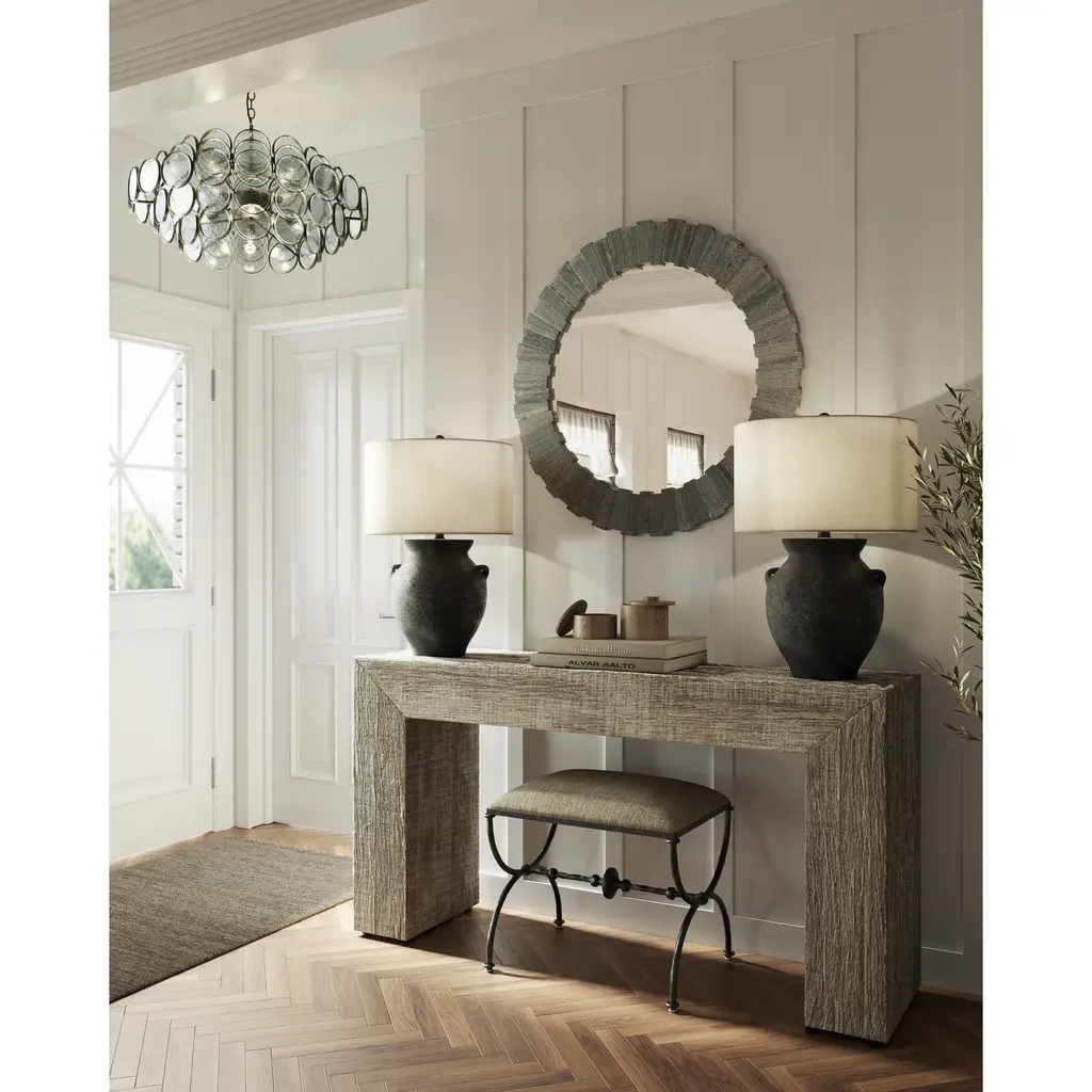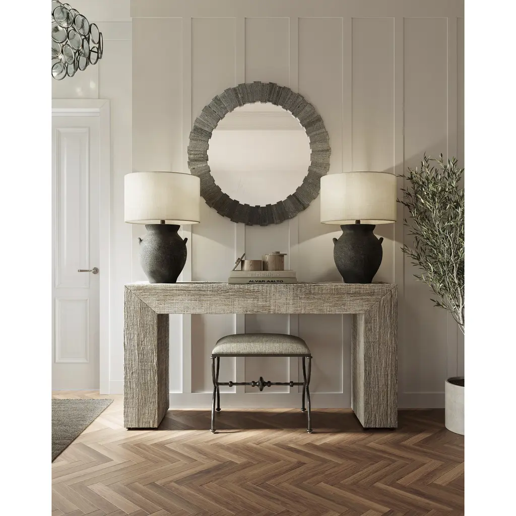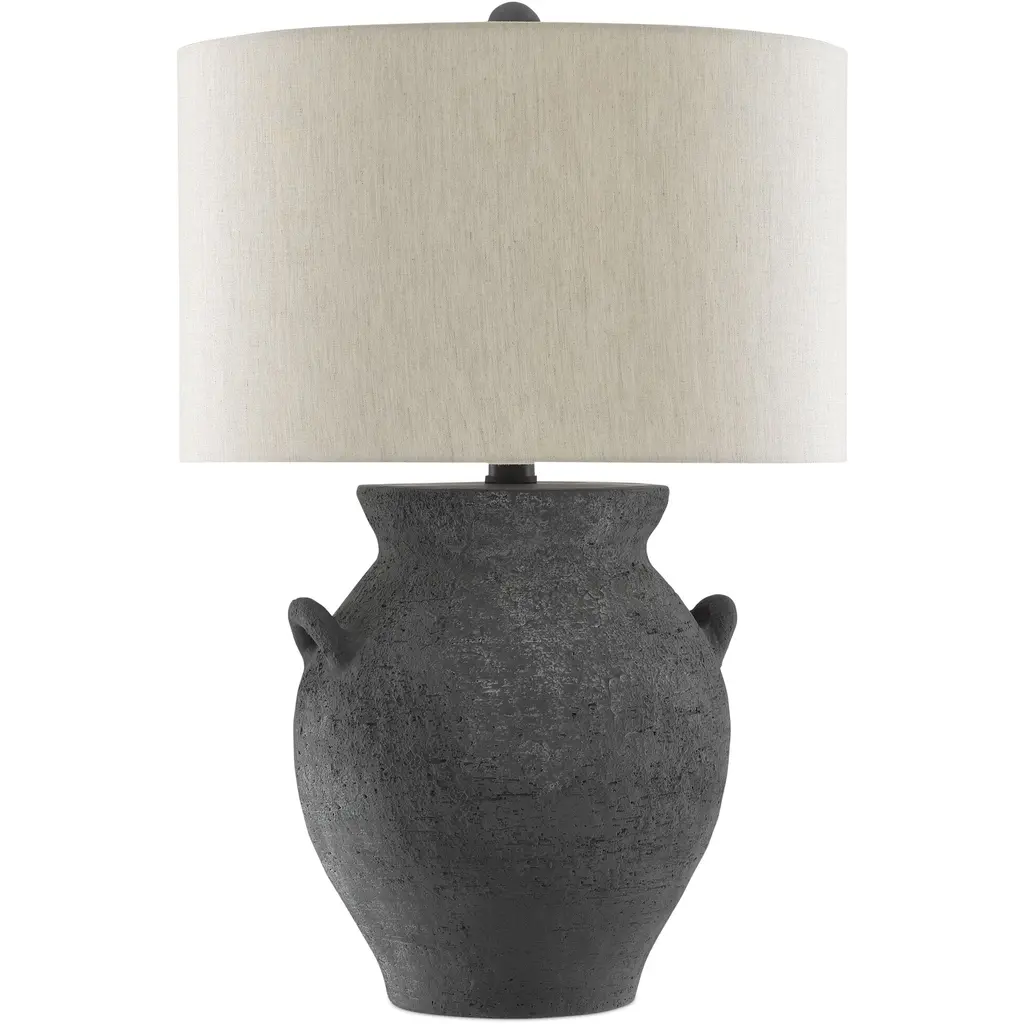 Made of terracotta in a black ash finish, the Anza Table Lamp mimics a ginger jar shape with cleverly placed handles. The roughness of the surface of the terracotta gives this dark gray lamp an extra dose of texture. Wrought iron hardware in a satin black finish is a seamless addition to the composition, as is the matching terracotta finial in a black ash finish that fastens the natural linen drum shade to the lamp.