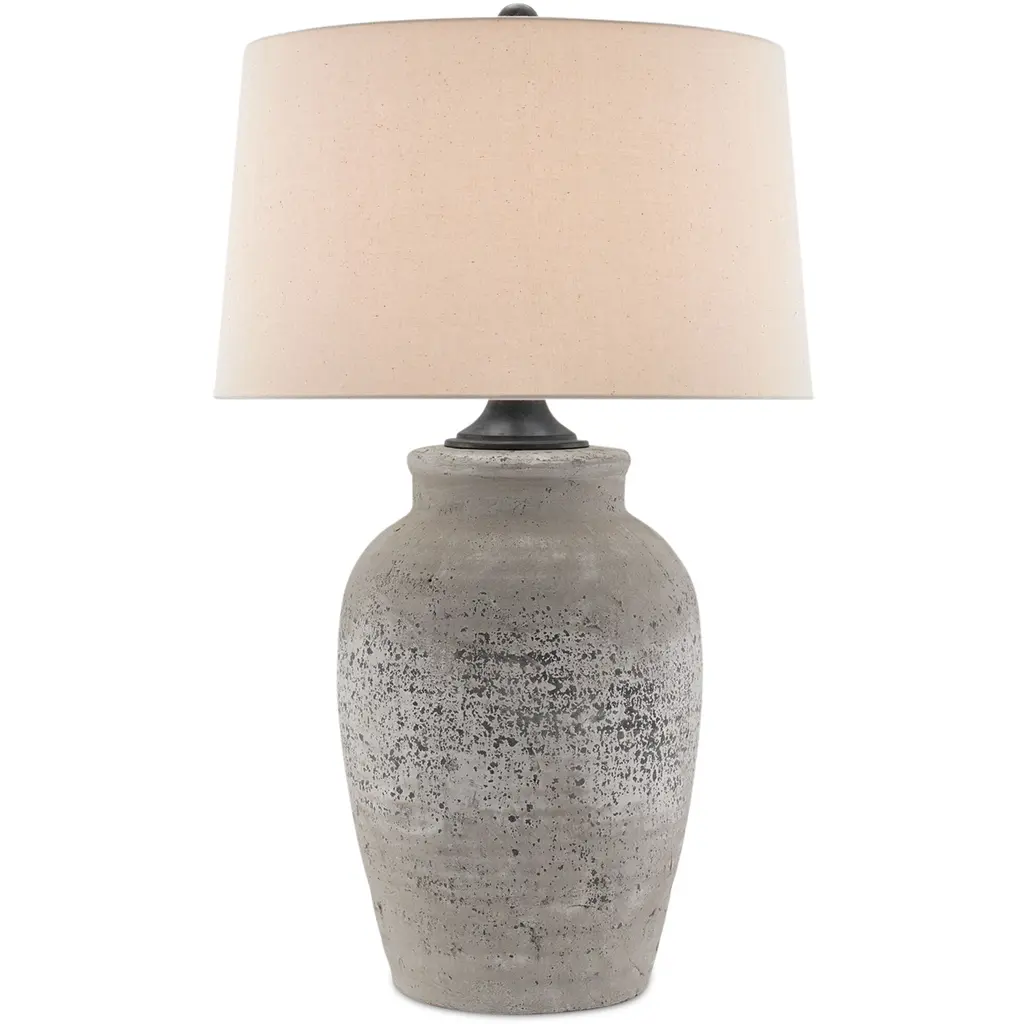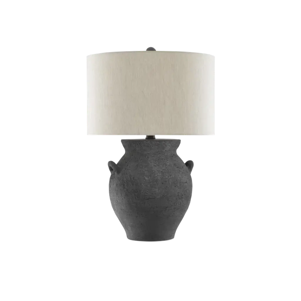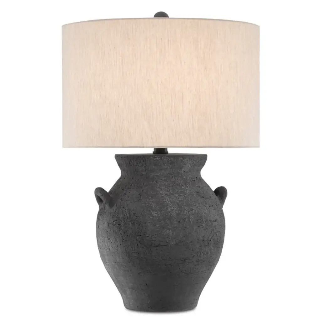 A ginger jar-like lamp is crafted of subtly textured terracotta in a black ash finish. The iron features a black satin finish. A natural linen shades adds a refreshing update to a classically styled table lamp.