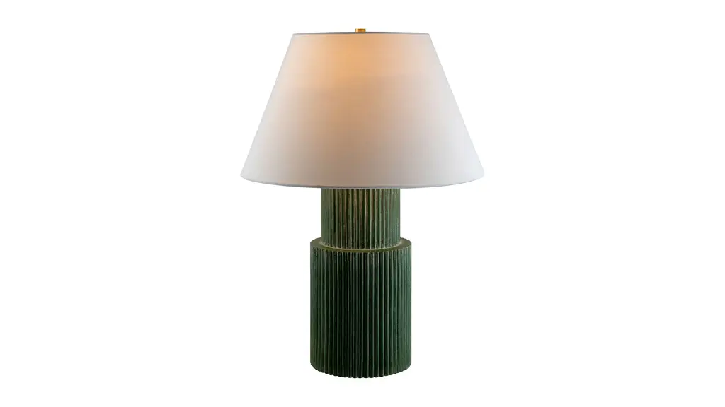 Meet the Anza Table Lamp, the perfect pairing of saturated color and refined texture. The base is crafted from deep green, reeded resin, contrasting boldly with the sleek white linen shade. Crafted with attention to detail and quality materials, the Anza Lamp adds a touch of sophistication to any space, from contemporary to traditional. Features - Resin base with white linen shade - 6 ft. cord - Rocker on-off switch - Use with E-26 base bulb up to 100W (not included)
