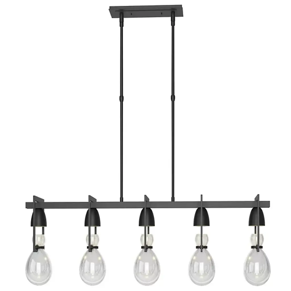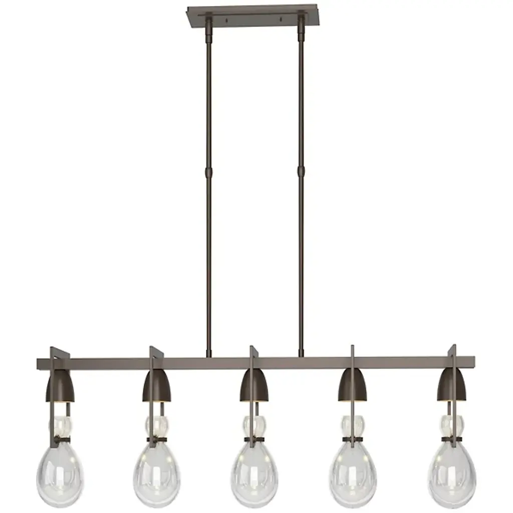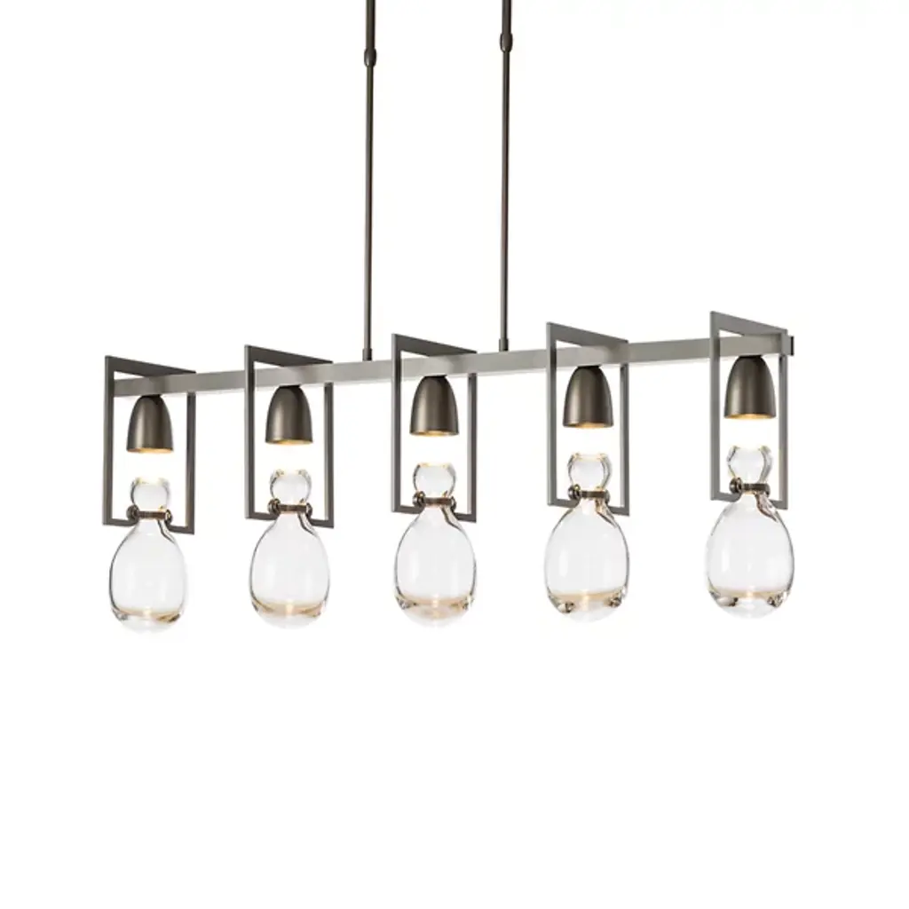 The Apothecary Linear Suspension by Hubbardton Forge is inspired by old fashioned Apothecary's and their many bottles and vessels that seem to have a certain romantic quality. A series of hand blown hourglass forms sit cradled in rectangular frames, each lit with a hidden Halogen lamp that shines from above. This creates an intriguing trickle down lighting effect that gives a unique highlight to the translucent glass and shows off its artisan created qualities. Ideal for use over a dining room table, kitchen island or office to add lighting as well as a modern take on a small piece of the past. Made to order in the USA.