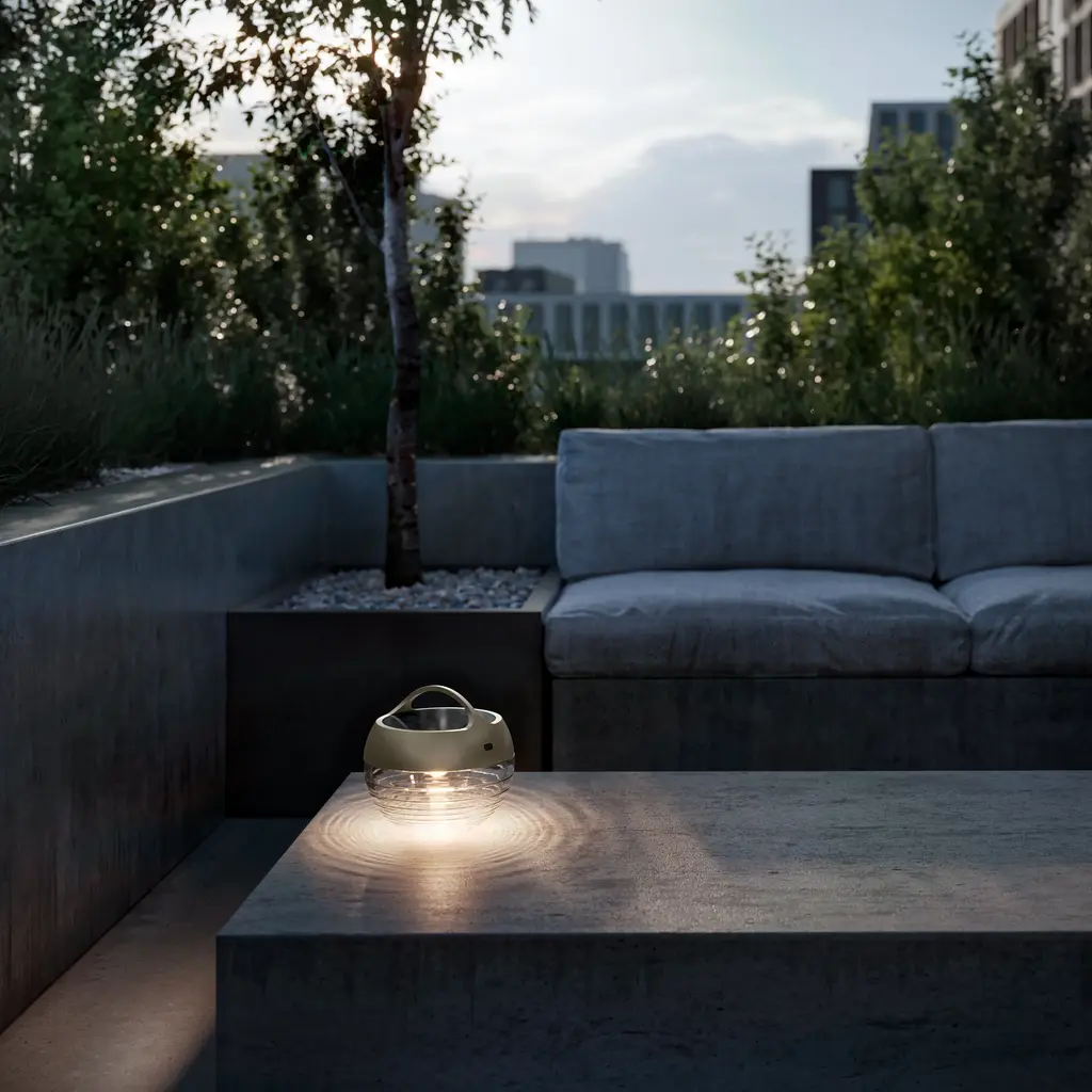 The Aqu Portable Lamp is a durable outdoor lighting solution designed for portability and flexibility. Its rechargeable NiMH battery can be charged either via a USB-C cable or through an integrated solar panel, providing up to 24 hours of illumination depending on the selected brightness level. With three dimming settings and a light temperature of 2700K, the lamp is perfect for creating a warm ambiance. Built from powder-coated aluminum and mouth-blown crystal glass, it holds an IP65 rating, ensuring resistance to water and dust, suitable for outdoor use even in harsh conditions. Available in 2 sizes and 4 finshes.
