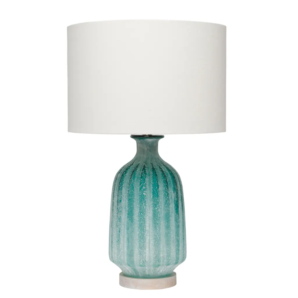 The texture and frosted glass of this aqua table lamp is reminiscent of the breezy seashore. Includes finial and harp. Includes lamp and lamp shade. Material: Glass Color: Aqua Finish: Frosted Aqua Glass Dimensions As Shown: 15”w x 23.75”h Lamp Dimensions: 8"dia x 13.75"h Shade Fabric: Cream Linen Shade Dimensions: 15"top dia./15"bottom dia./10"h Collection Code: GLASS Style: Transitional Cord Color: Clear Number of Bulbs: 1 Watts: 150 watts Socket Type: Medium Base (E-26) Switch Type: 3-way