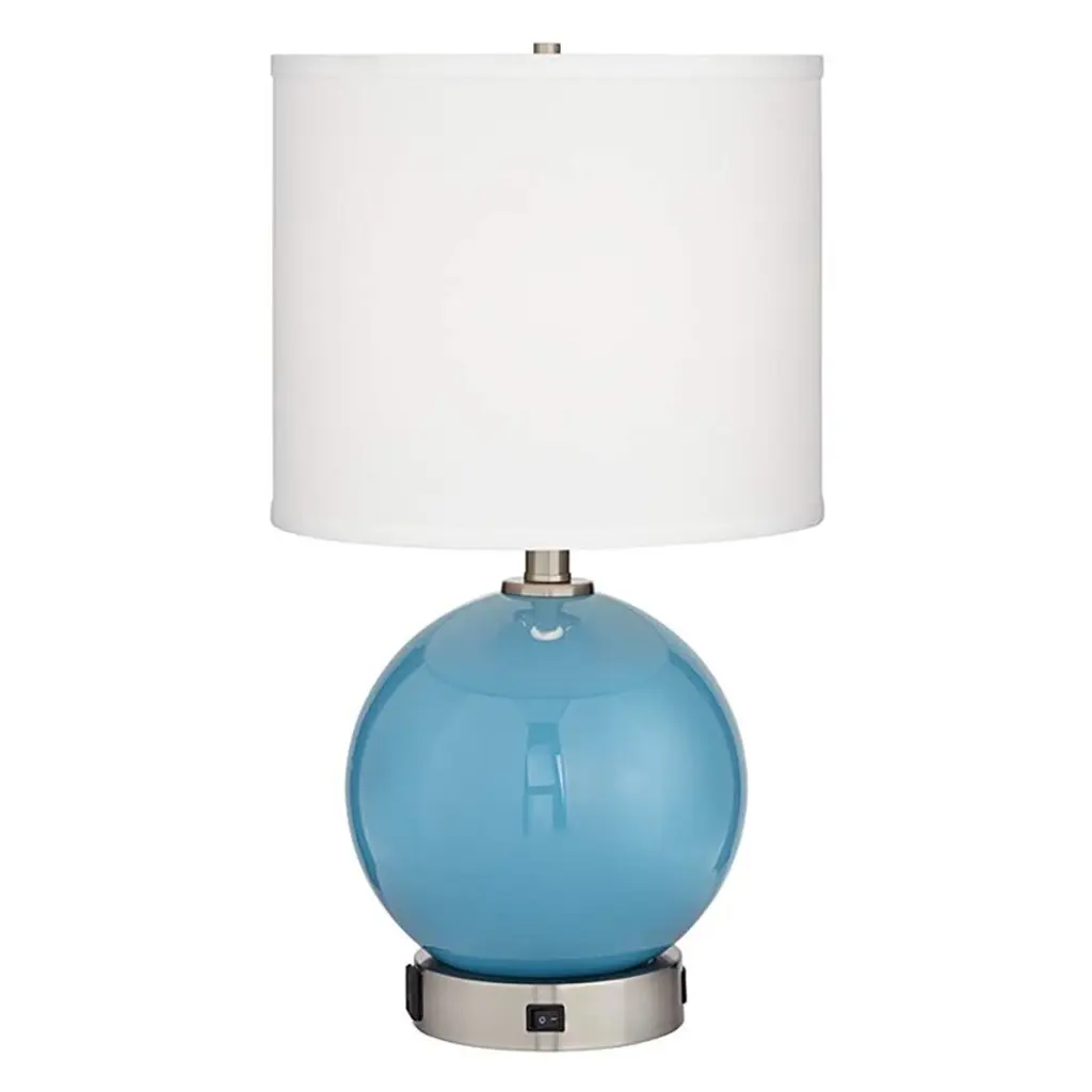 Product Details 21" high overall. Shade is 10" high x 12" wide. Uses one maximum 100 watt standard-medium base bulb (not included). On-off switch. Sphere accent table lamp with one built-in USB port and one power outlet in base. Blue glass body. Glass lamp construction. Brushed nickel finish metal base. White linen fabric drum shade. 8-foot long clear silver cord with 3-prong plug.