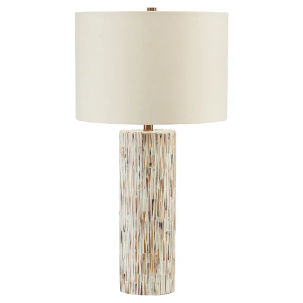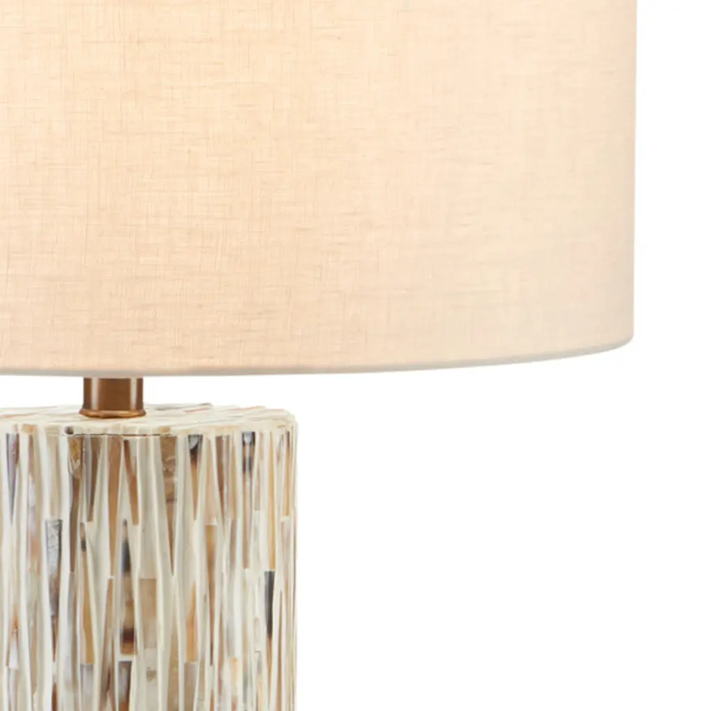 Made of composite that has a rich layering of natural bone mosaic running along its cylindrical body, the Aquila Table Lamp brings an elemental freshness to a space while introducing a hint of texture. The hardware and finial in an antique brass finish bring out the darker tones in this table lamp. We've topped the Aquila with a white drum shade.