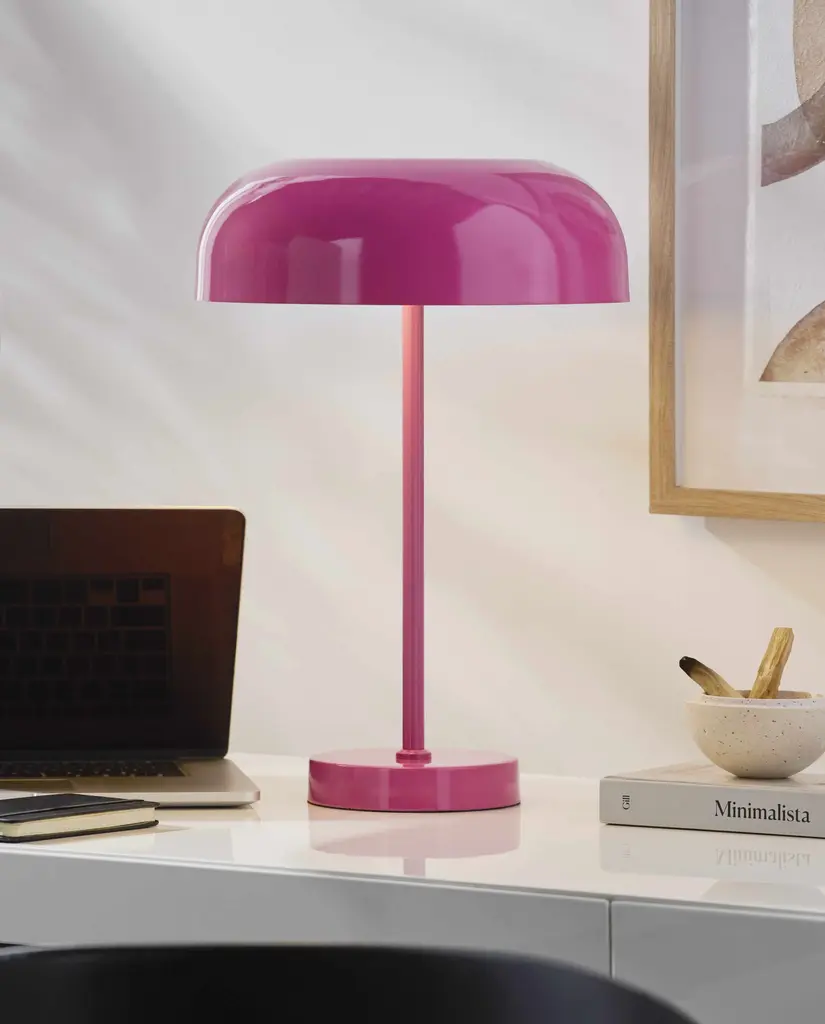 Collection: Aquilonia Colors: Pink, White, Translucent Material: Body: Iron / Base: Iron / Shade (Outside): Metal Styles: Contemporary Made In: China Lighting Type: Accent Table Lighting Base: Iron Base Color: Pink Shade Material: Metal Shade Color: White, Pink Cord Length: 6' Switch Type: Rotary Number of Bulbs: 2 Socket Type: E-26 Bulb Wattage: 25W