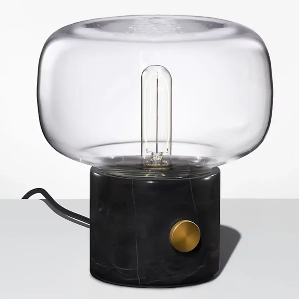 The Arca Petite Table Lamp from Niche brings a sophisticated touch to any space with its distinctive squared design softened by smooth, gentle edges. Perfect on its own or paired with the taller Arca version, it strikes a beautiful balance between modern style and inviting warmth. A pristine glass shade sits atop a luxurious carved marble base, each with unique veining. A satin brass dimmer knob adds elegance while letting it adjust the light to create the perfect ambiance.