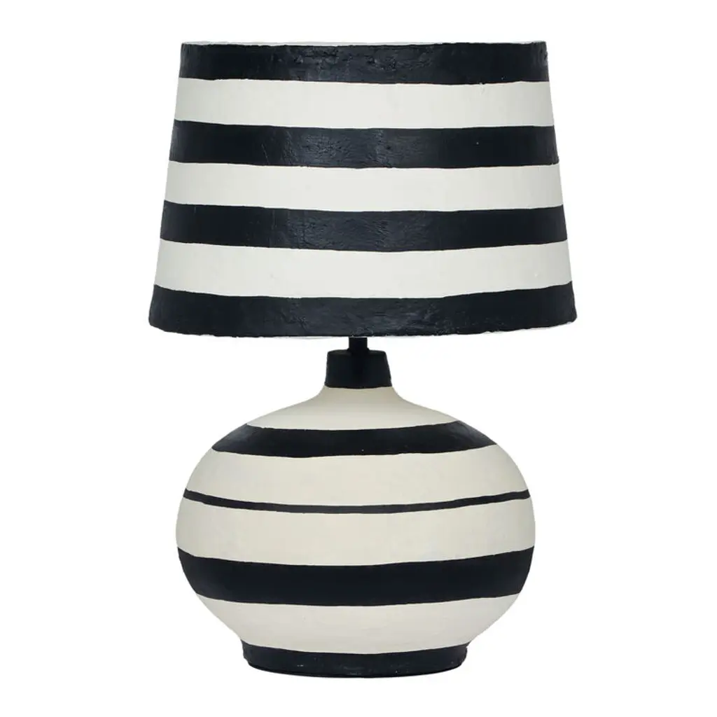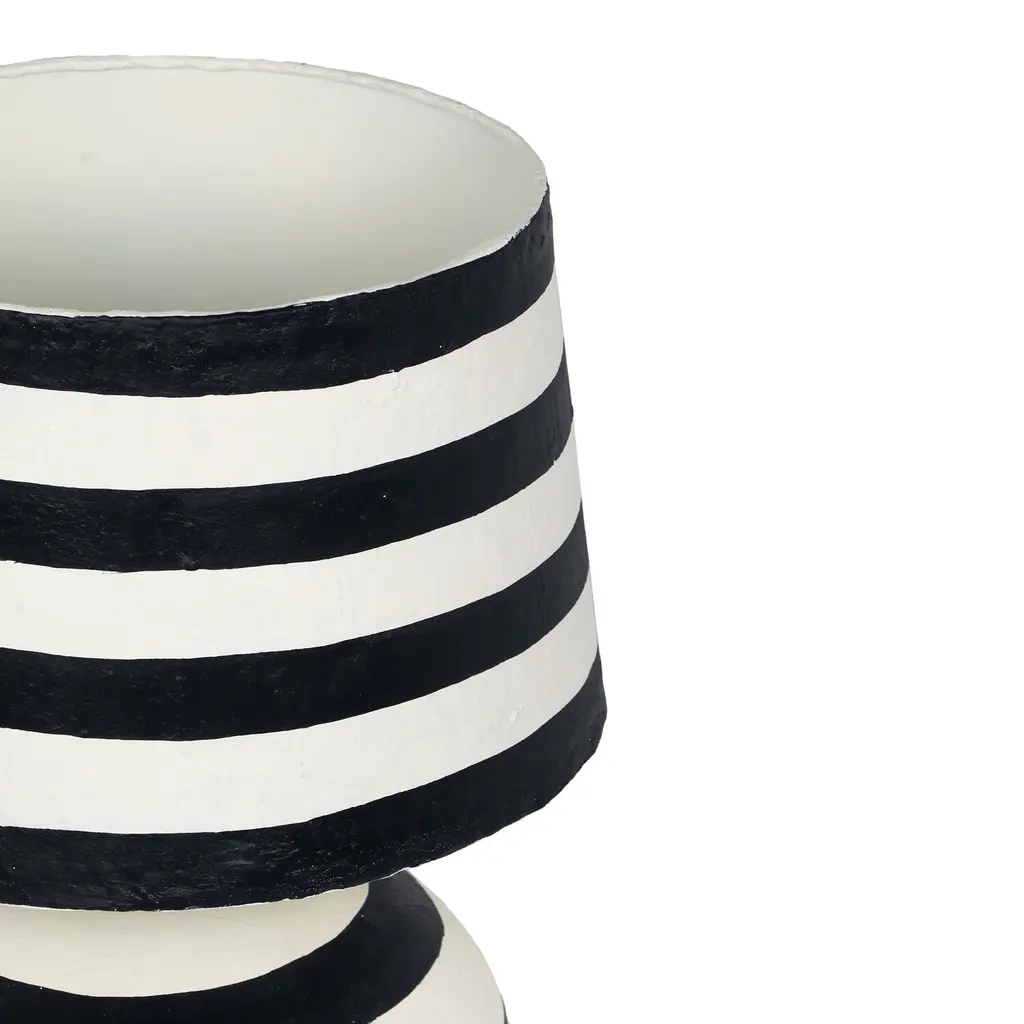 A bold display of craftsmanship by Indian artisans, the Arcade table lamp is handmade of textural papier-mâché with horizontal stripes in stark black and white. Unified by their two-tone contrast, both the rounded base and subtly tapered shade are sculpted of paper pulp on strong iron frames. This handcrafted desk lamp is a tactile statement piece that pulls traditional papier-mâché techniques into the contemporary realm of aesthetics.