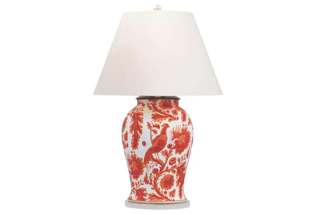 Artfully adorned with an array of bright flourishes and perched peacocks, this oversize table lamp impresses guests with spirited sophistication. The Arcadia lamp is inspired from Scalamandre's archival 'resist' fabric. Accented with a black wood lid, Lucite base, and crystal ball finial.