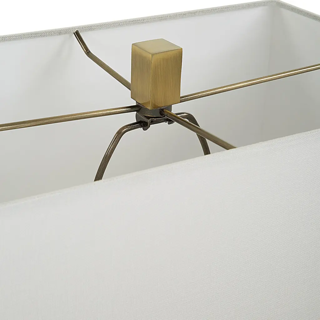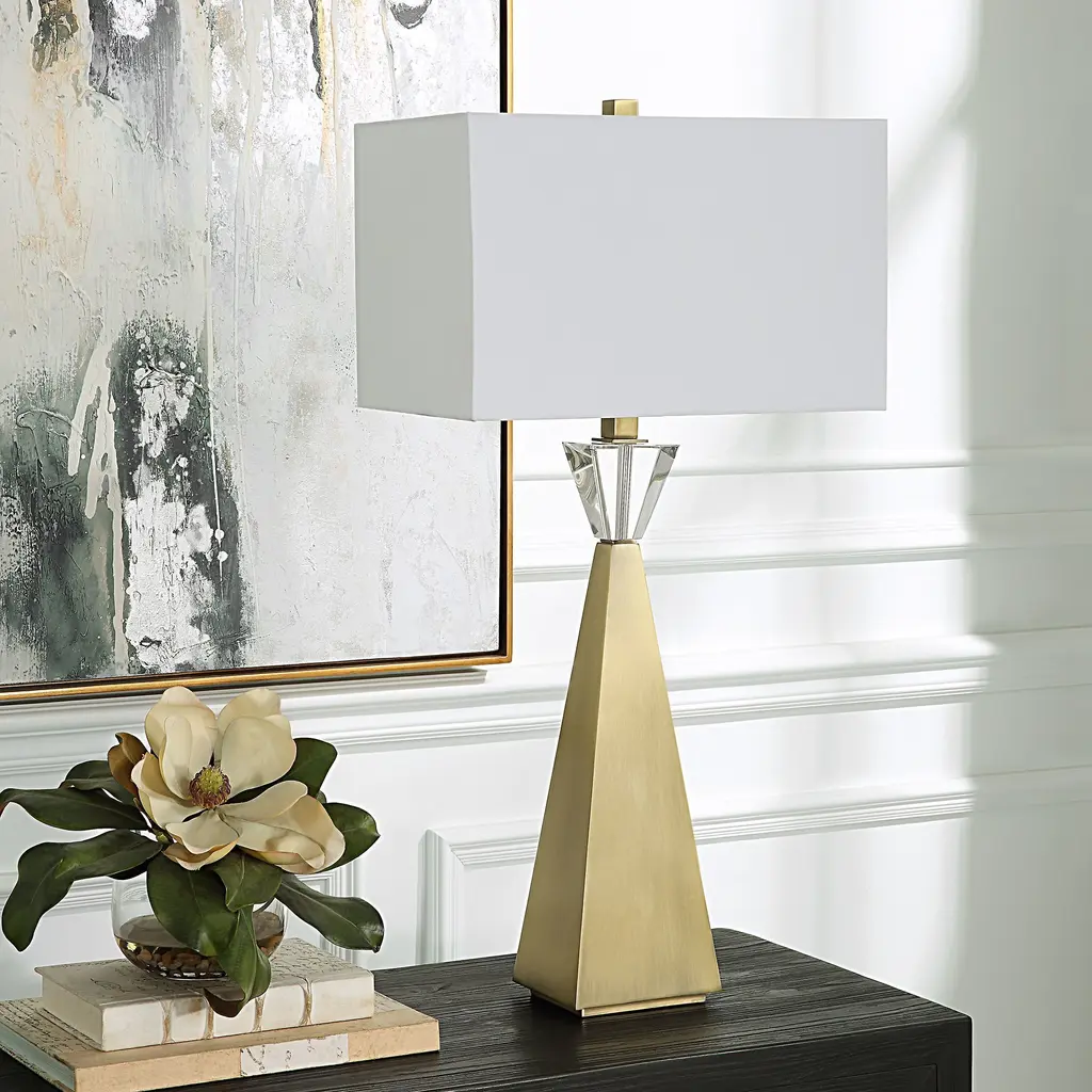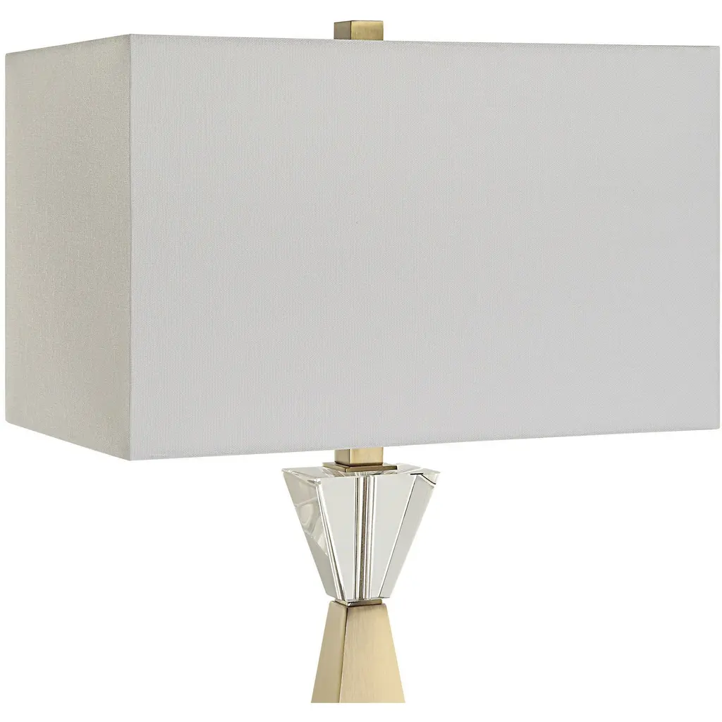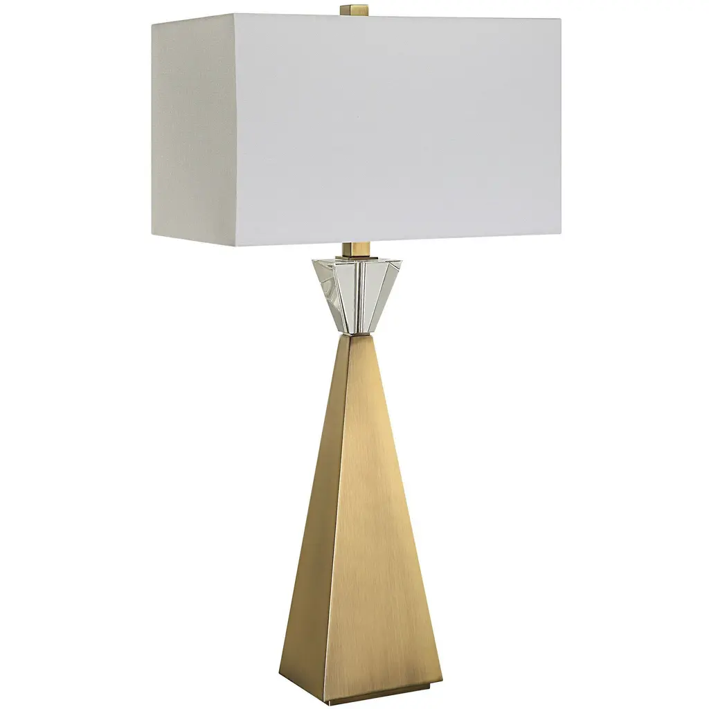 Contemporary In Design Yet Elegant In Style, This Table Lamp Features A Tapered Iron Base Finish In A Plated Antique Brass Topped With A Thick Crystal Ornament. The Rectangle Hardback Shade Is A Crisp White Linen Fabric.