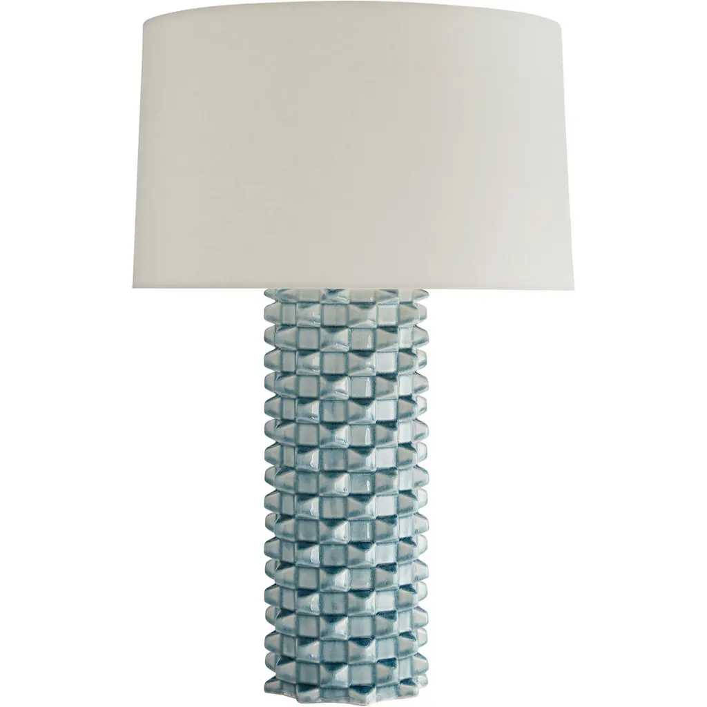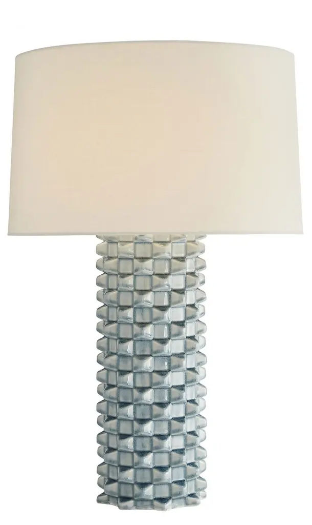 A crackled celadon finish calls attention to the beautifully textured surface of this porcelain table lamp. A coordinating finial and light gray cotton drum shade lined with white cotton complete the design. Due to the handmade nature of this piece, variations in color and tone may occur.