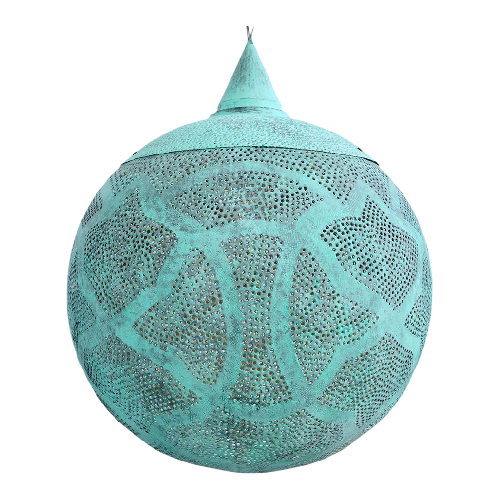 The Aria Table Lamp from Dounia Home offers a rich artisanal appeal to flat surfaces. Handmade by Moroccan artisans in the center of Marrakech, it rests on a round base made from marble. A single light is placed within a spherical shade, featuring small perforations and curving geometric accents across its surface. The top of the shade is open, creating a column of light above, accentuated by sparkling pinpoints of ambient warmth and shadow to the sides, matching traditional construction with more modern shapes.