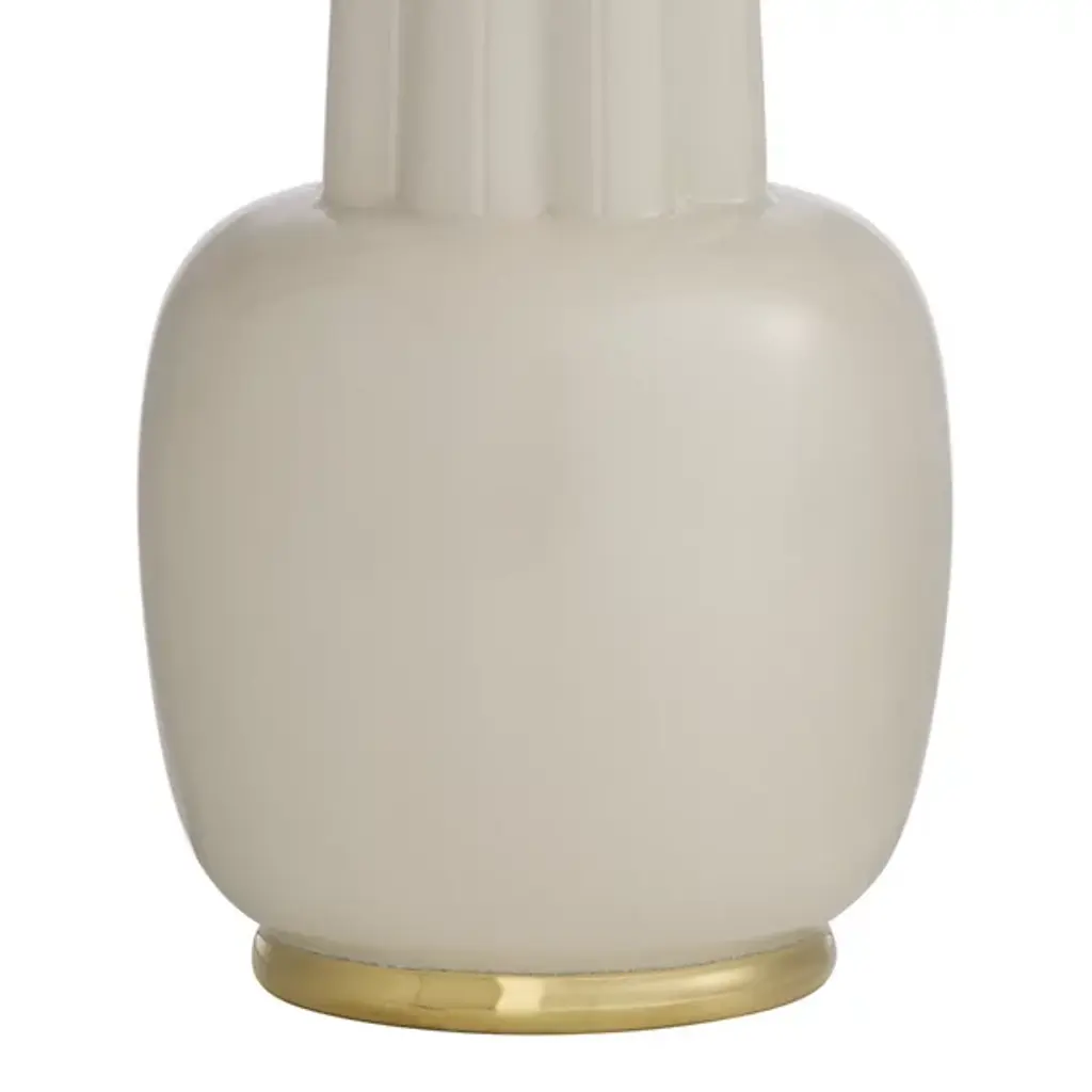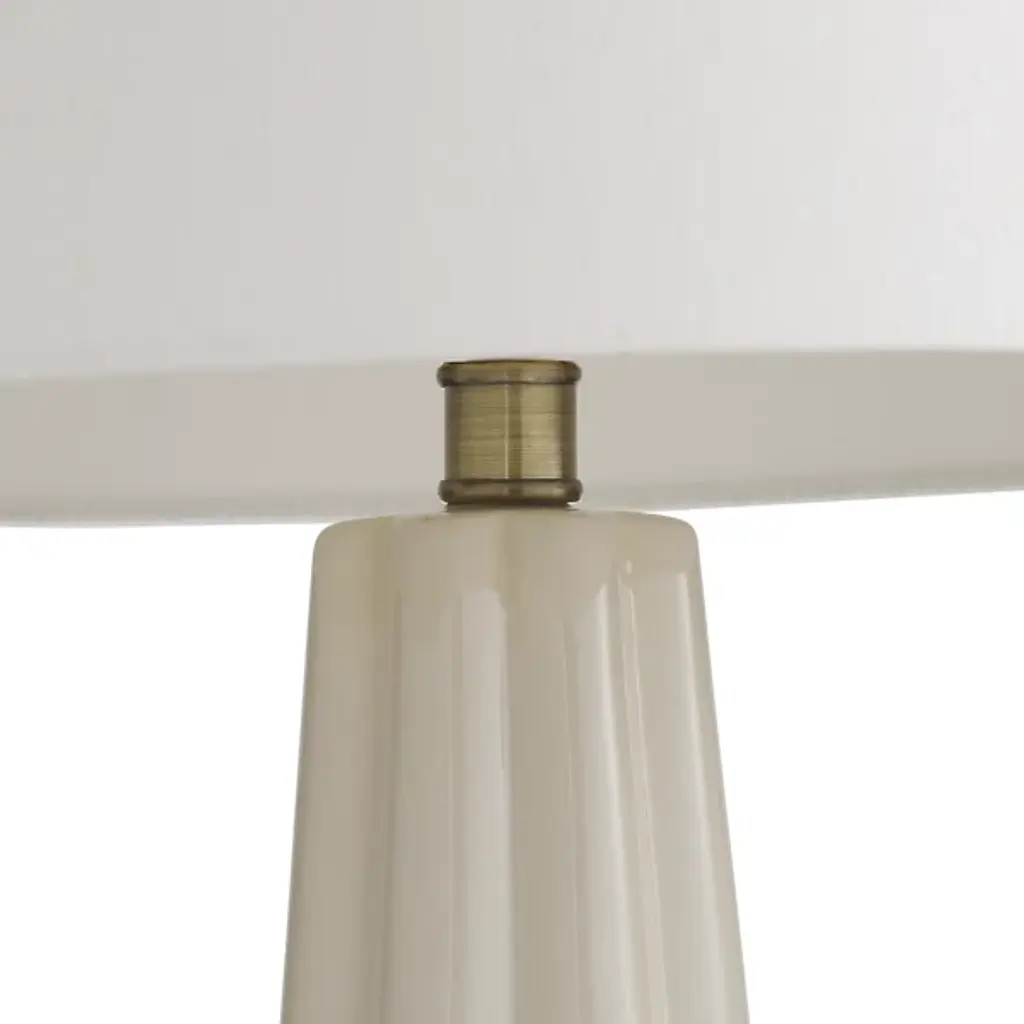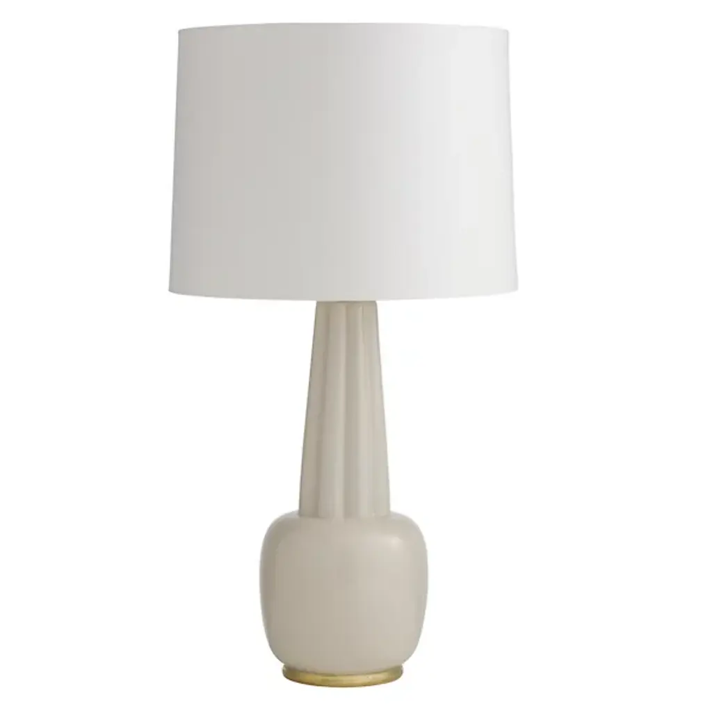 The Arlington Table Lamp from Arteriors combines traditional porcelain craftsmanship with refined proportions that suit both classic and contemporary settings. Elongated ribbed neck towers over a rounded base, creating vertical emphasis. Ivory finish accentuates the lamp's graceful curves while maintaining neutral versatility for bedrooms, living areas, or office spaces. An off-white linen drum shade with cotton lining provides warm, diffused illumination, and a matching porcelain finial completes this timeless design, which adapts to various interior styles.