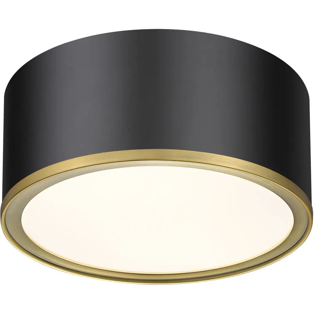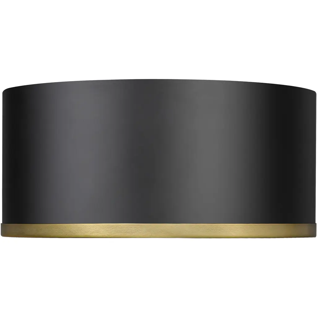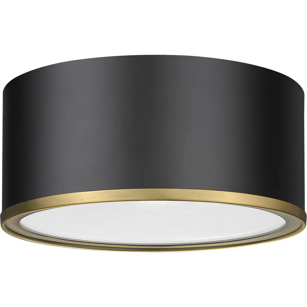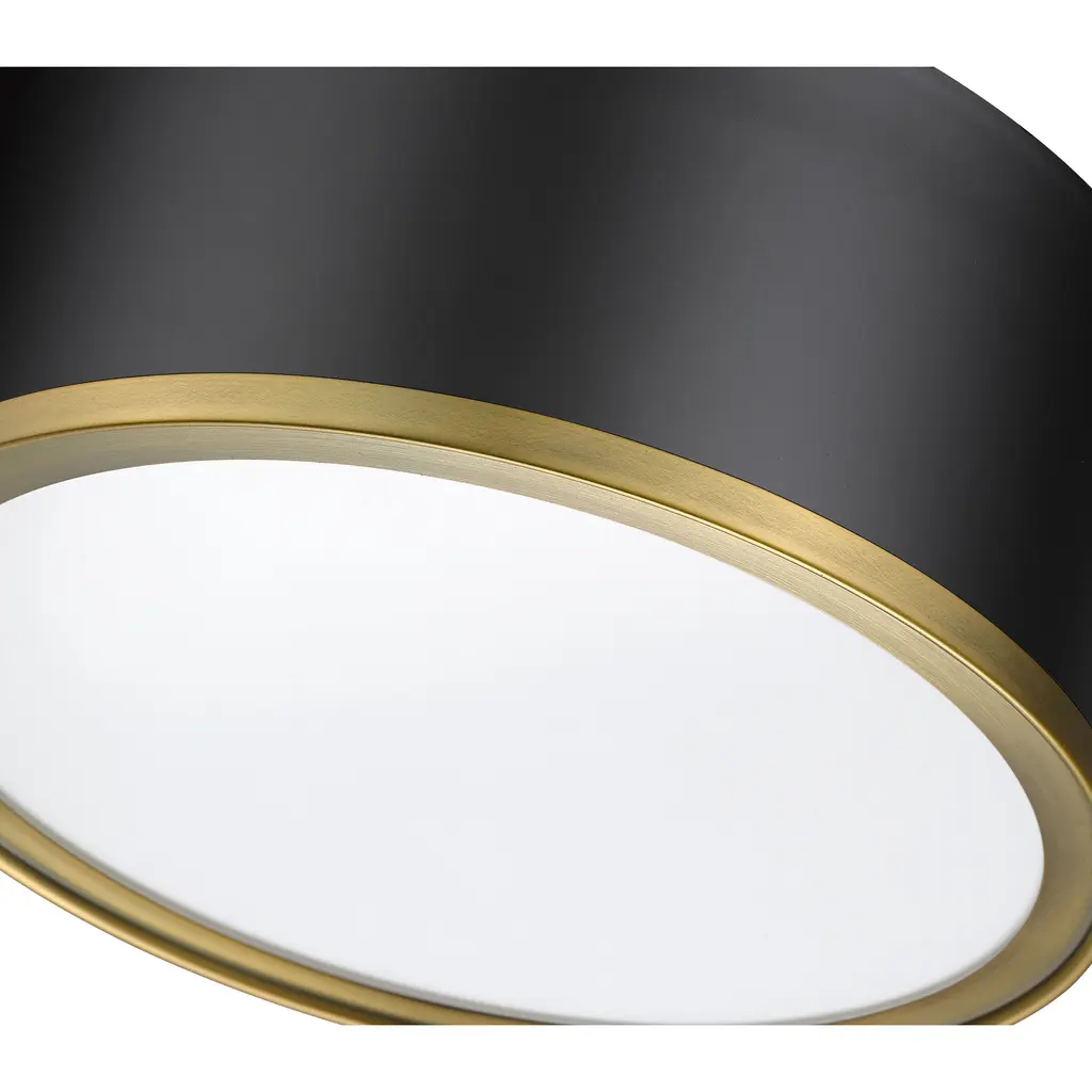 This two-tone metal flush mount light presents a sleek and smooth impression. Perfect for a hallway, home office, or small foyer, this matte black lamp with rubbed brass trim is simplistic yet stylish.