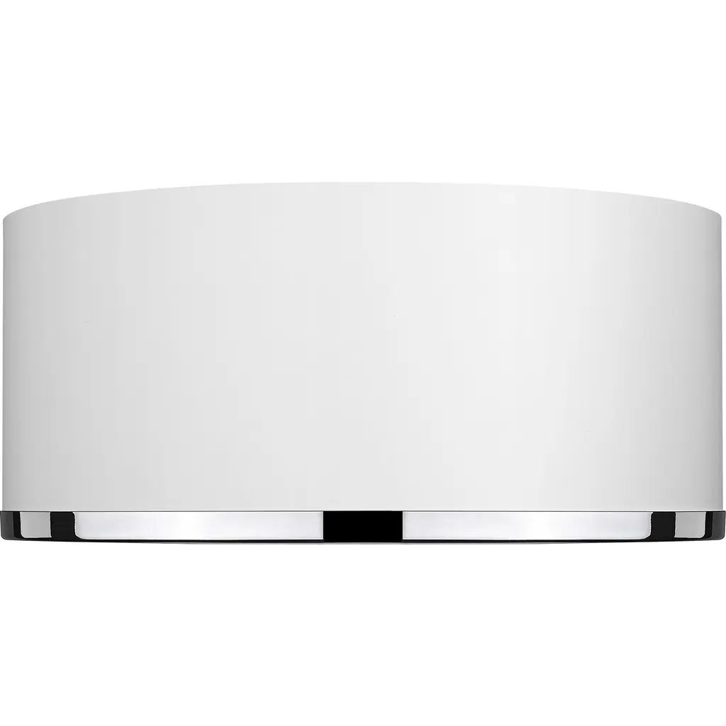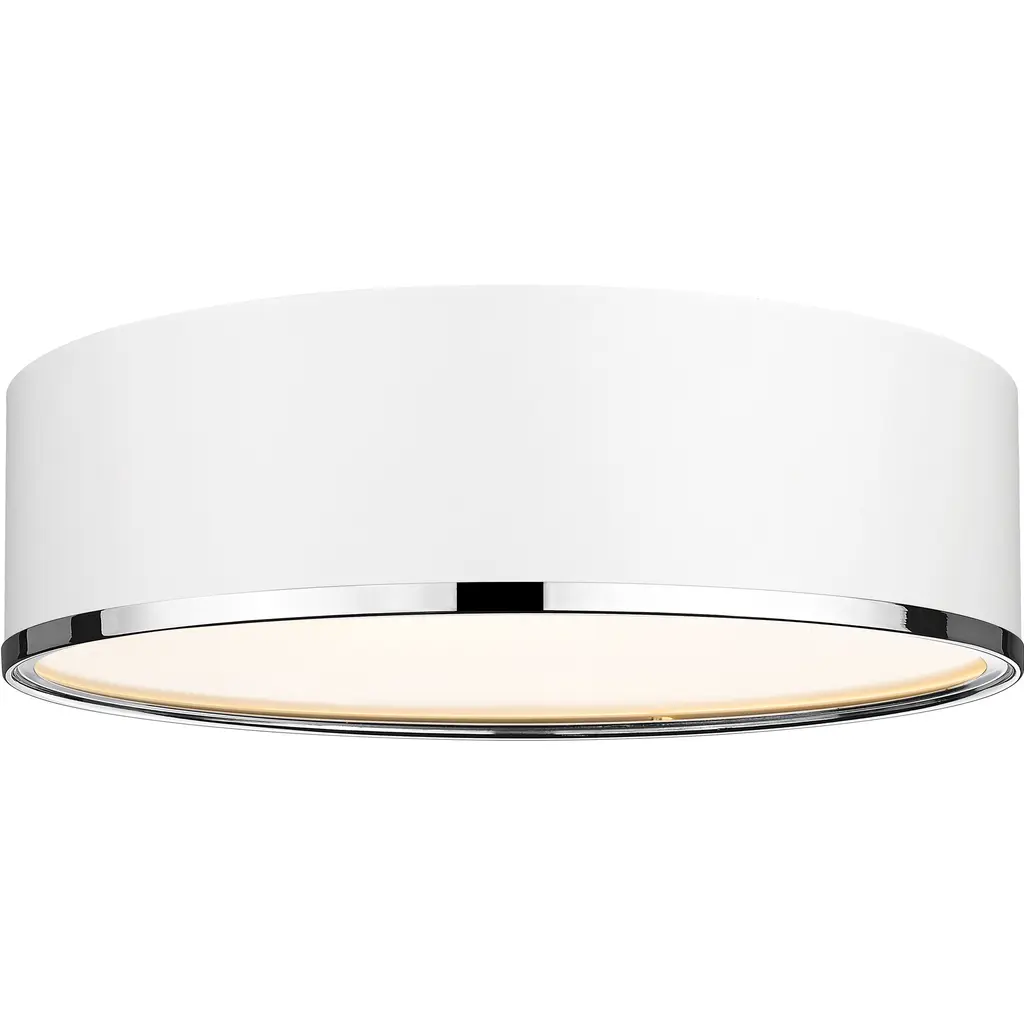 This two-tone metal flush mount light presents a sleek and smooth impression. Perfect for a hallway, home office, or small foyer, this matte white lamp with chrome trim is simplistic yet stylish.