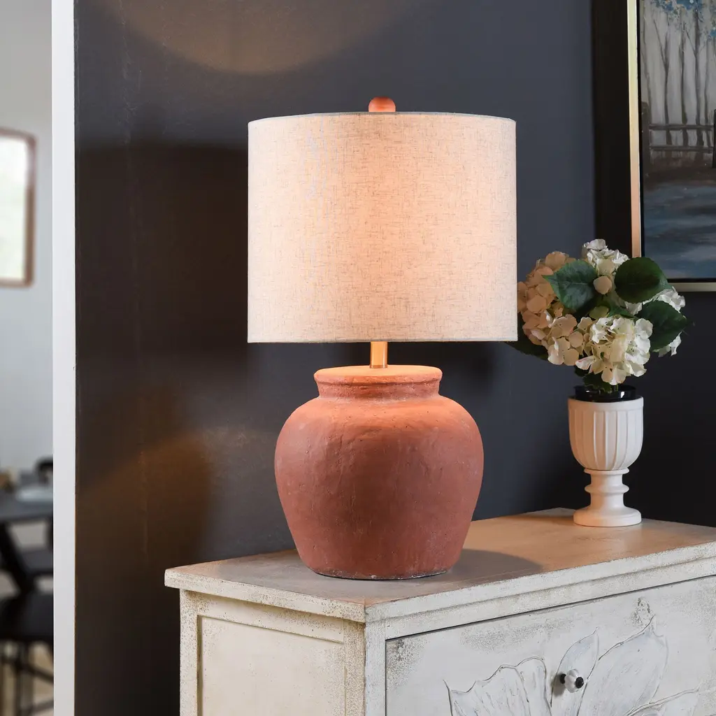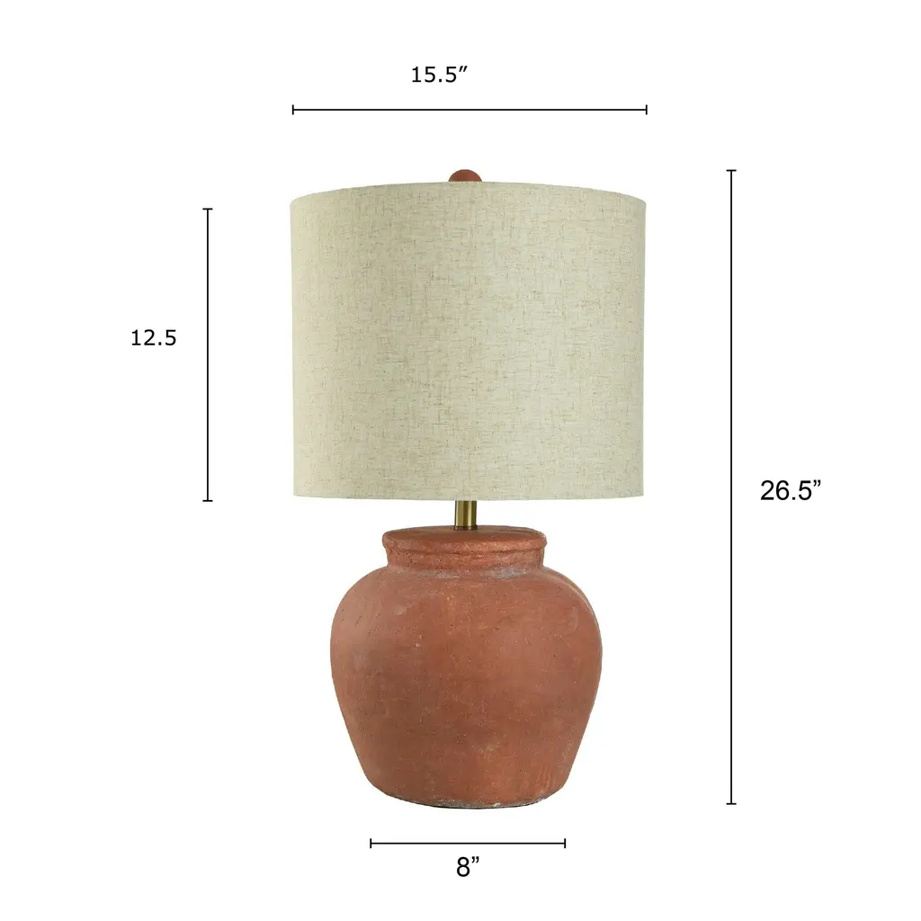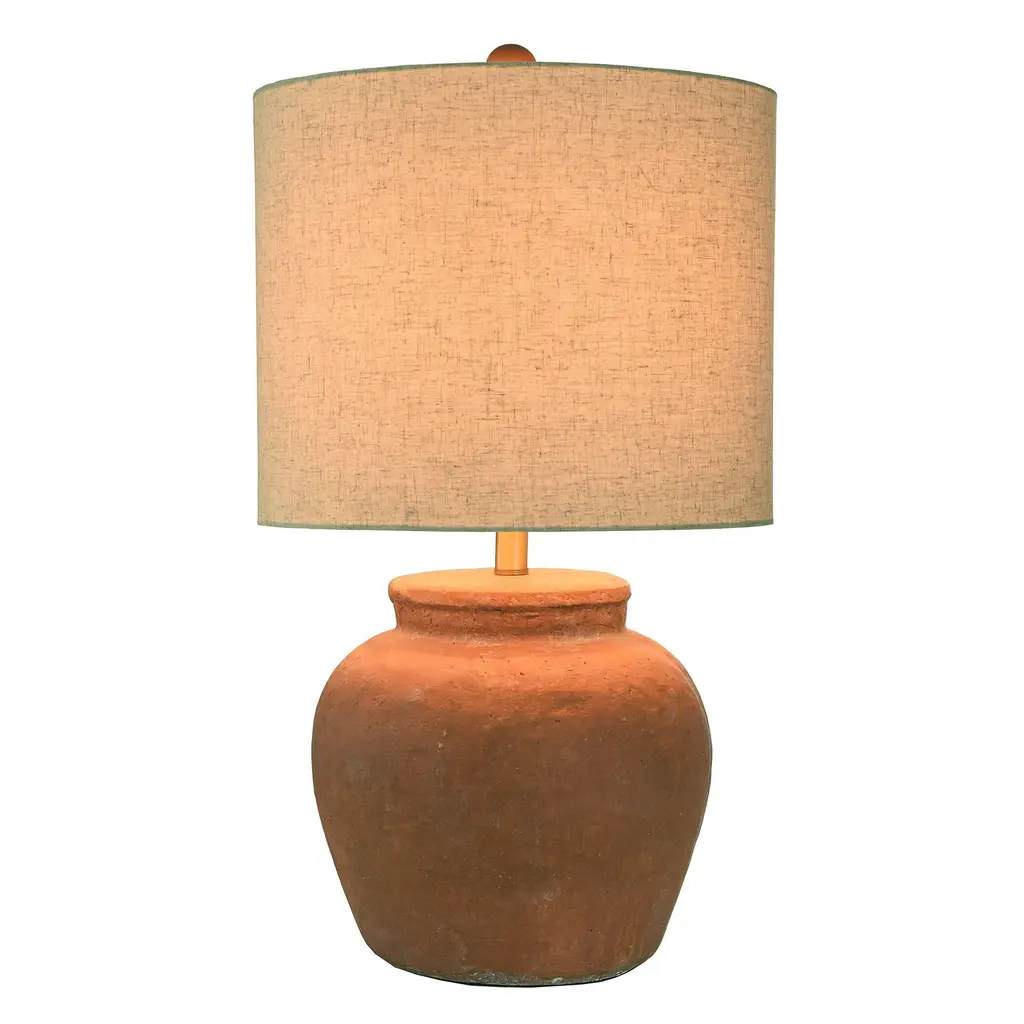 The Arlo Cotta Rustic Cement Table Lamp from StyleCraft is designed with raw edge cement in a matte finish tone to give it a bold modern appeal in a variety of spaces. This lamp features a three-way light and round drum shade with a matching finial. A favorite for the understated modern living room or bedroom.Beautifully rustic jug accent lamp.Round Hardback Drum Shade With Matching Finial150W 3-way bulb is required but not provided for its 3-way switch.Due to the production process, there may be minor variations in shape, size, color, and finish.The lamp size can be categorized as Medium - 22"-27"Color Options: Matte Black or TerracottaMaterial: Cement, Linen, SteelWeight (Pounds): 17.6Switch Type: 3WaySwitch Location: NeckSystem Type: Plug-InShade Length: 15.5 inchesShade Width: 15.5 inchesShade Height: 12.5 inchesCord Length: 60 inchesSocket Quantity: 1Bulb Shape: A21Socket Type: E26Light Bulb Included: NoFixture Dimmable: NoDue to lighting and monitor differences, actual colors and finishes may vary slightly from what appears online.