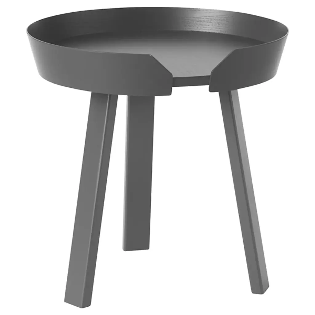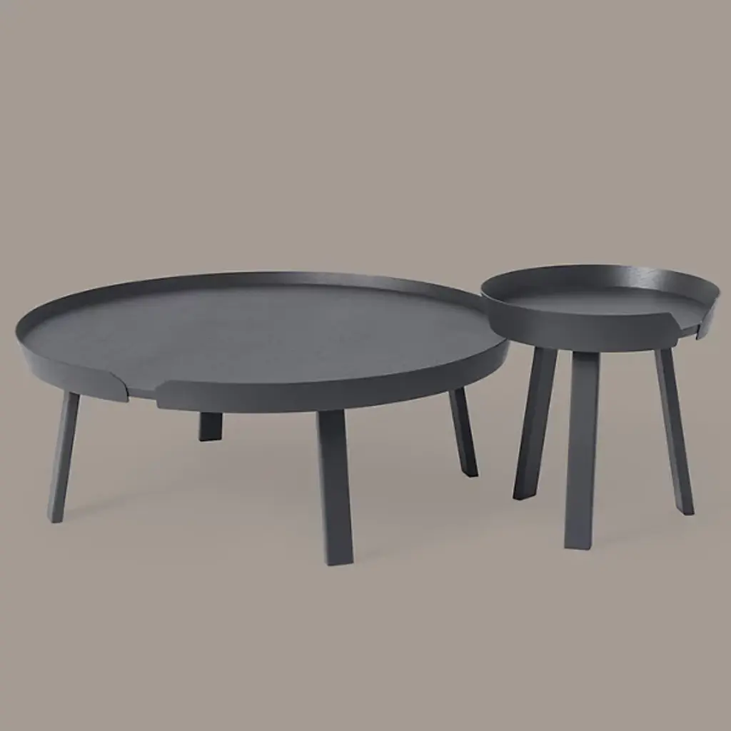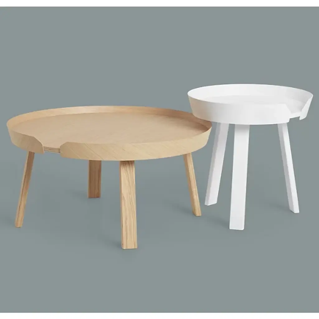 Add a stylish Scandinavian presence to inside living spaces with the Around Coffee Table from Muuto. A contemporary, clean-surfaced piece fashioned from smoothly-lacquered hardwood, it uses four angular legs to support a circular tabletop. It seats a shallow rim around the tabletop that bevels slightly outward, sweeping around the edge of the tabletop and nearly enclosing it, adding a touch of architectural texture while leaving a small space for lamp or phone cords to transit to the tabletop.