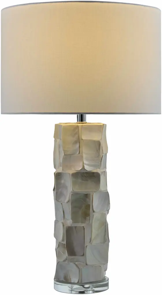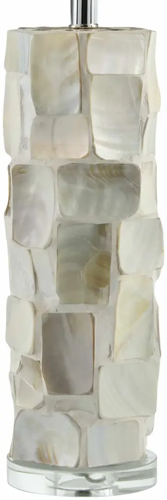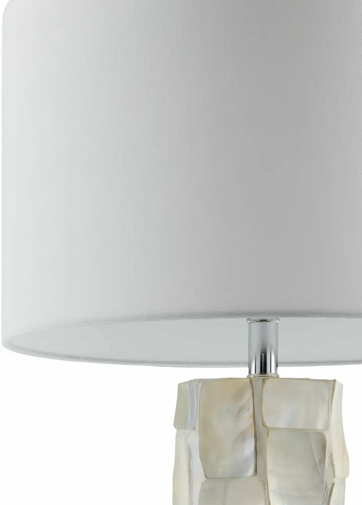 Collection: Arquillos Colors: Cream, Clear, White, Metallic - Nickel, Translucent Material: Body: Shell, Crystal / Base: Crystal / Shade (Outside): Linen / Shade (Inside): Polyester / Finial: Crystal Styles: Traditional Made In: China Lighting Type: Accent Table Lighting Base: Crystal Base Color: Clear Shade Material: Linen, Polyester Shade Color: White, White Cord Length: 6' Switch Type: 3-Way Number of Bulbs: 1 Socket Type: E-26 Bulb Wattage: 100W