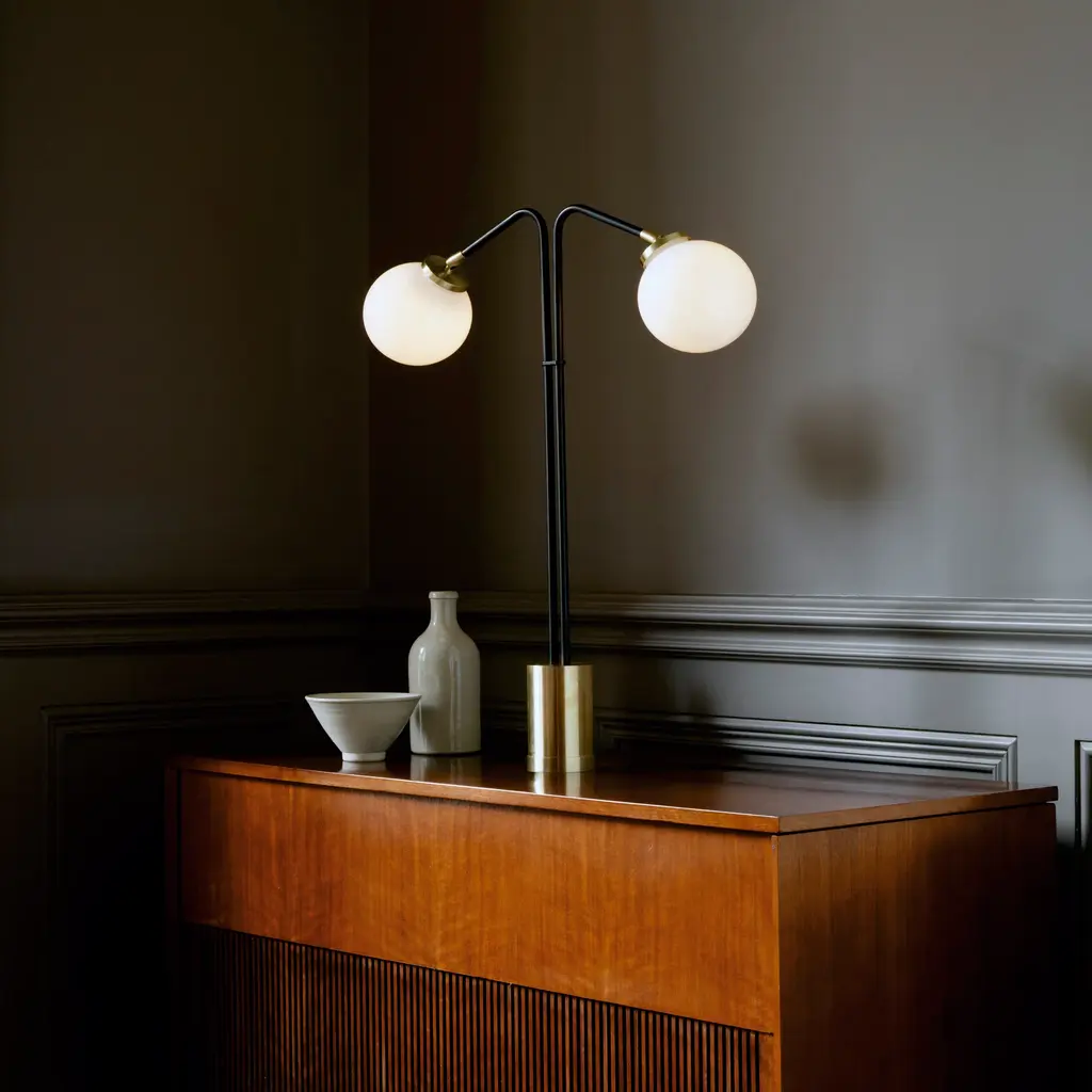 Add a touch of Italian mid-century modern elegance to your space with the Array Opal Table Lamp from CTO Lighting. The solid brass base and hand-blown glass opal shade create a sophisticated and artful design. Emitting even and ambient illumination, this sculptural lamp is perfect for side tables or desks. Highlights