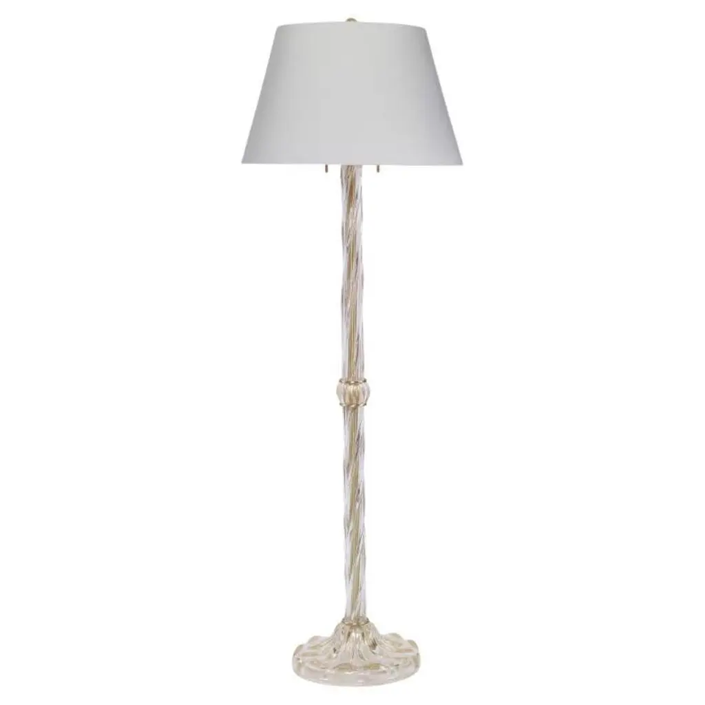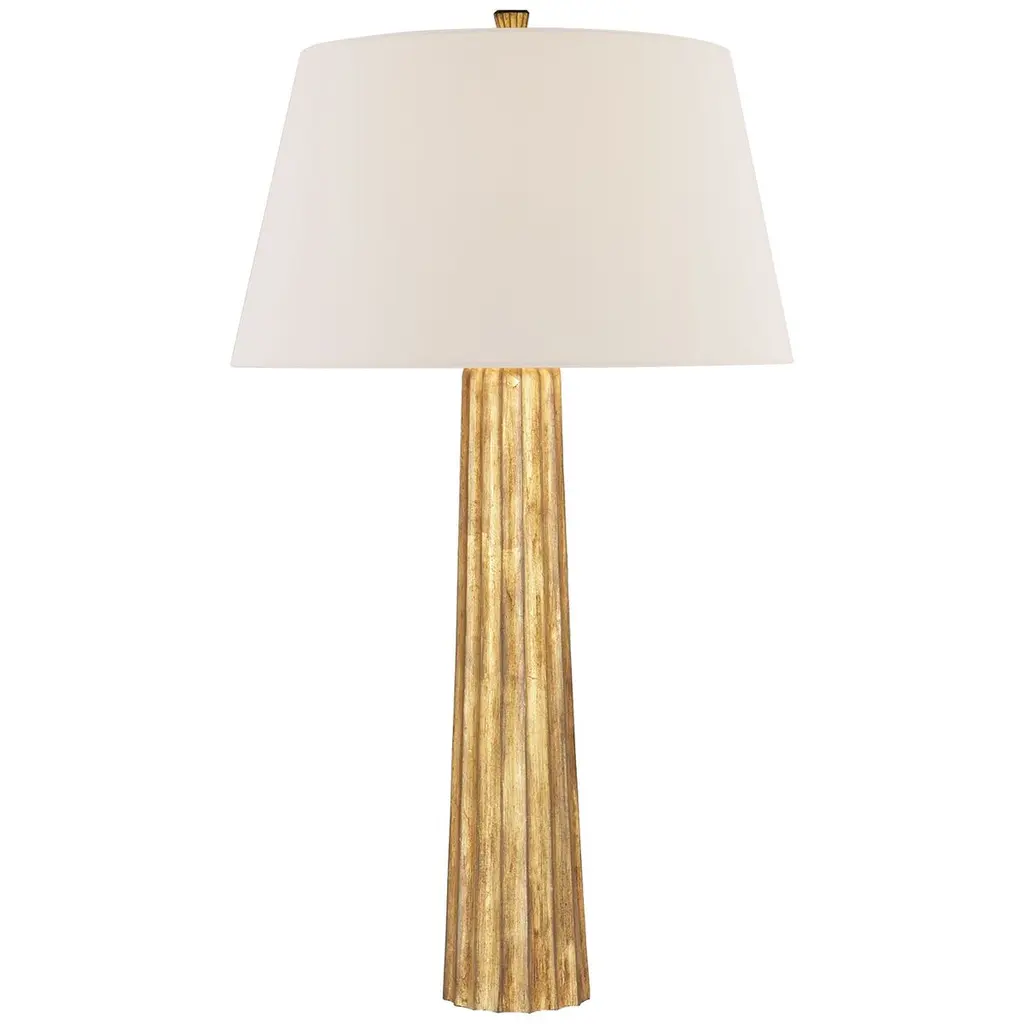 An elegant table lamp featuring a gilded iron stand with irregular fluted detailing and a natural paper shade. Styled with Art Deco glamour, this lamp looks gorgeous in a living room or bedroom, adding a sophisticated touch to a room.