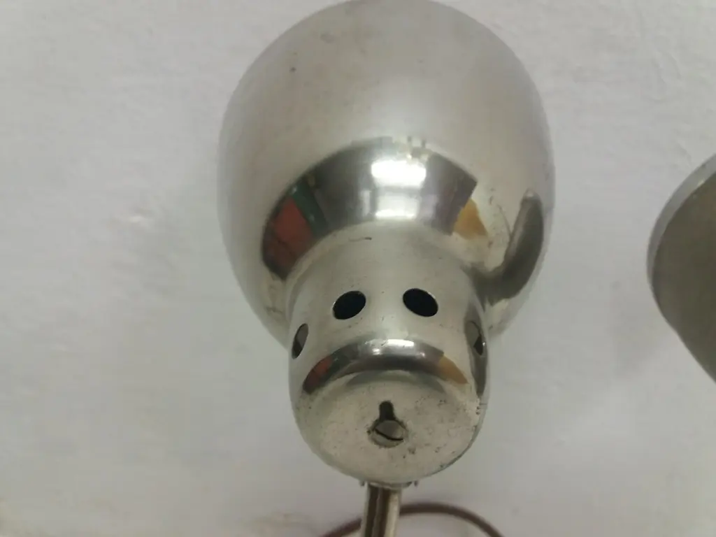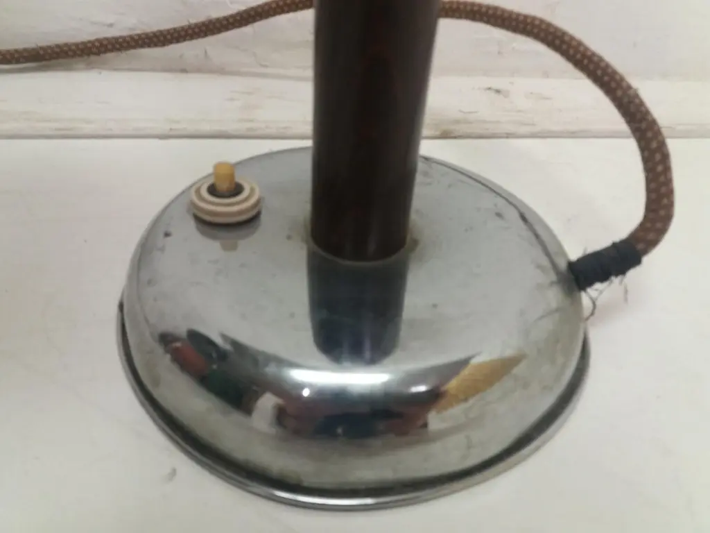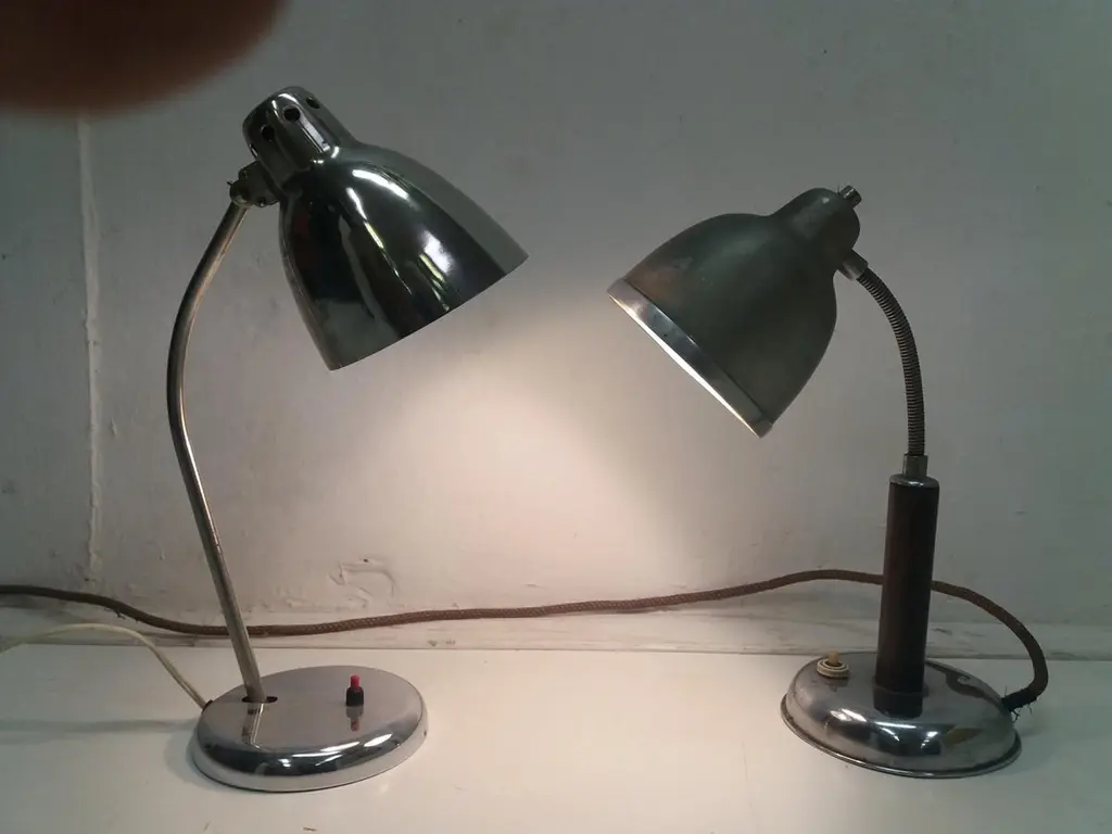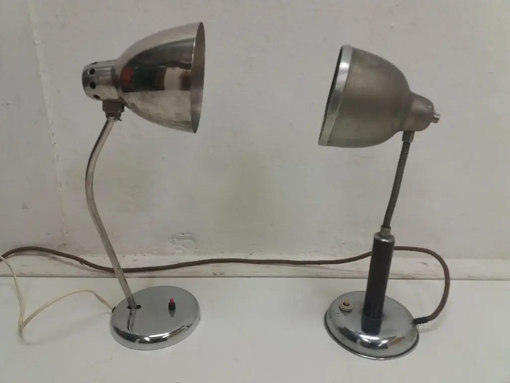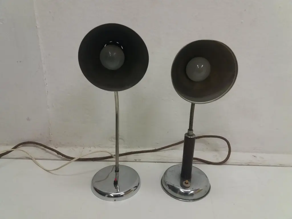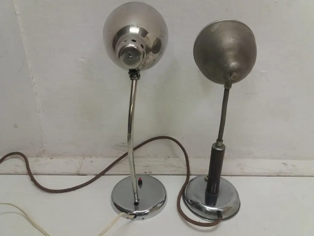 - Made in Czechoslovakia- Made of metal, chrome and wood- 1. lamp: all chrome, adjustable, 1935Dimension: H 51 x W 25 x D 16- 2.lamp: metal, wood, nykl, adjustable, 1940Dimension: H 46 x W 25 x D 16- Fully functional- Good original condition.