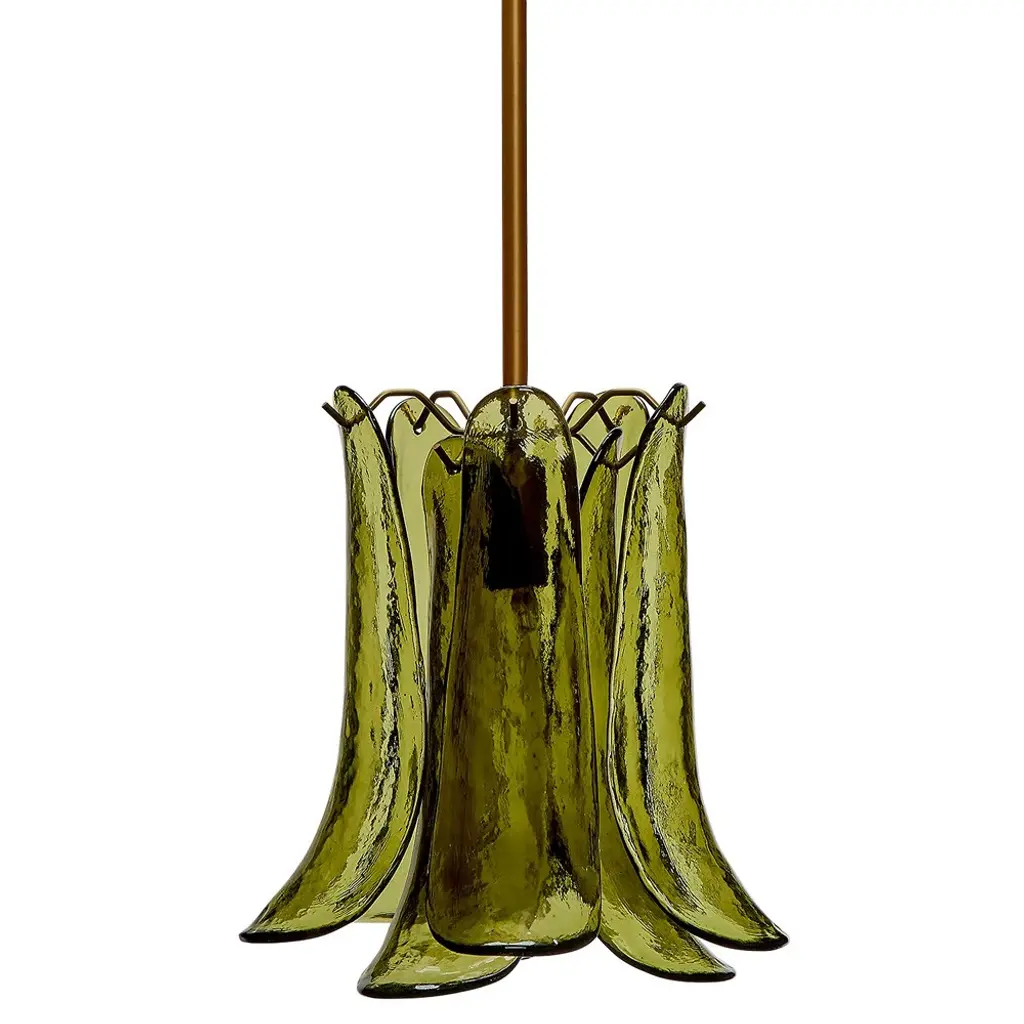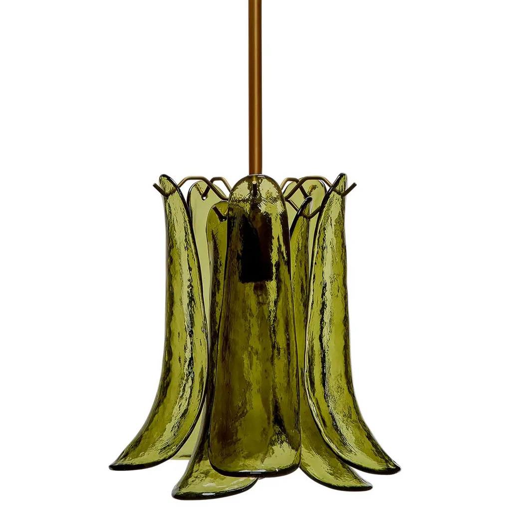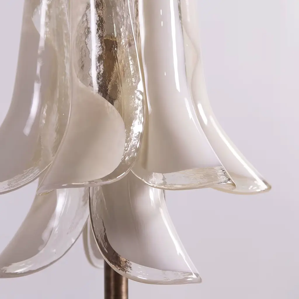 Table lamp with precious petals glass. The ivory colour blends with the crystal, creating an atmosphere of warm luminosity. Crafted entirely by hand, using traditional Venetian glassmaking techniques, this lamp creates retro atmospheres by softly reflecting the light. The burnished finish underlines the elegance of the design.
