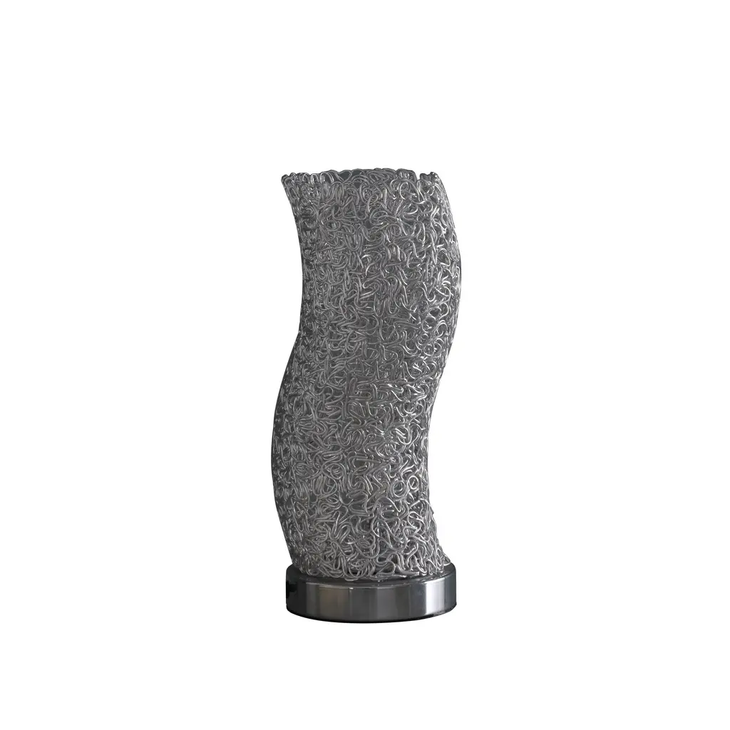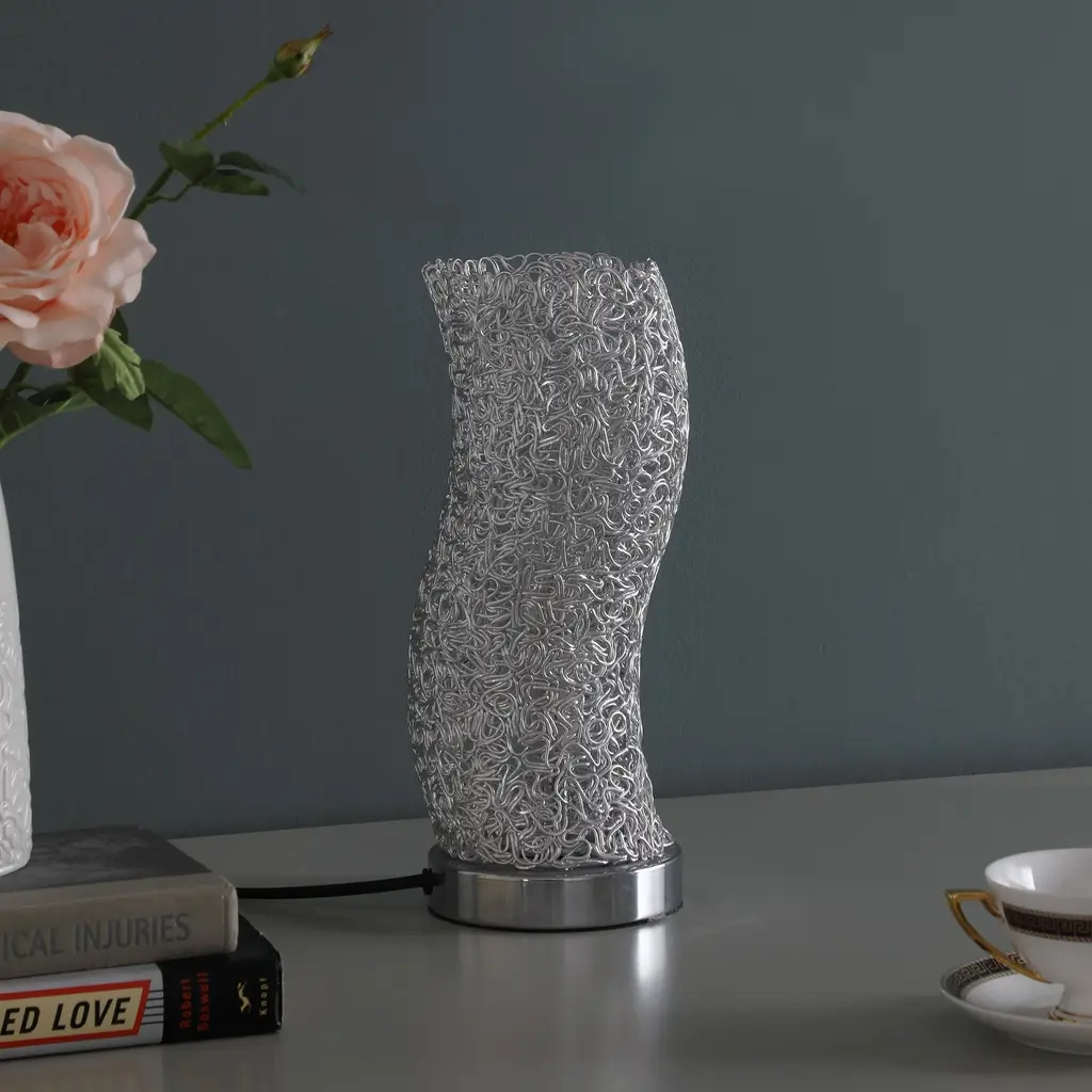 Add a contemporary finishing touch to your home with the Artemis Exposed Aluminum Wired Curve Table Lamp. Shaped like a wavy wine bottle, this stunning lamp features a gorgeous silver chrome base that beautifully contrasts with its round silhouette. The aluminum wire openwork detail provides a luxurious accent, while the one clear incandescent, CFL or LED bulb compatible (not included) illuminates the room with endless sparkle. Measuring 5"L x 4"W x 11"H, this table lamp showcases a durable aluminum metal body shape that you'll love for years.Features:Other sections: