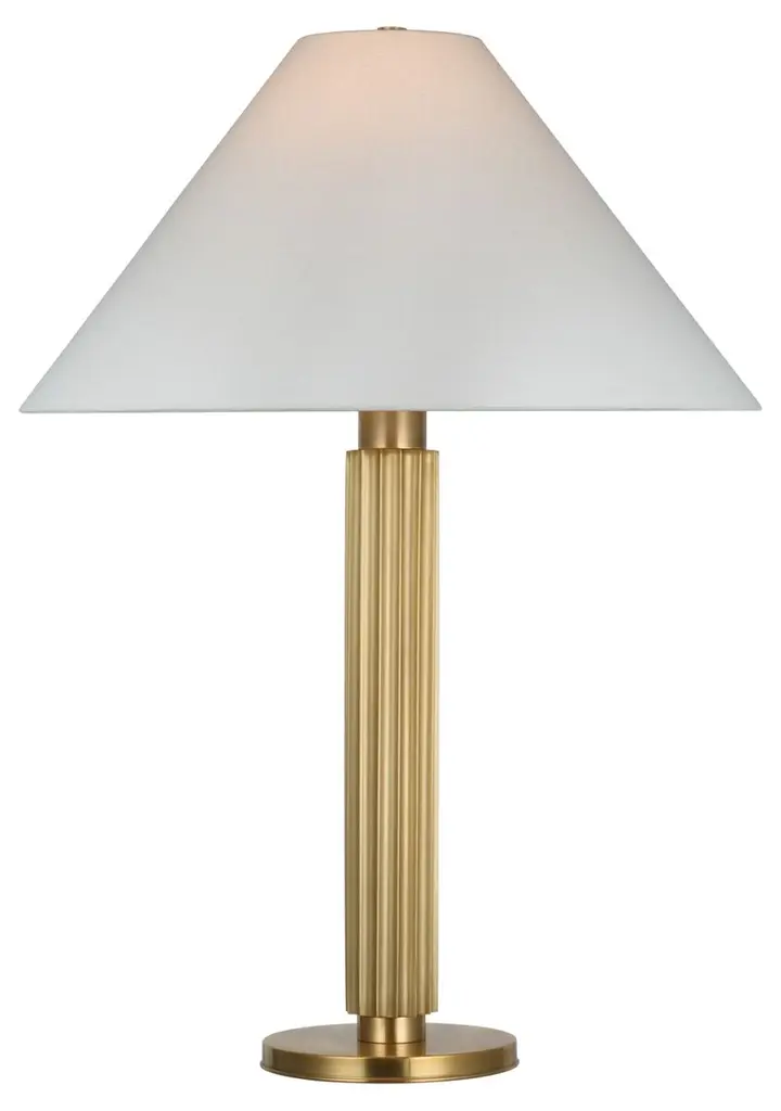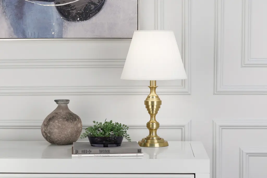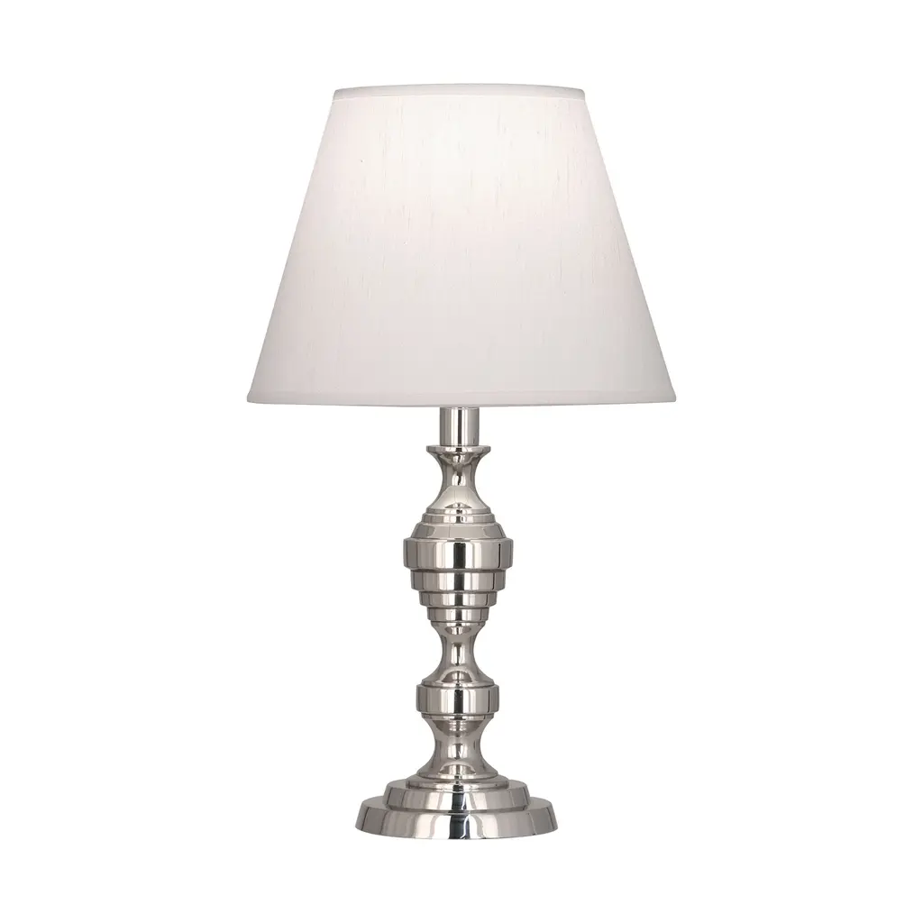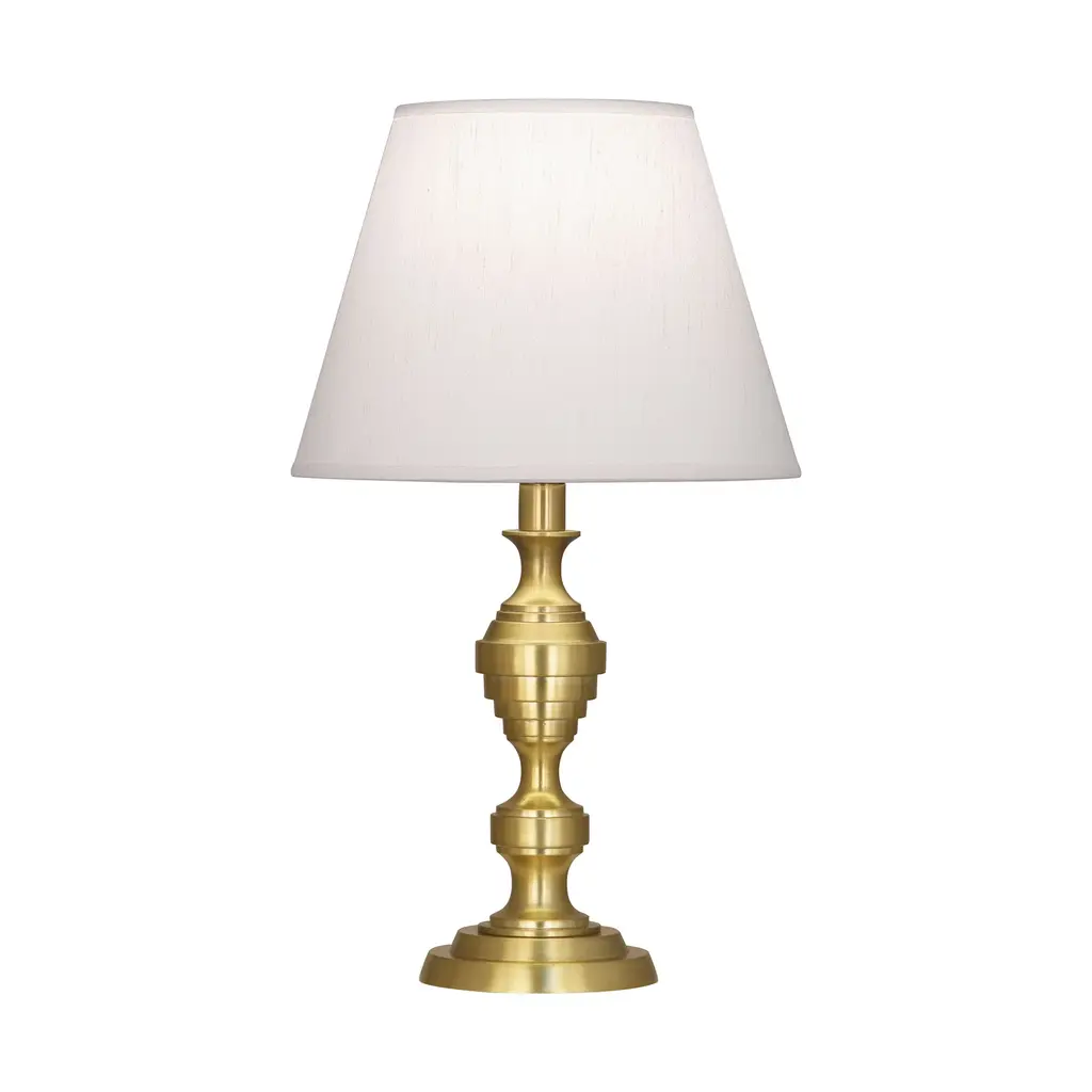 The Arthur Accent Table Lamp from Robert Abbey combines modern design with a regal flair, featuring a layered metal base and column adorned with circular grooves that draw the eye upward. Its rich metal finish is beautifully complemented by a smooth, classic tapered silk shade that casts a warm, ambient light. This lamp creates a captivating display of highlights, making it a sophisticated and elegant addition to any room. Highlights