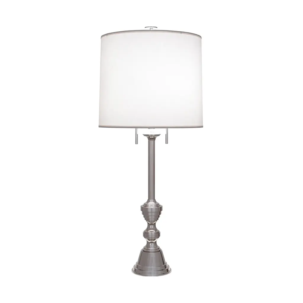 The Arthur Table Lamp from Robert Abbey elevates traditional candlestick design with a modern, refined touch. Its seamless metal base and column feature tapered shapes, elegant curves, and ring accents that draw the eye upward. Adorned with delicate pull chains, the spacious hardback fabric drum shade softly diffuses ambient light, while the intricate metalwork below catches highlights in graceful tiers. This sophisticated lamp adds a noble presence to any table or room. Highlights