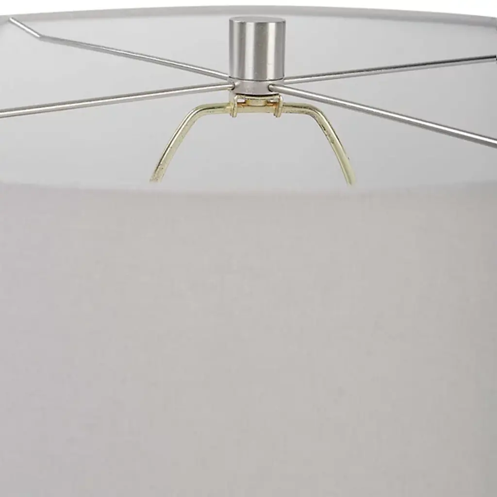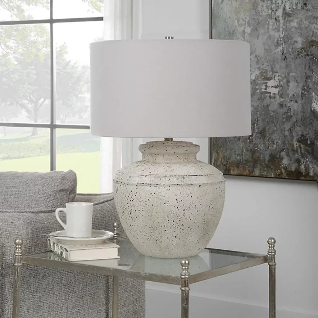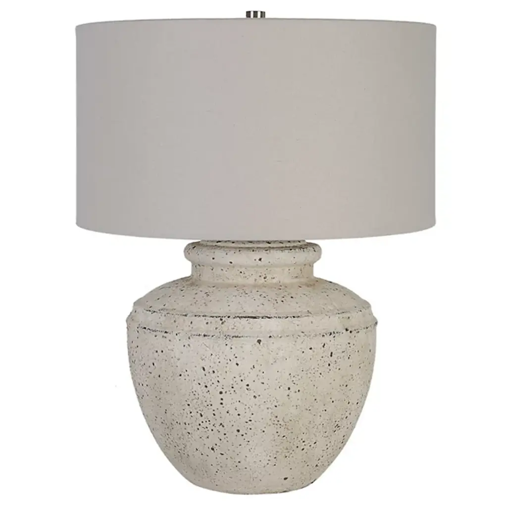 The Artifact Table Lamp from Uttermost draws inspiration from antique pottery. Designed by Carolyn Kinder, this rounded ceramic lamp features an aged stone finish with characterful distressing and dark undertones, complemented by plated brushed nickel steel accents. Its drum shade descends around the elevated lamping, wrapped in light gray linen fabric, adding sophistication. The inspired blend of transitional and Mid-Century Modern styles offers a subtle update to vintage design, able to add a textural enhancement to any interior decor.