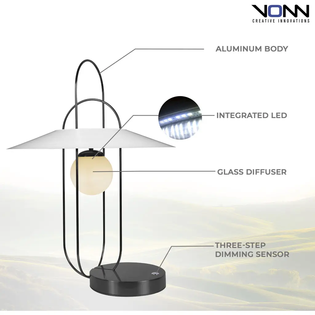 From VONN's Lyra Series, the VAT6271BL Integrated LED Table Lamp is a modern 24-inch fixture made from aluminum, iron, and glass, with an Integrated LED Shade. The shade consists of an Iron Plate with a Glass Ball. Emitting a soft white ambient light at 3000 Kelvin, it offers a touch sensor dimmer. With 230 Lumens brightness, an energy-efficient power consumption of 4 Watts, and CRI 90, this table lamp combines style and efficiency for versatile and customizable illumination.