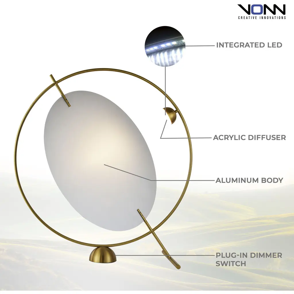 From VONN's Como Series, the VAT6241AB Integrated LED Table Lamp is a modern 20-inch fixture made from aluminum, acrylic, and iron, with an Integrated LED Shade. The shade consists of a 360 Degree Rotative Aluminum Plate. Emitting a soft white ambient light at 3000 Kelvin, it offers a dimming switch. With 114 Lumens brightness, an energy-efficient power consumption of 4 Watts, and CRI 90, this table lamp combines style and efficiency for versatile and customizable illumination.
