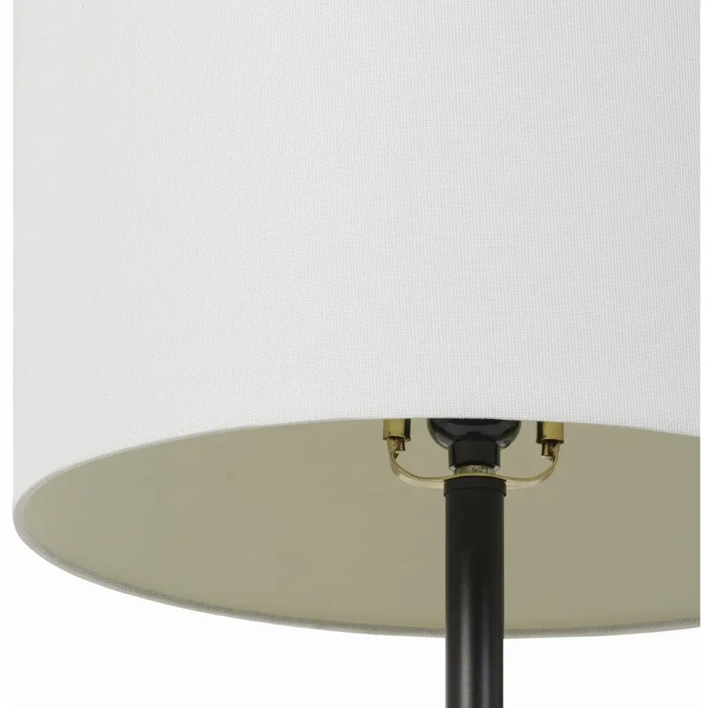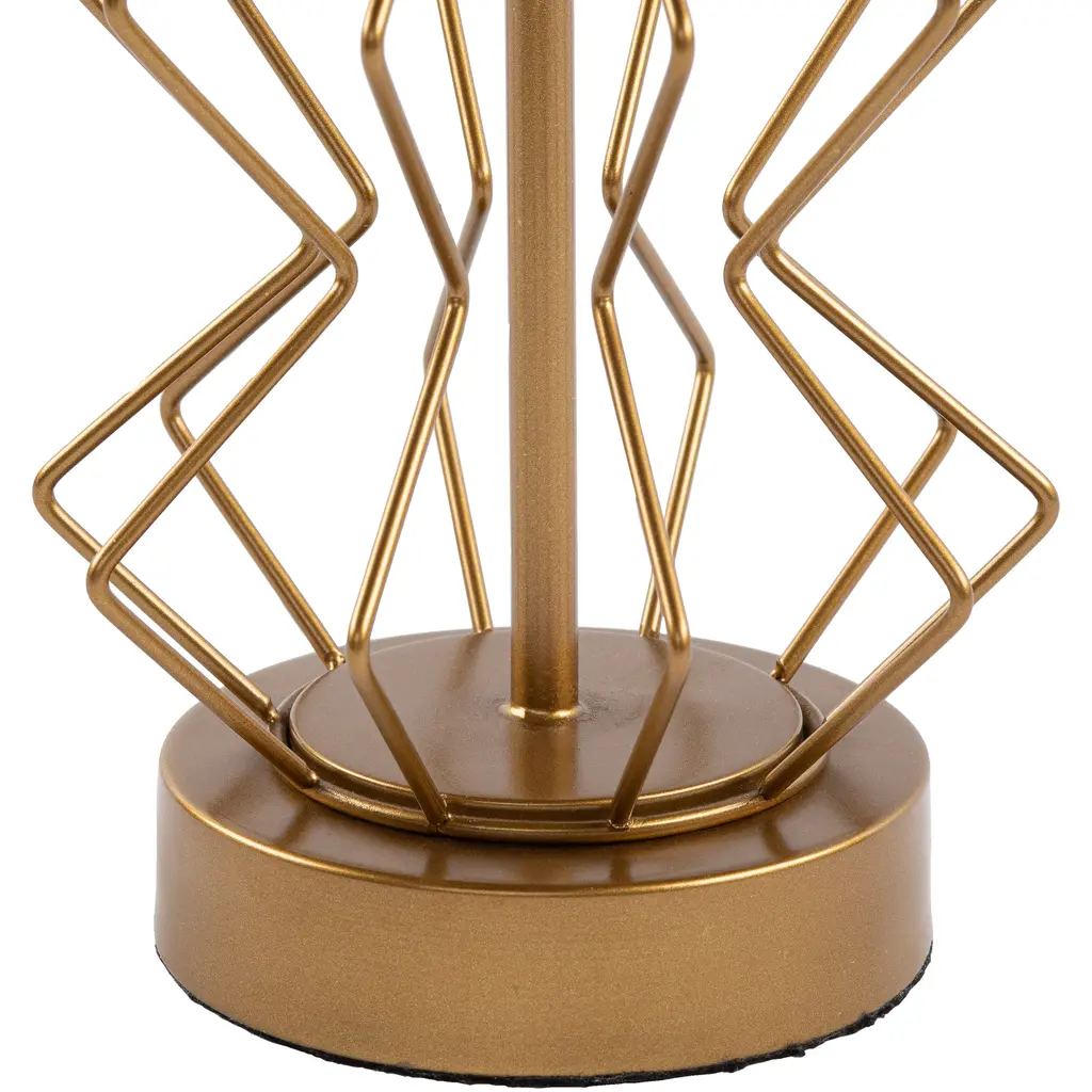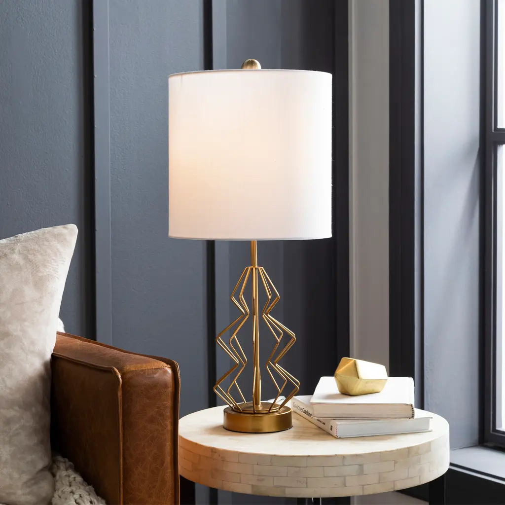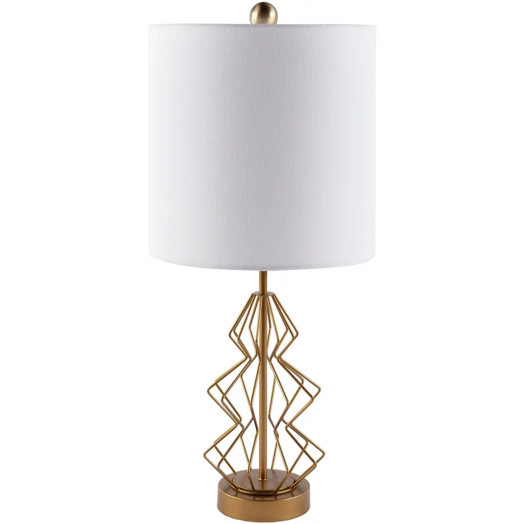 With its gold painted metal cage body in a geometric column shape, and white linen shade, the Simonne lamp brings an understated sensuality to any decor type. Standing at 23 inches high and featuring an on/off switch, this beautiful and functional lamp is a gorgeous addition to a living room, bedroom or hallway. Wipe clean with a damp cloth. Made in China.