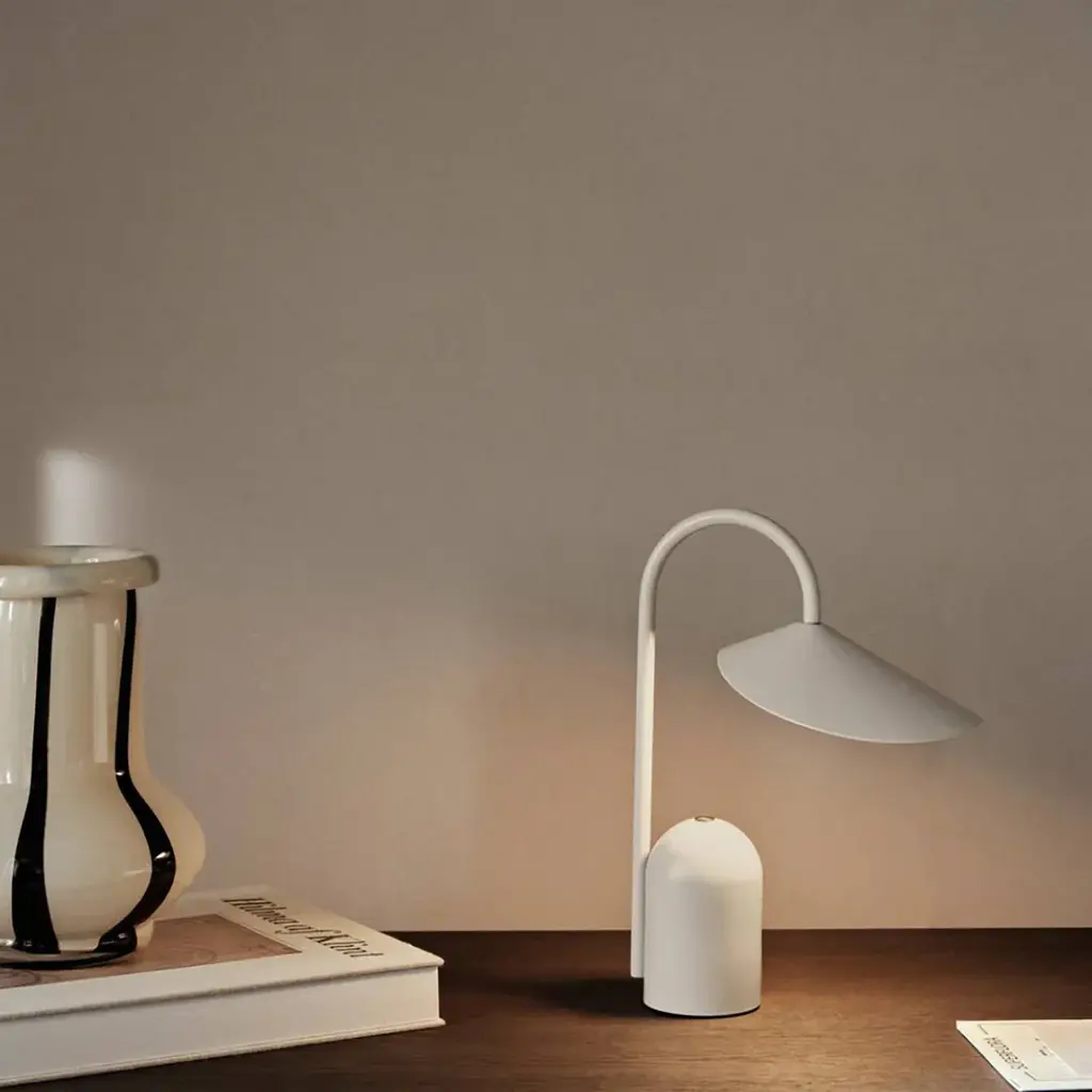 The Portable Lamp boasts an organic petal-shaped shade that floats above a curved metal stem. Its off-center structure is thoughtfully balanced, and the matte, off-white interior of the shade softly diffuses the light. Made from durable powder-coated iron and aluminum, this compact lamp is rechargeable via USB-C, making it perfect for portable use. Additionally, it features a three-step touch dimmer for adjustable lighting.
