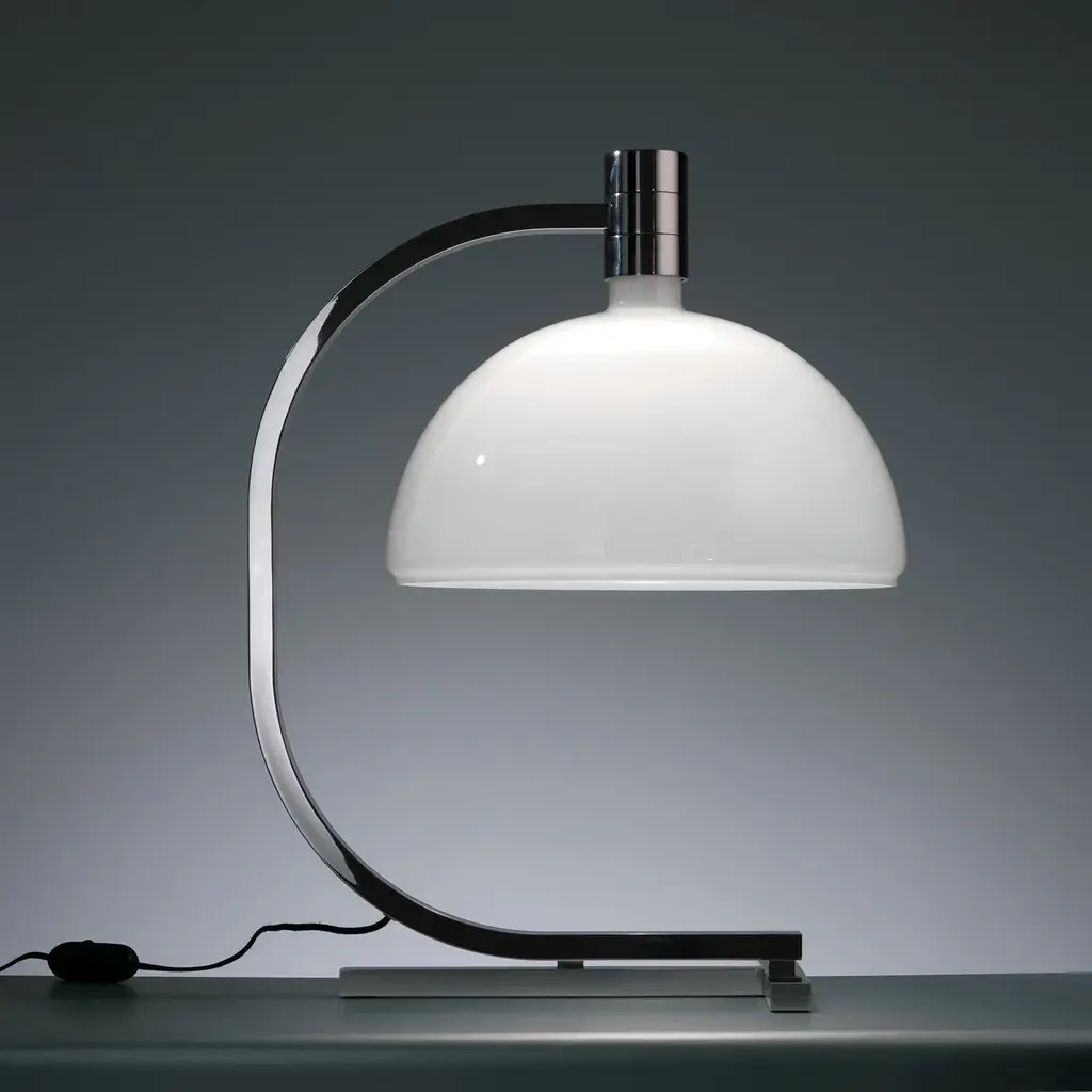 Table lamp with structure in chromed or black chromed metal. Cup-shaped diffuser, in opal white glass. Flood beam distribution, dimmer on the cable. Features