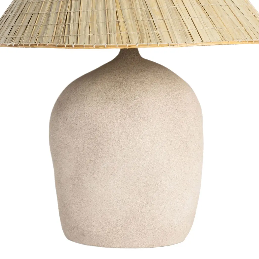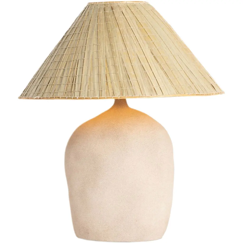 This table lamp's Talavera pottery body is rich in artisanal warmth. The shade, made of palms, adds to the laid-back elegance.