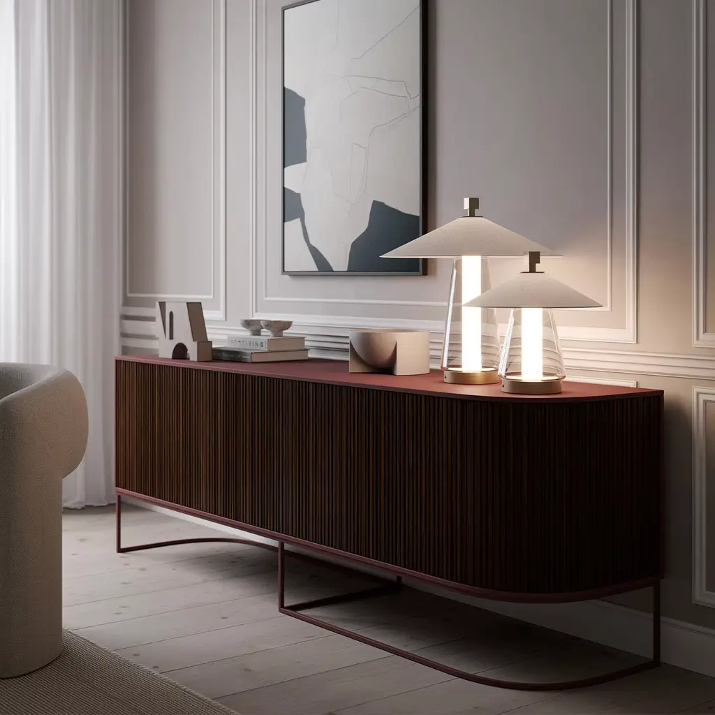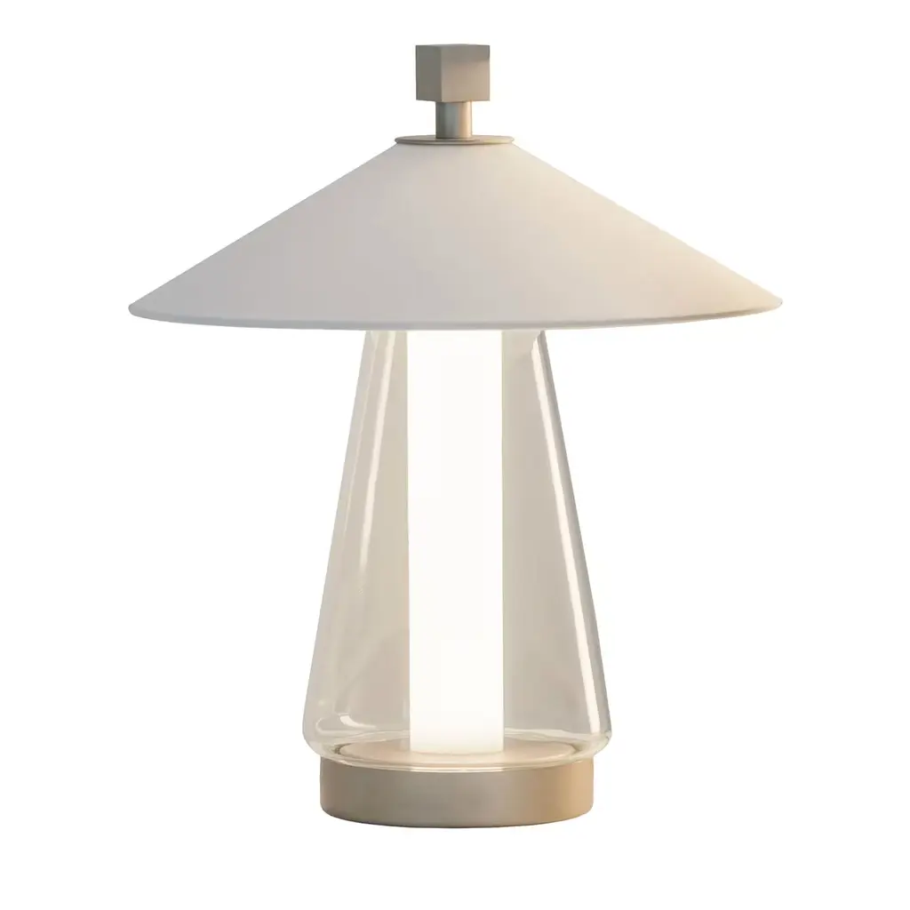 The Asia Table Lamp features a sleek frame in satin golden nickel, complemented by a white cotton shade that softly diffuses light. An opal white glass diffuser and a clear glass stem enhance the lamp's elegant design. Its refined details and balanced proportions provide a sophisticated ambiance for any spaces. Designed by Federico Peri.