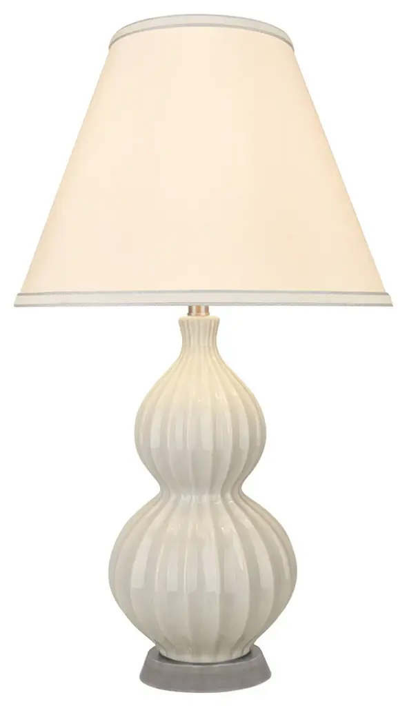 Aspen Creative is dedicated to offering a wide assortment of attractive and well-priced portable lamps, kitchen pendants, vanity wall fixtures, outdoor lighting fixtures, lamp shades, and lamp accessories. We have in-house designers that follow current trends and develop cool new products to meet those trends.Product Detail:• Ceramic table lamp in sand• Lampshade color & type - White with light blue trim on top and bottom, silk fabric, hardback empire shaped lamp shade | Lamp shade size - 7" top x 14" bottom x 11" slant height• ON/OFF switch, Uses a medium base light bulb, 60 watt max, Light bulb not included, UL Listed• Our hardback shades use Virgin Styrene backing board to produce a warm, natural & smooth light - more appealing than shades made with recycled Styrene board that can crack & yellow over time.