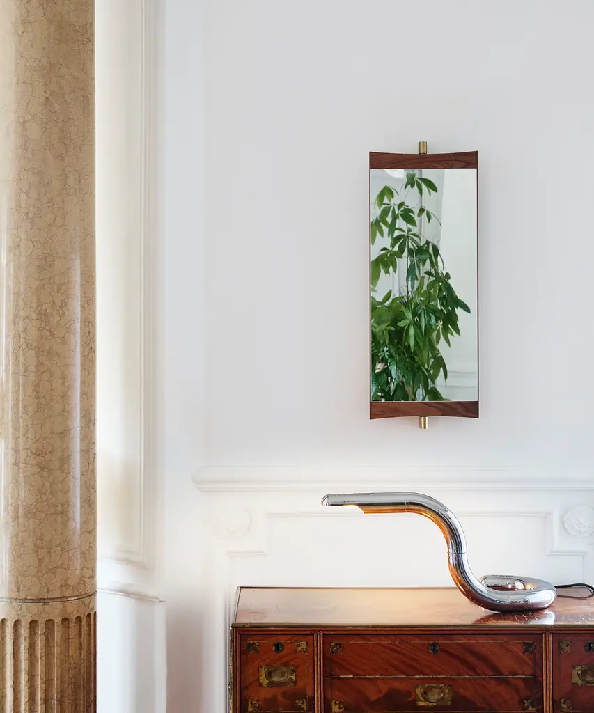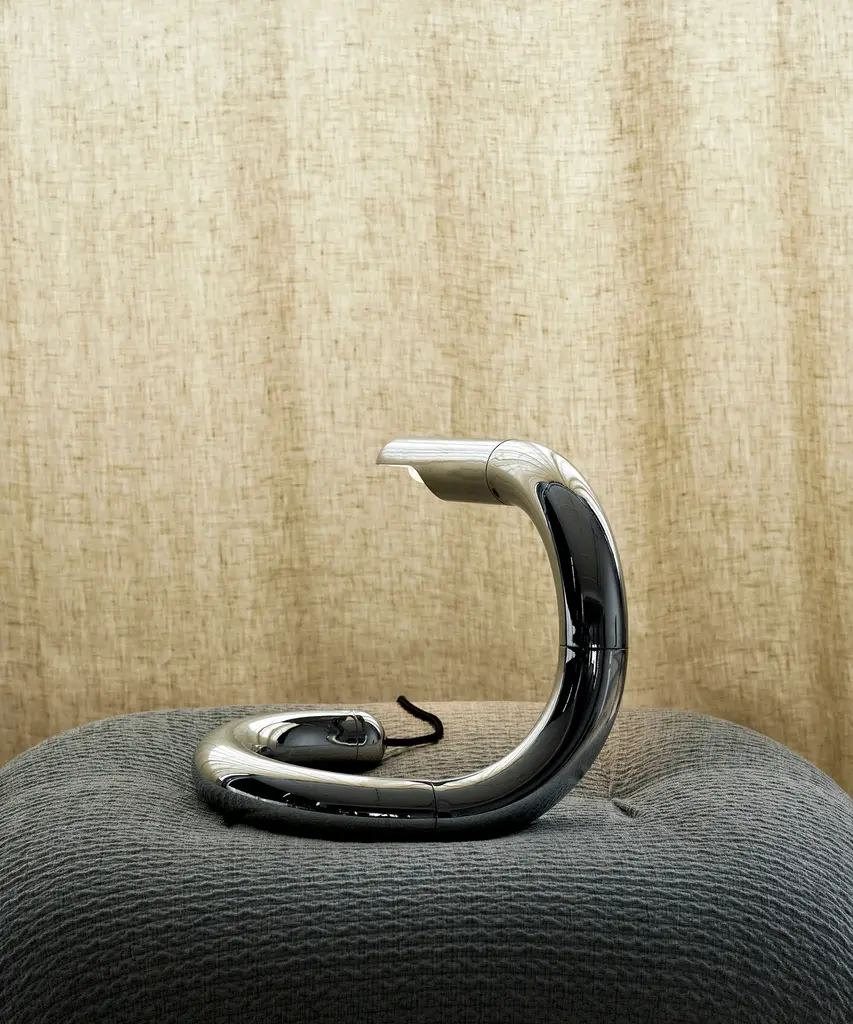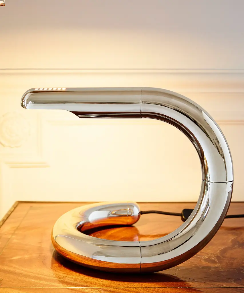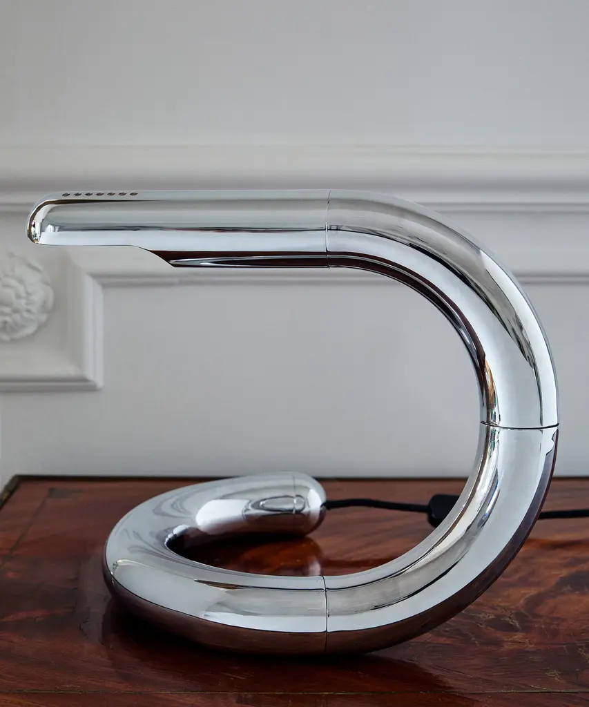 Serpentine in shape, beautifully balanced and gleaming like a jewel, the Aspide Lamp by Gianfranco Frattini is both a brilliantly practical piece of industrial design and an irresistibly playful design statement. First developed in 1970, the Aspide is a highly adjustable table lamp that looks like no other light before or since, but still expresses the material and aesthetic tastes of its time. The Aspide was designed as a versatile task lamp that can be manually adjusted to create either direct light for work or reading, or turned toward the wall to create a softer, ambient glow; in fact the body of the lamp can be manually rotated 350º in both the neck and the head.Produced by Danish design publisher, Gubi.