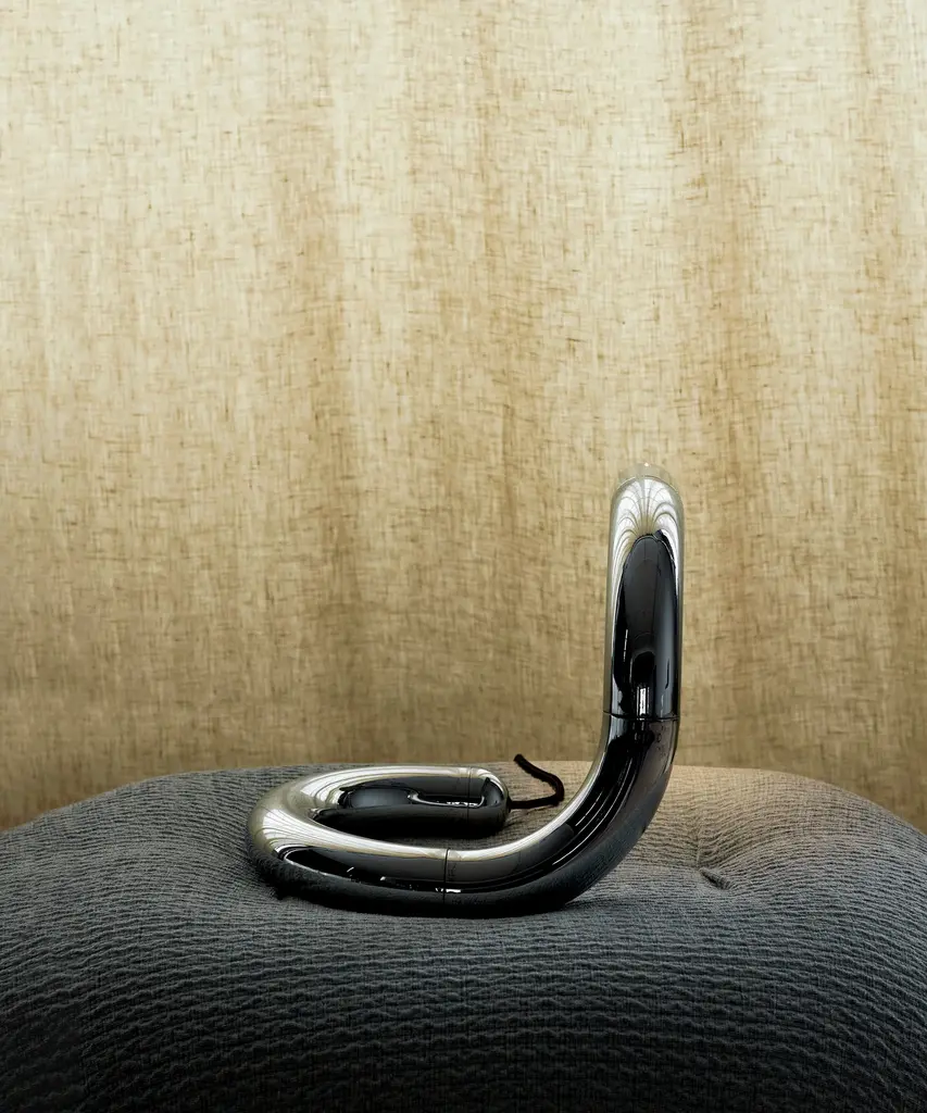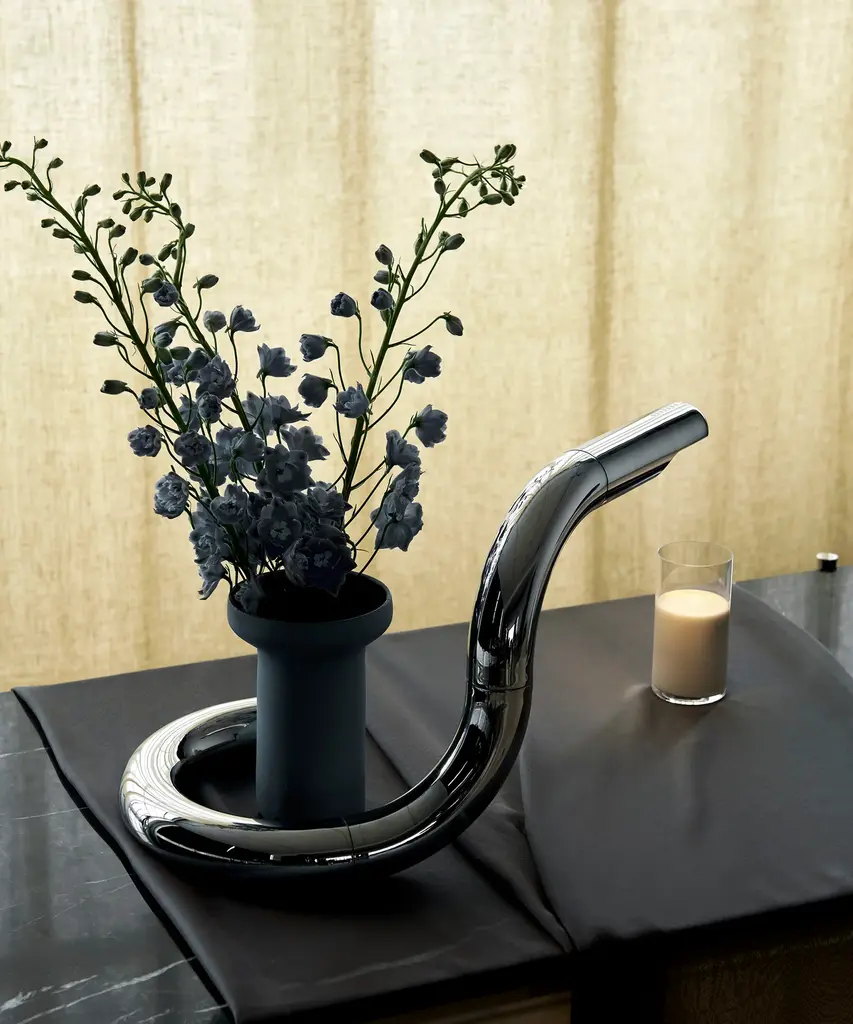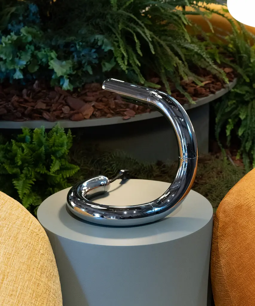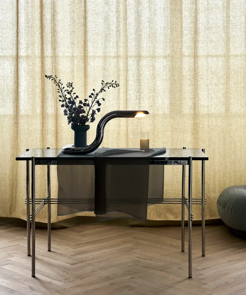 Serpentine in shape, beautifully balanced and gleaming like a jewel, the Aspide Lamp by Gianfranco Frattini is both a brilliantly practical piece of industrial design and an irresistibly playful design statement. First developed in 1970, the Aspide is a highly adjustable table lamp that looks like no other light before or since, but still expresses the material and aesthetic tastes of its time. The Aspide was designed as a versatile task lamp that can be manually adjusted to create either direct light for work or reading, or turned toward the wall to create a softer, ambient glow; in fact the body of the lamp can be manually rotated 350º in both the neck and the head.Produced by Danish design publisher, Gubi.