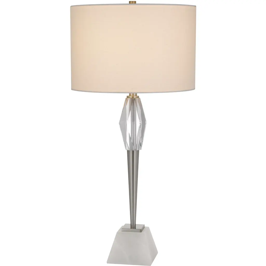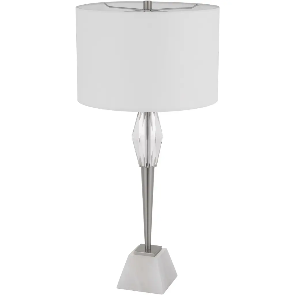 This elegant metal table lamp is a stylish addition to any living room, office or bedside space. It features a slim torch style brushed steel metal body with faceted crystal accents. A solid square marble weighted base completes the look.