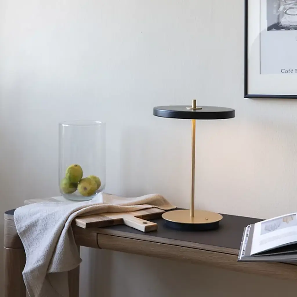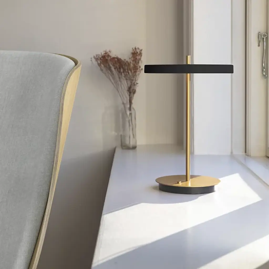 The Asteria Move LED Rechargeable Table Lamp by UMAGE brilliantly combines style and functionality. It is designed by Soren Ravn Christensen. Blending Scandinavian artistry with contemporary flair, this table lamp is a statement of sophistication. Crafted from steel and aluminum, Asteria embraces a streamlined aesthetic that integrates into diverse interior styles. The lamp features a disc-shaped framework housing high-quality acrylic emanating an integrated LED glow, exuding a sense of beauty and durability.