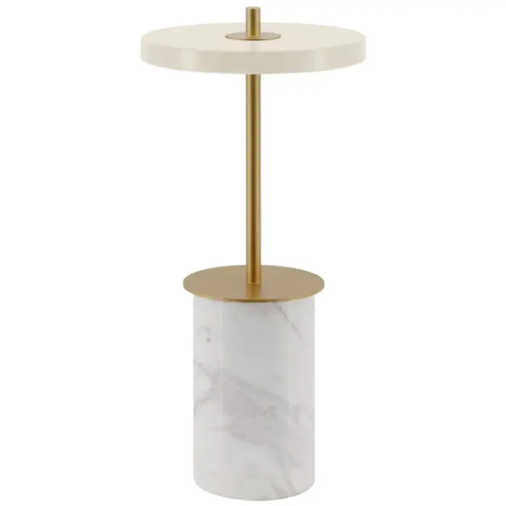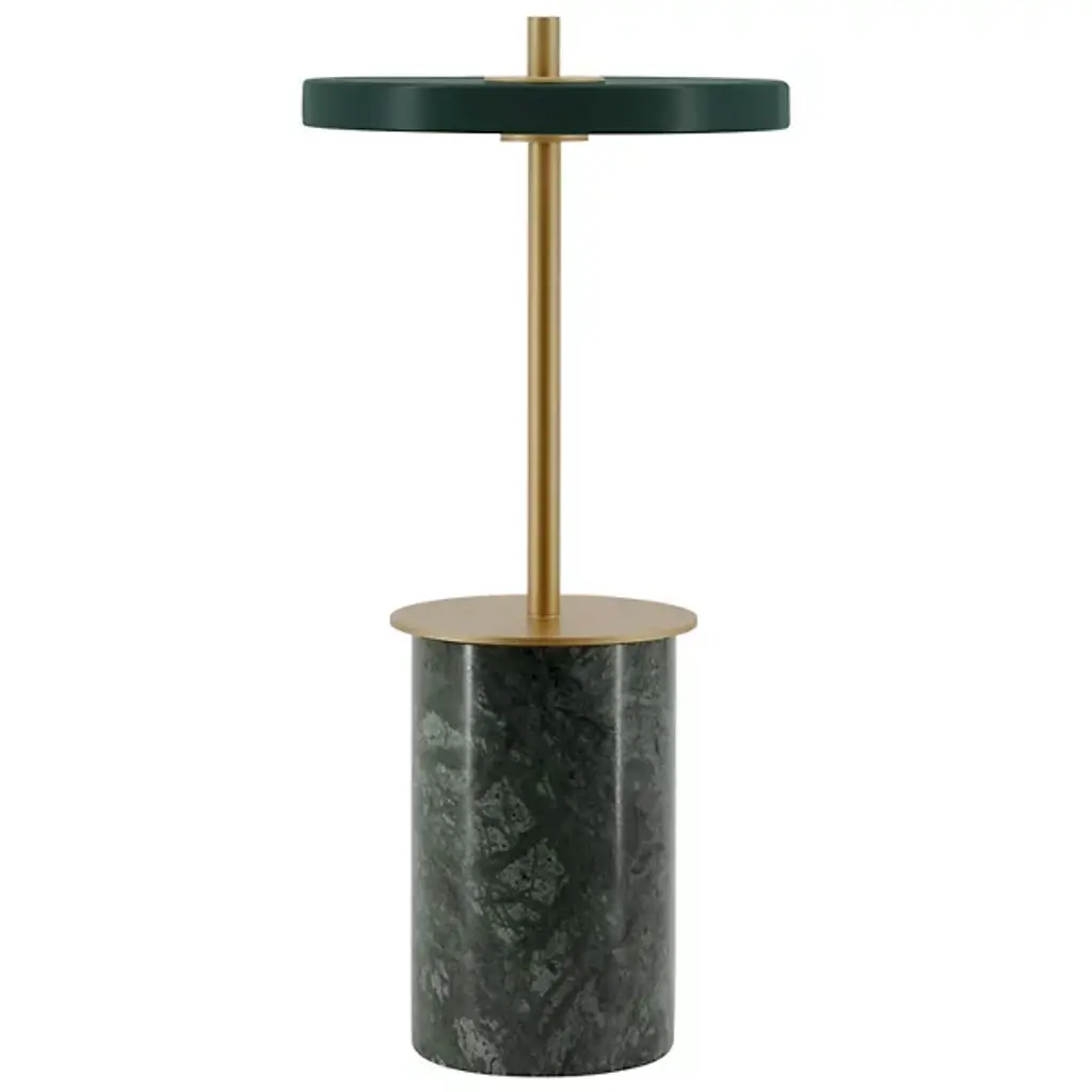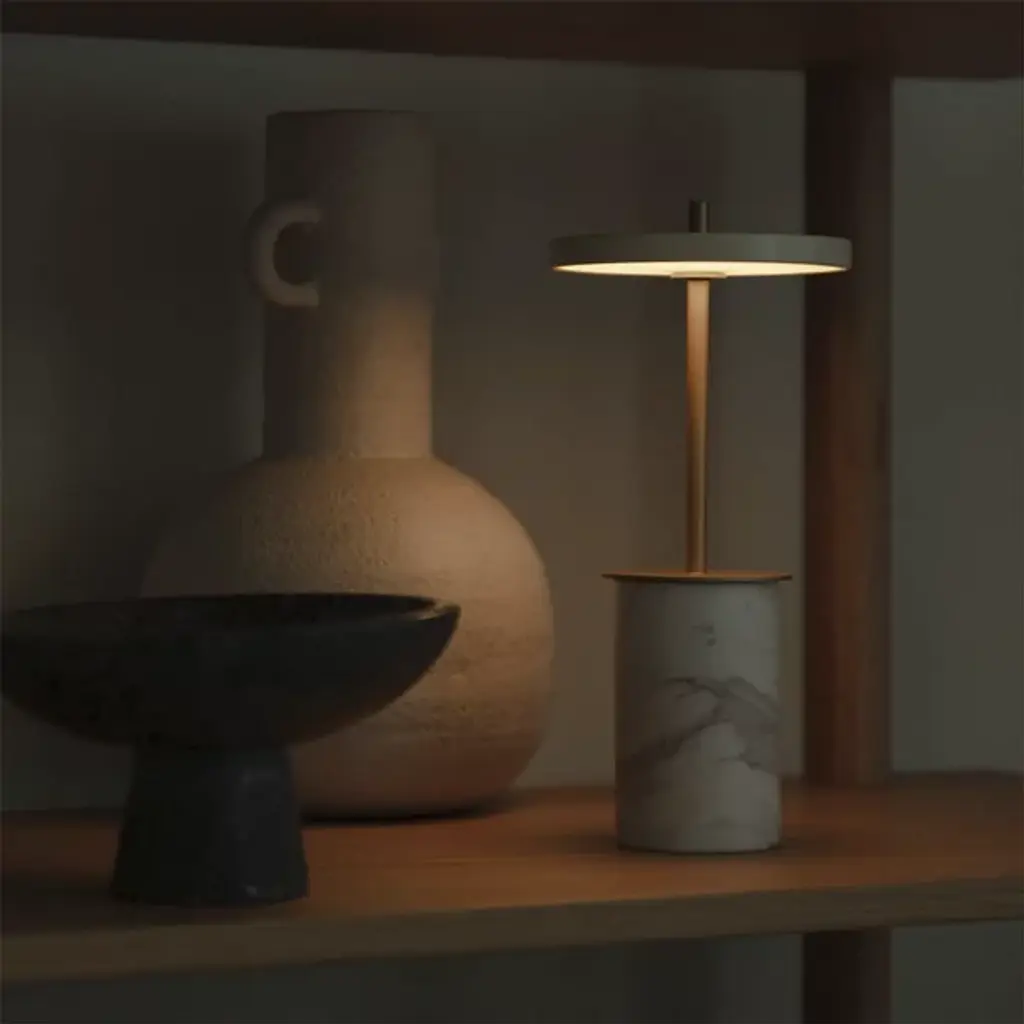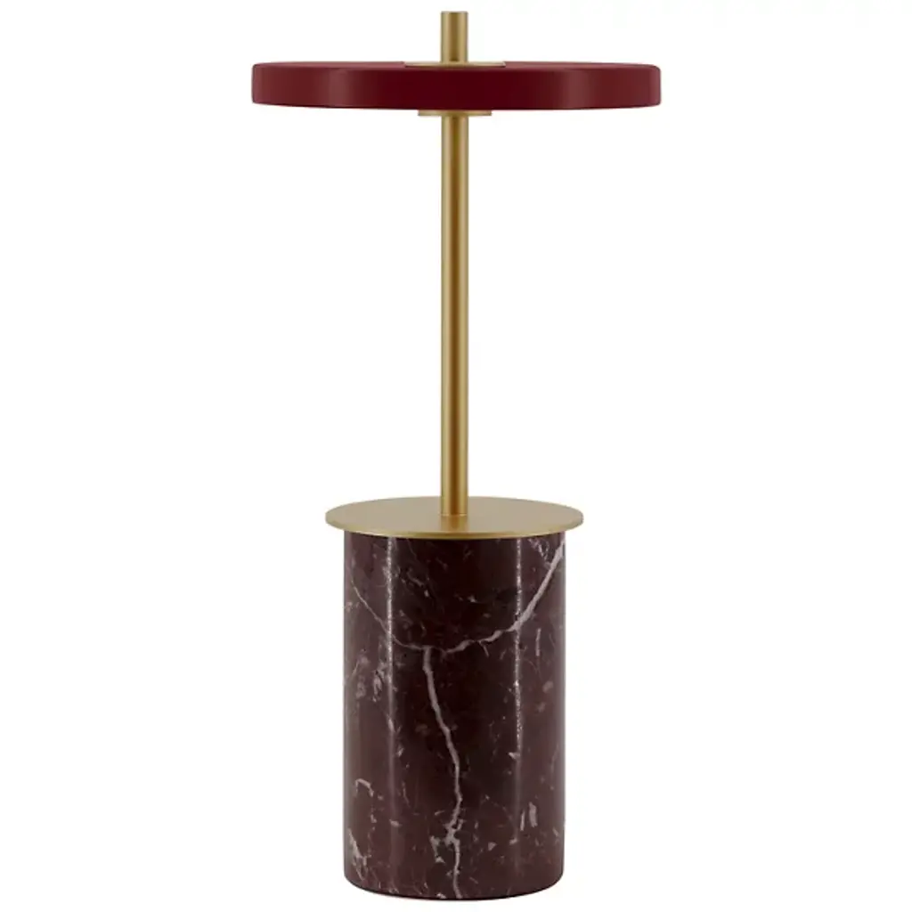 Asteria Move Mini LED Rechargeable Table Lamp offers bright light and luxury on the go, using a layered form to support a small, efficient light. Rich materials add a classic edge to the design created by Soren Ravn Christensen, starting with an interchangeable marble column base that adds unique personality, containing a lithium-ion battery. A slim steel stem ascends from the column, threading through a disc shade with an efficient LED, offering four different levels of intensity via a touch dimmer on the base. The organic marble finish expresses a vibrant character, matching classical elements with a grounded design.