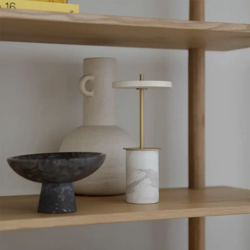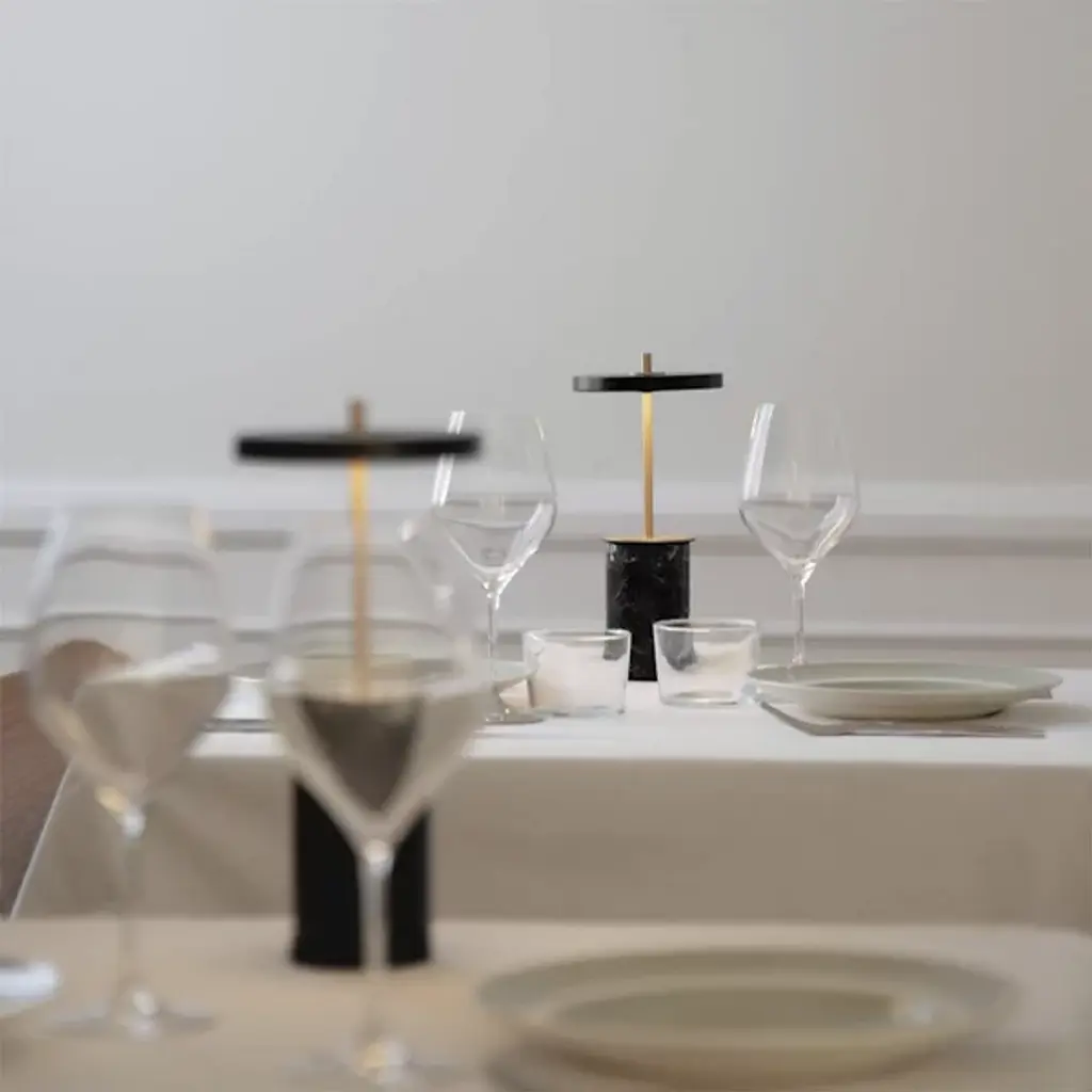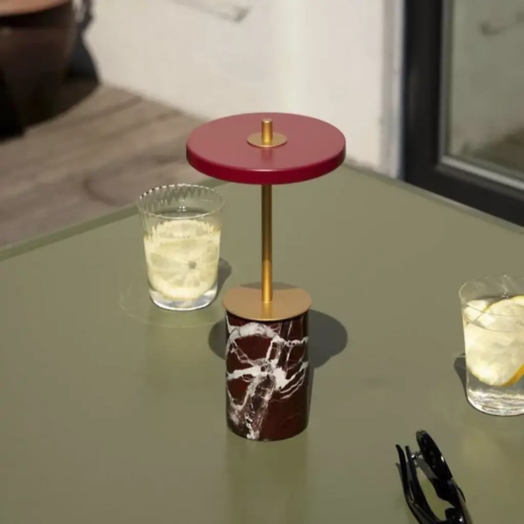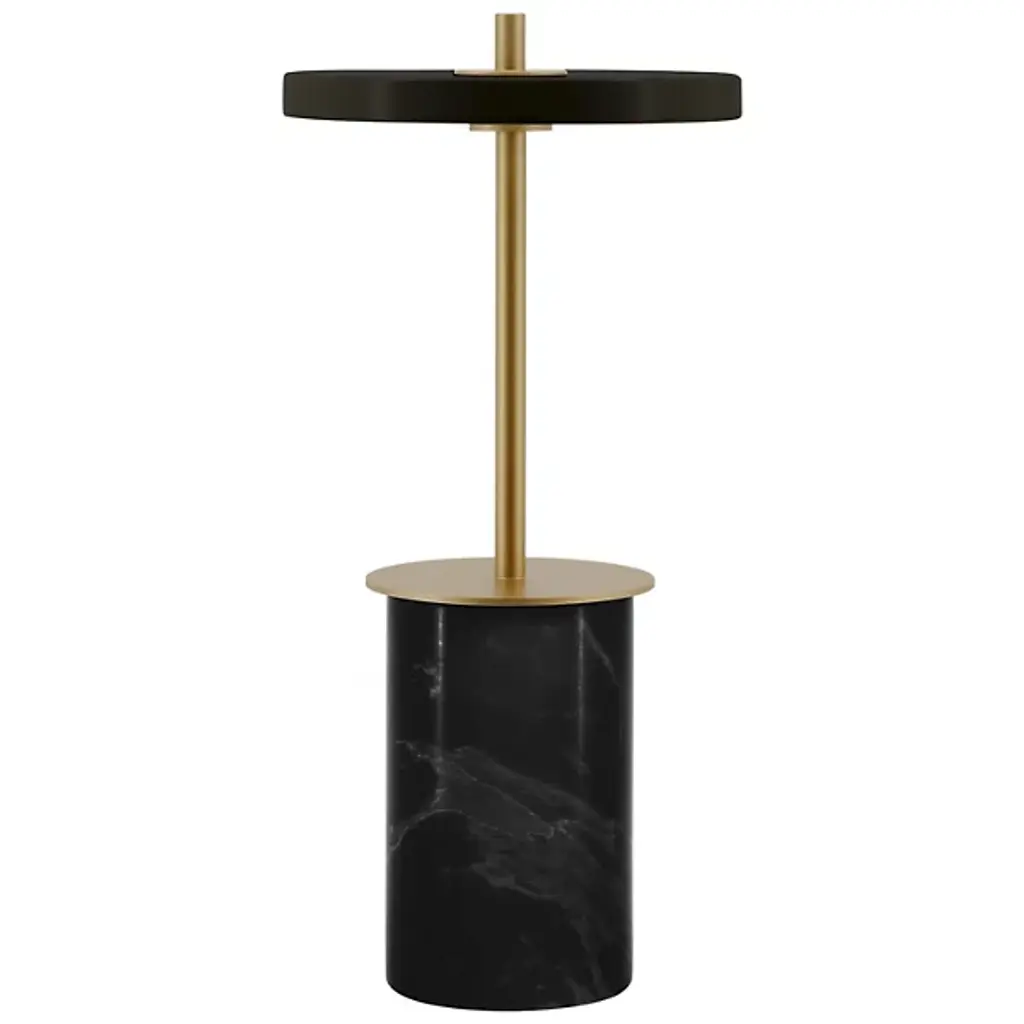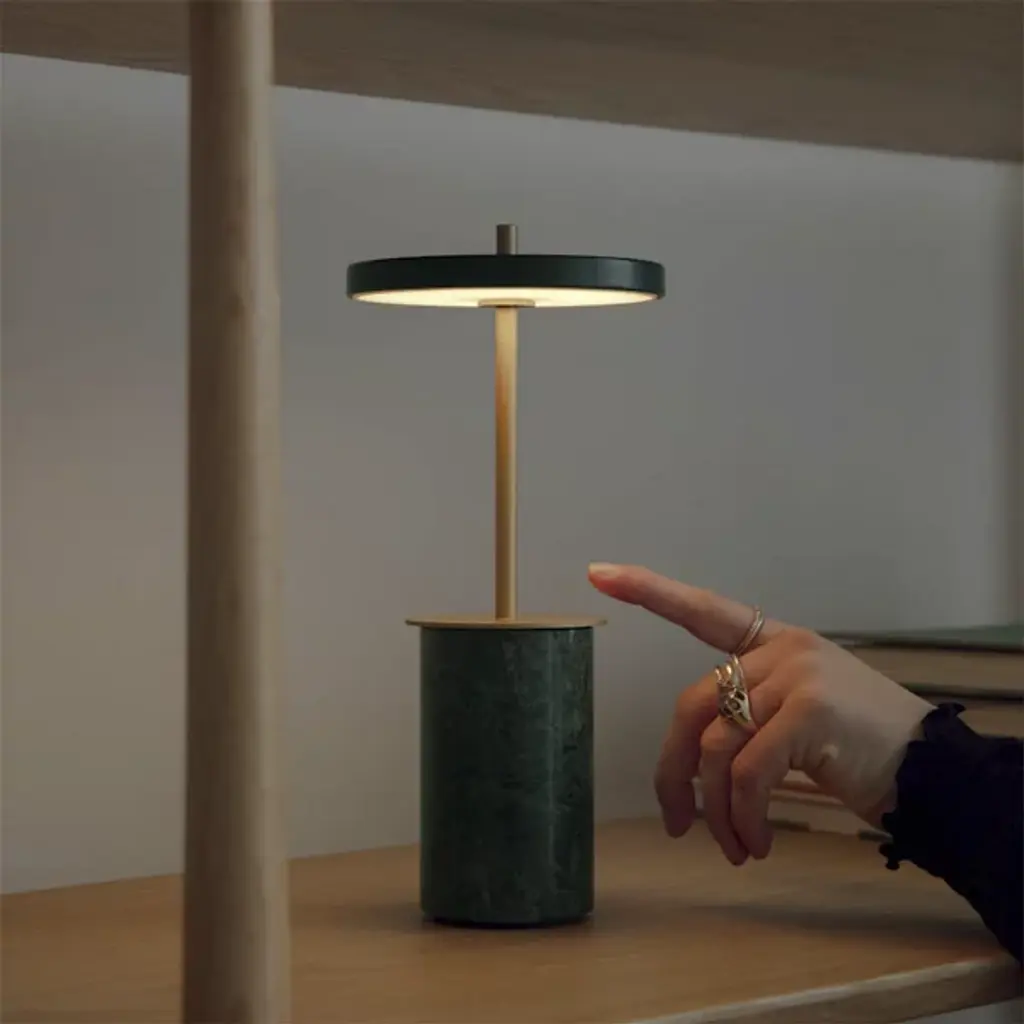 Asteria Move Mini LED Rechargeable Table Lamp offers bright light and luxury on the go, using a layered form to support a small, efficient light. Rich materials add a classic edge to the design created by Soren Ravn Christensen, starting with an interchangeable marble column base that adds unique personality, containing a lithium-ion battery. A slim steel stem ascends from the column, threading through a disc shade with an efficient LED, offering four different levels of intensity via a touch dimmer on the base. The organic marble finish expresses a vibrant character, matching classical elements with a grounded design.