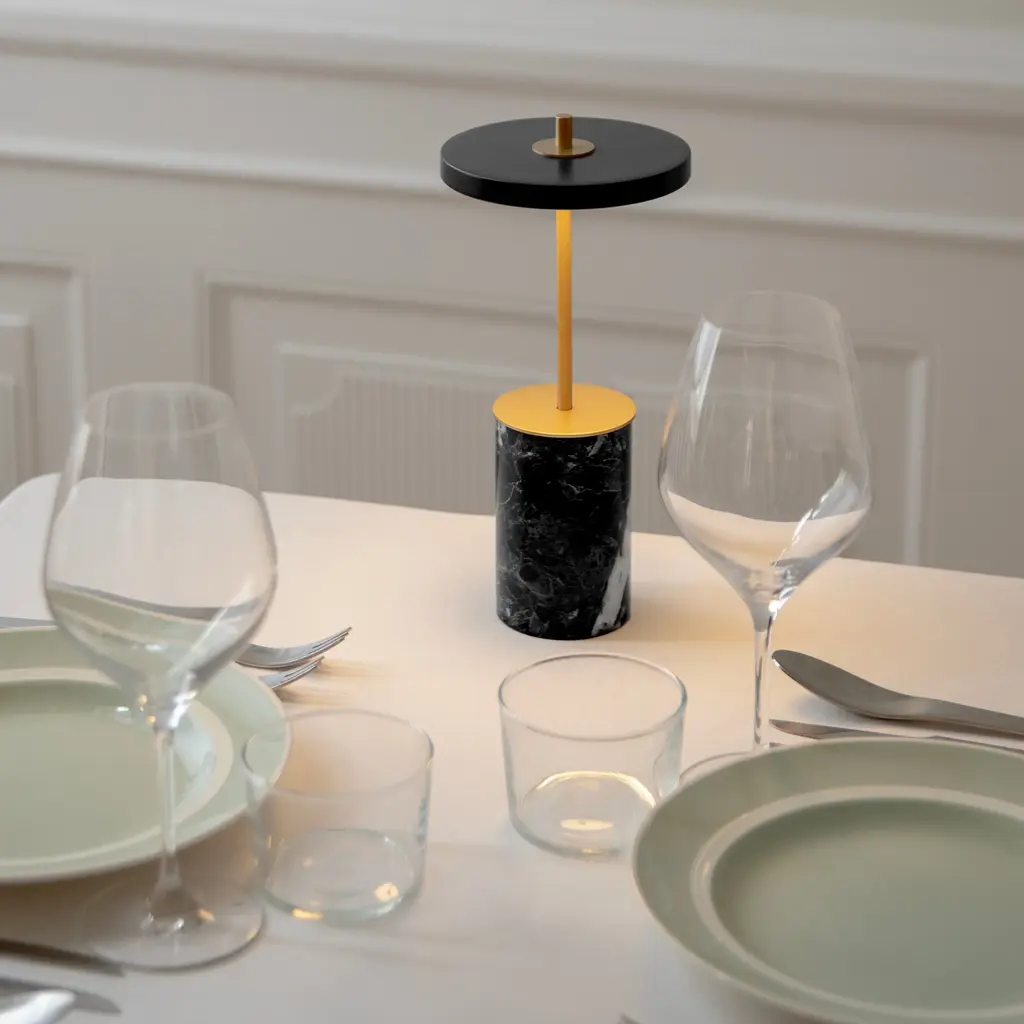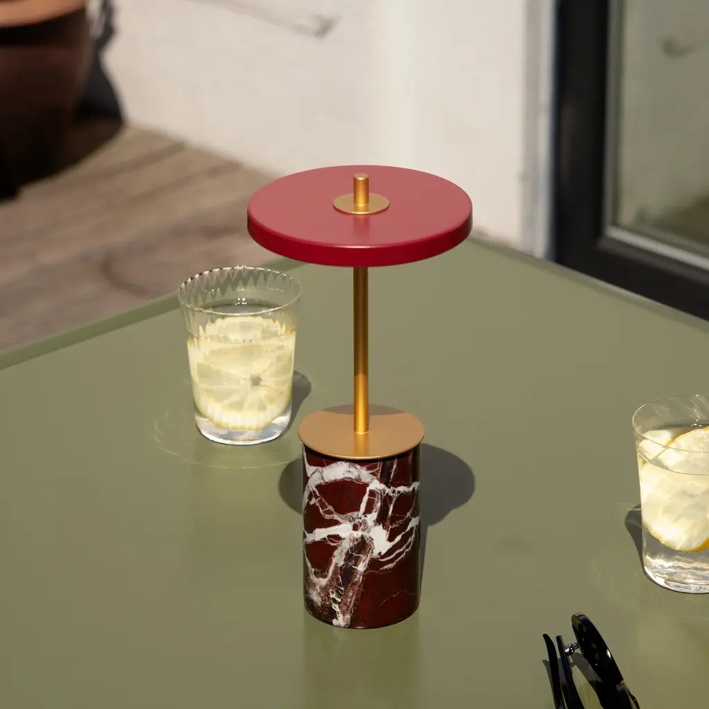 The Asteria Move Mini is a compact, portable lamp crafted to provide ambient lighting for cozy settings. Its clean design pairs with an interchangeable solid marble base, introducing a touch of classic style. The lamp features four adjustable light levels, easily controlled with a simple touch on its base. Charging is effortless—just place the lamp on the included charging plate.