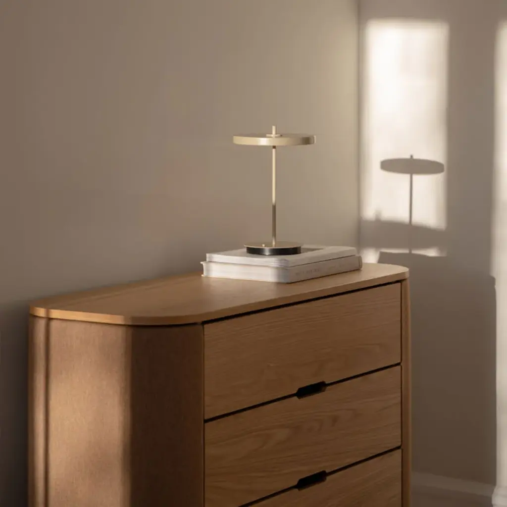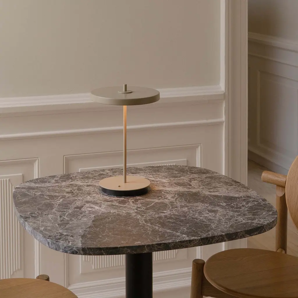 The Asteria Move Monochrome Portable Table Lamp from Umage blends portability with refined design, offering soft, ambient light through its built-in LED panel and diffuser. Featuring four adjustable lighting levels, it adapts effortlessly from focused work to relaxed evenings. Its timeless silhouette complements any interior, adding understated luxury to your living room, kitchen, or bedside. Cord-free and versatile, this lamp ensures elegant illumination wherever you need it, creating the perfect atmosphere with ease and sophistication. Highlights
