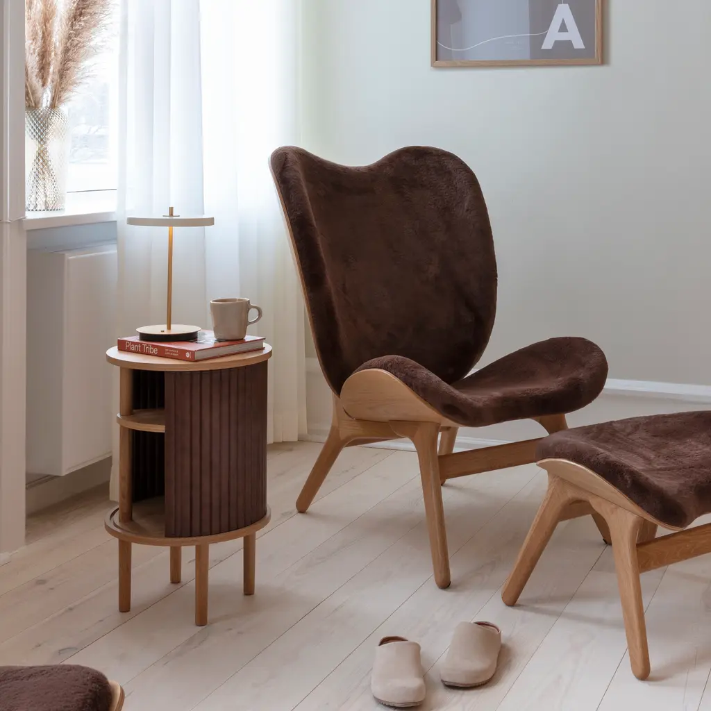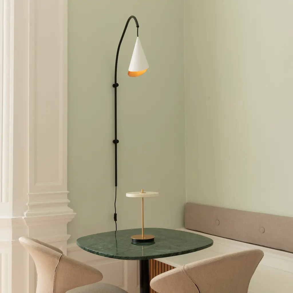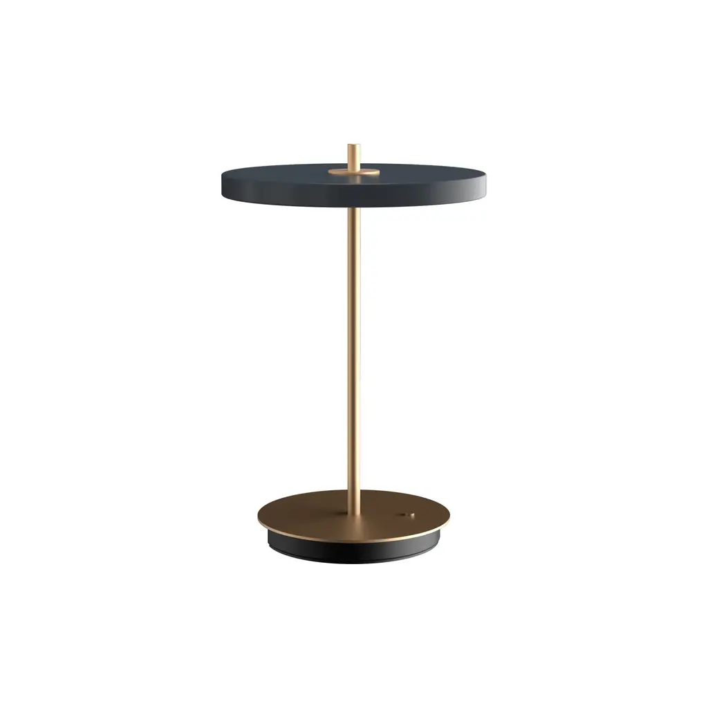The cordless Asteria Move Portable Lamp features a built-in custom LED light with a soft white diffuser, ensuring glare-free illumination. Crafted from aluminum with a brass stem, the lamp has four adjustable light intensity levels to suit various needs. Its battery lasts up to 35 hours and charges easily via any Qi charging unit or the included USB cable. Available in 11 colors, the Asteria Move's compact size and portability provide versatile lighting for any location.